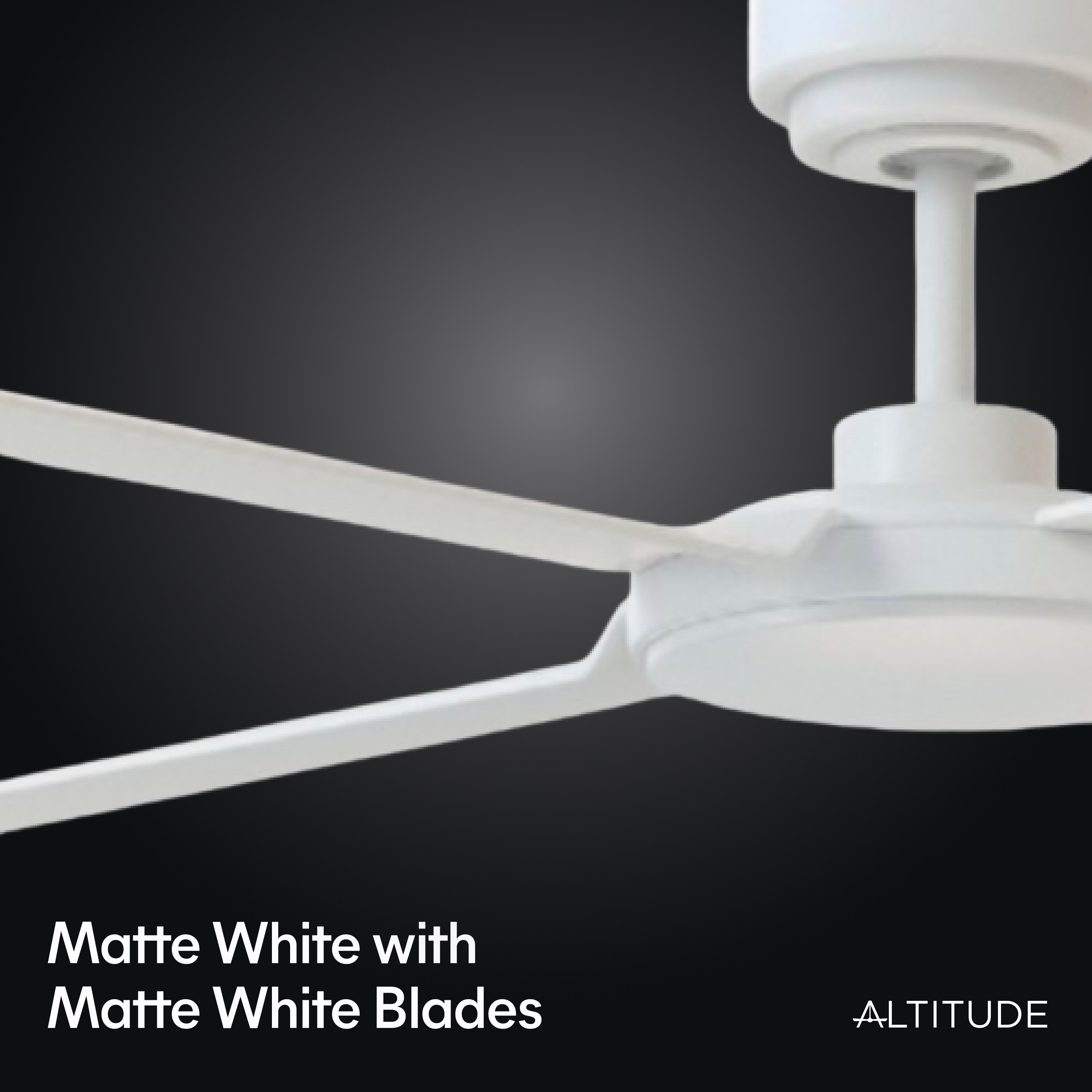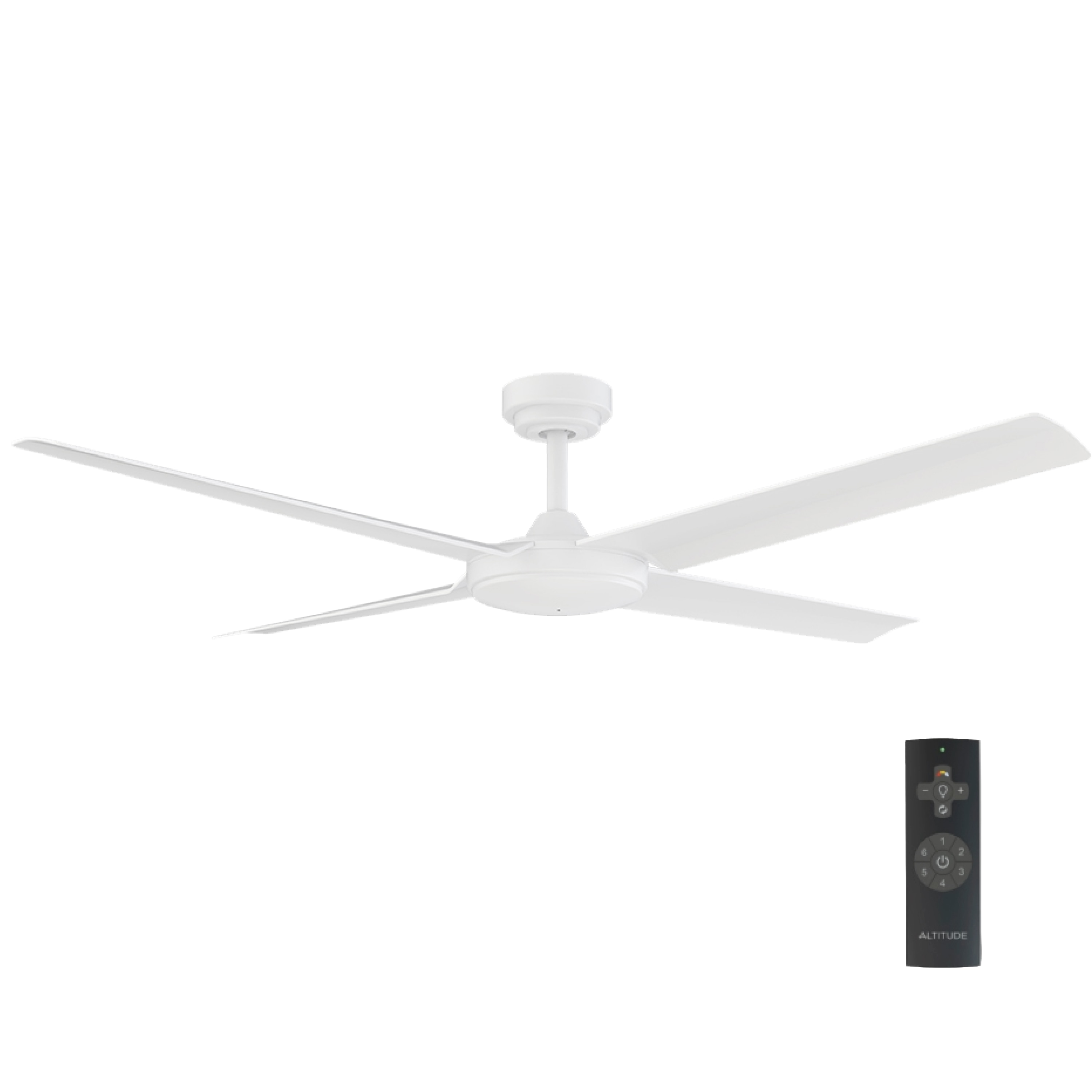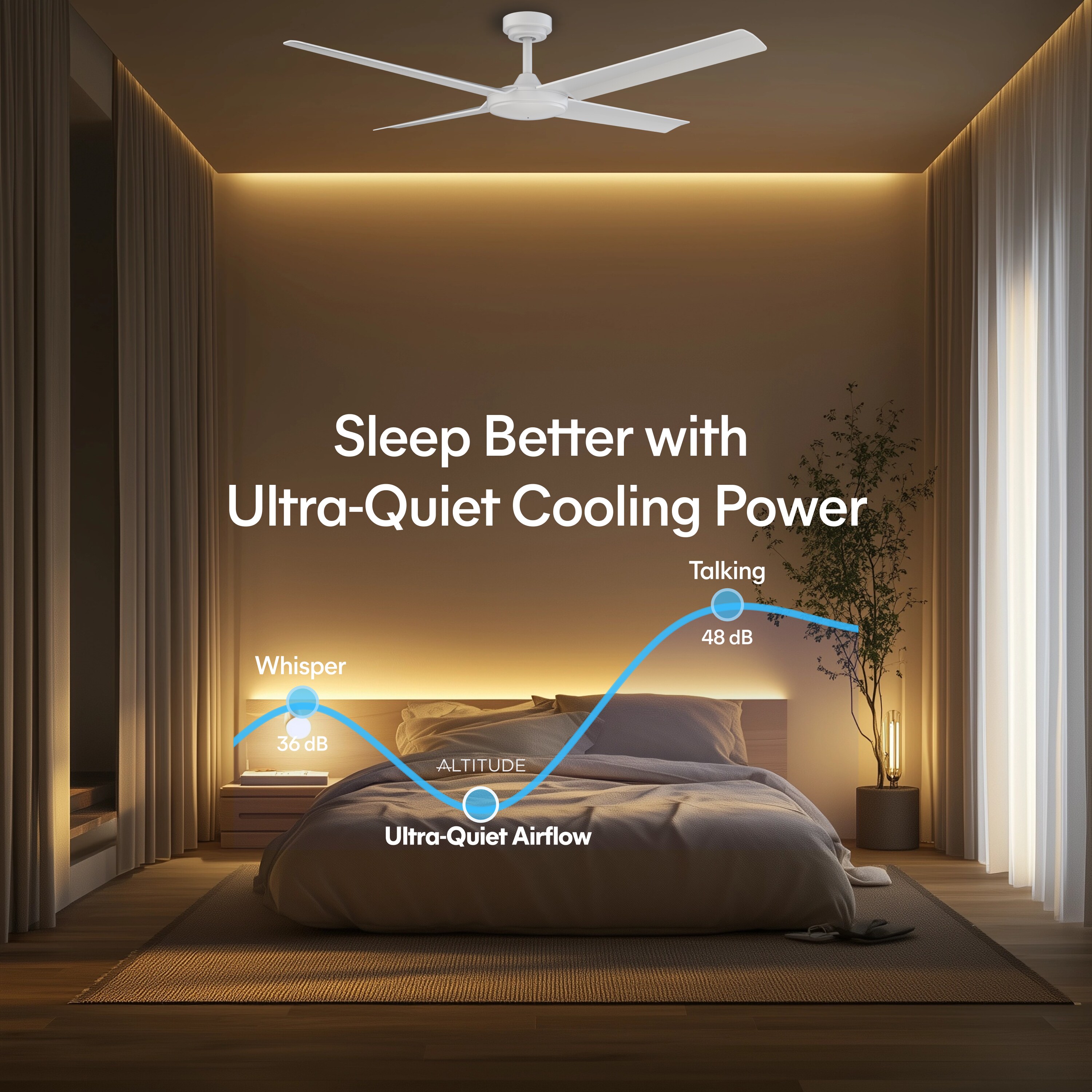 The Altitude ceiling fan combines clean transitional design with a matte white finish, perfect for both indoor and outdoor settings. Equipped with a remote control for effortless operation, this 4-blade ceiling fan features a Whisper Silence DC motor that ensures quiet, energy-efficient performance. With 6 speeds and a reverse function, it delivers optimal airflow of up to 6016 cubic feet per minute, ensuring year-round comfort.