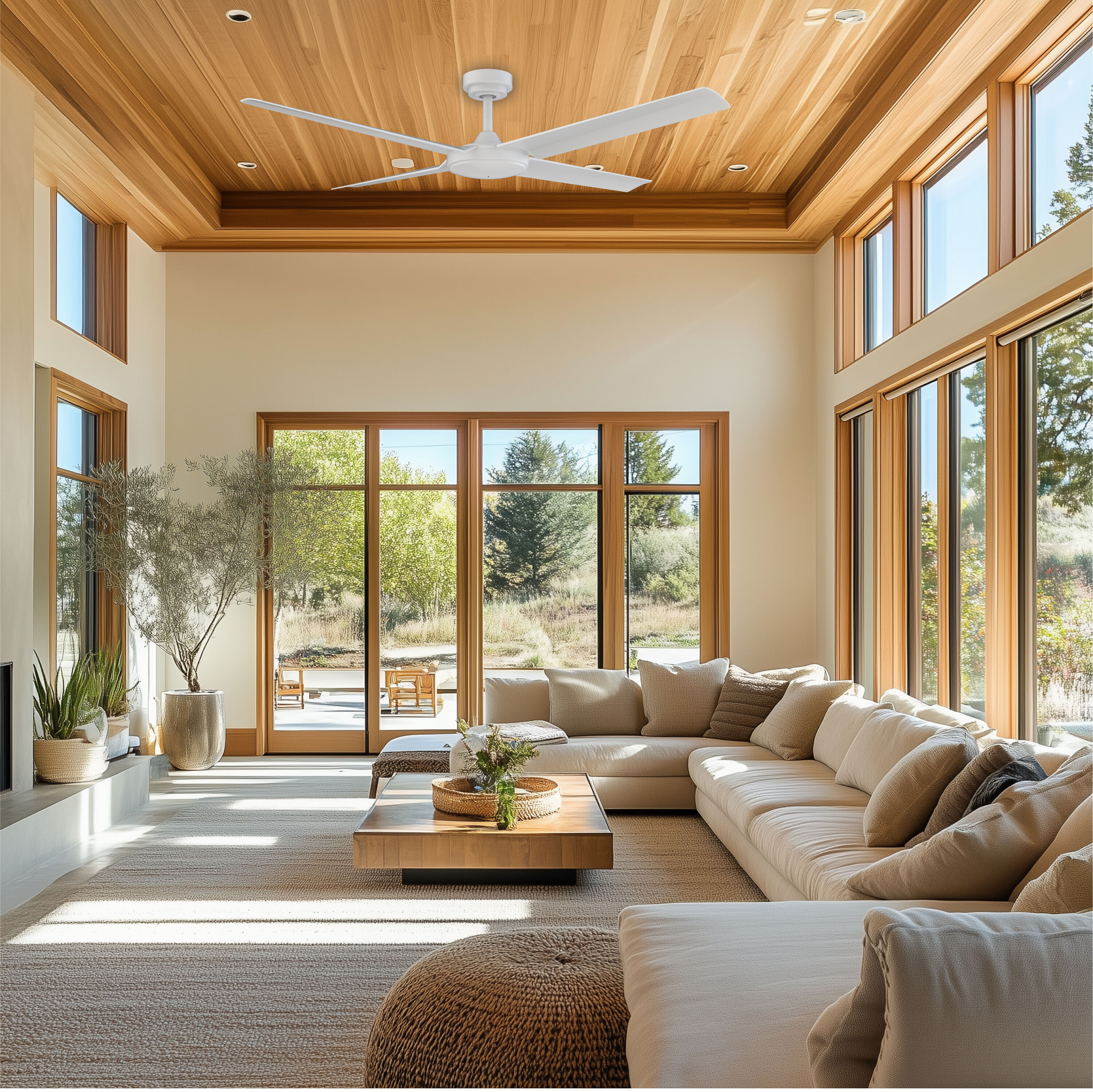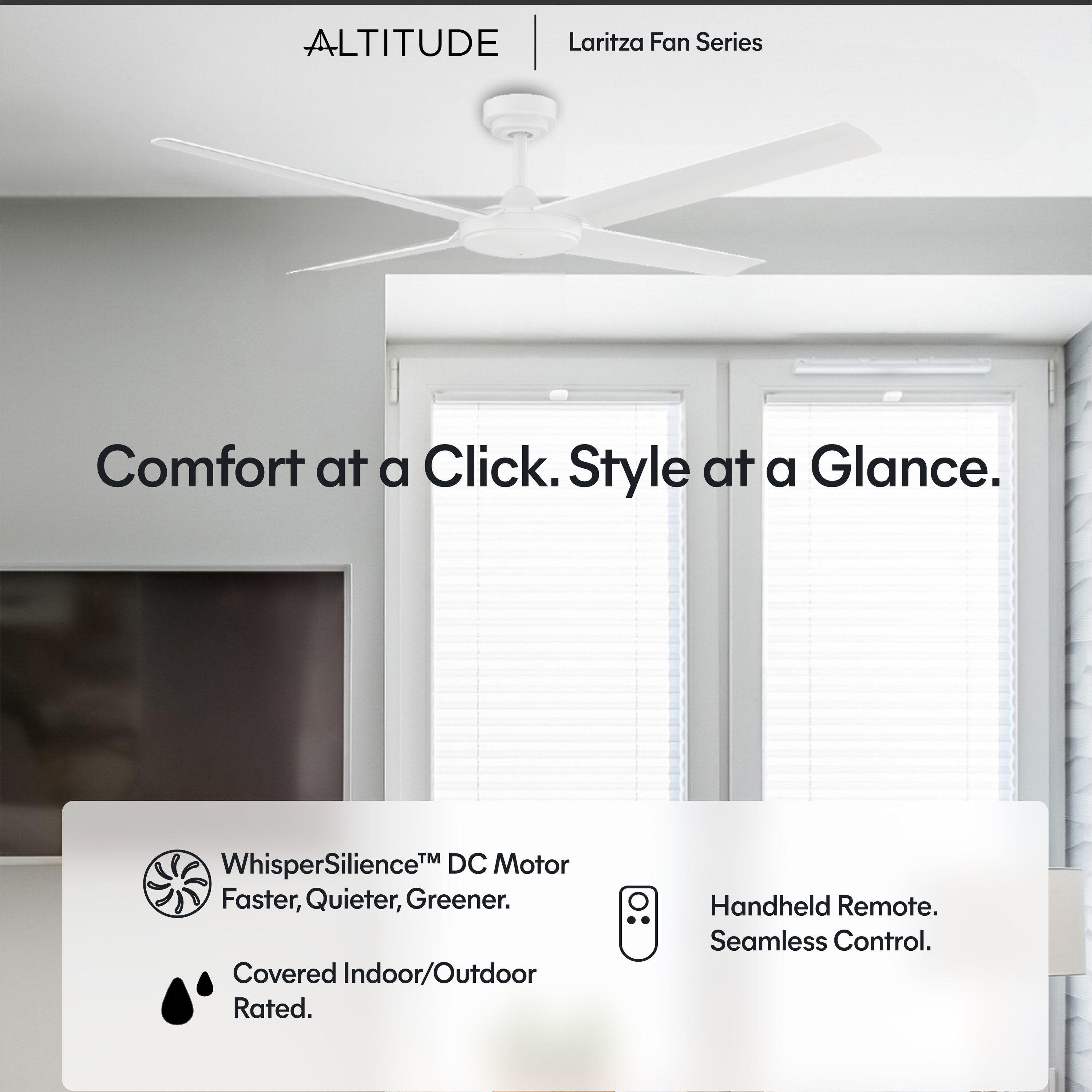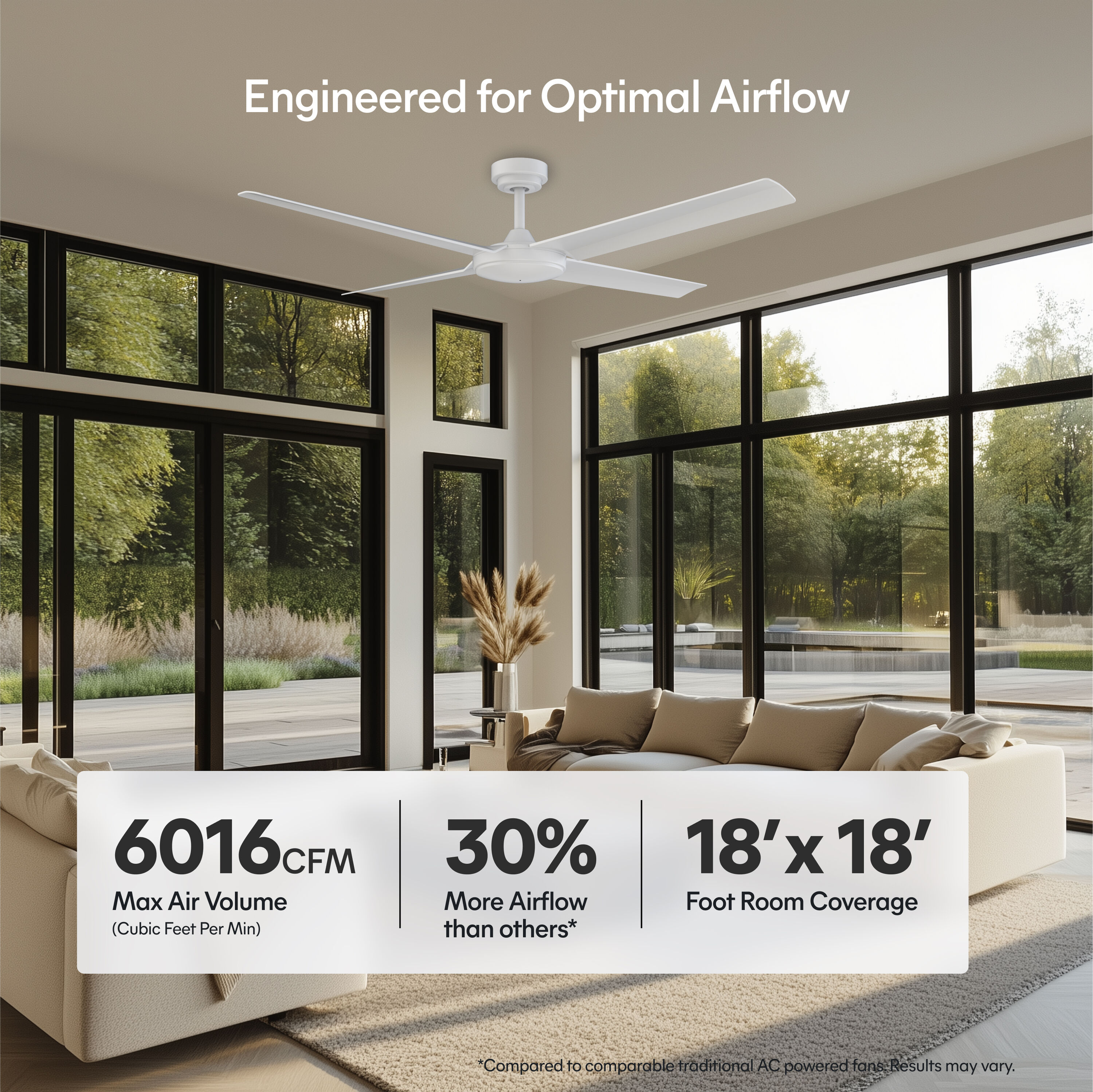 The Altitude ceiling fan combines clean transitional design with a matte white finish, perfect for both indoor and outdoor settings. Equipped with a remote control for effortless operation, this 4-blade ceiling fan features a Whisper Silence DC motor that ensures quiet, energy-efficient performance. With 6 speeds and a reverse function, it delivers optimal airflow of up to 6016 cubic feet per minute, ensuring year-round comfort.
