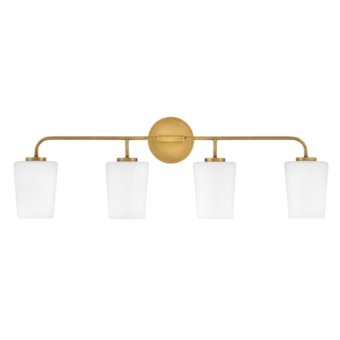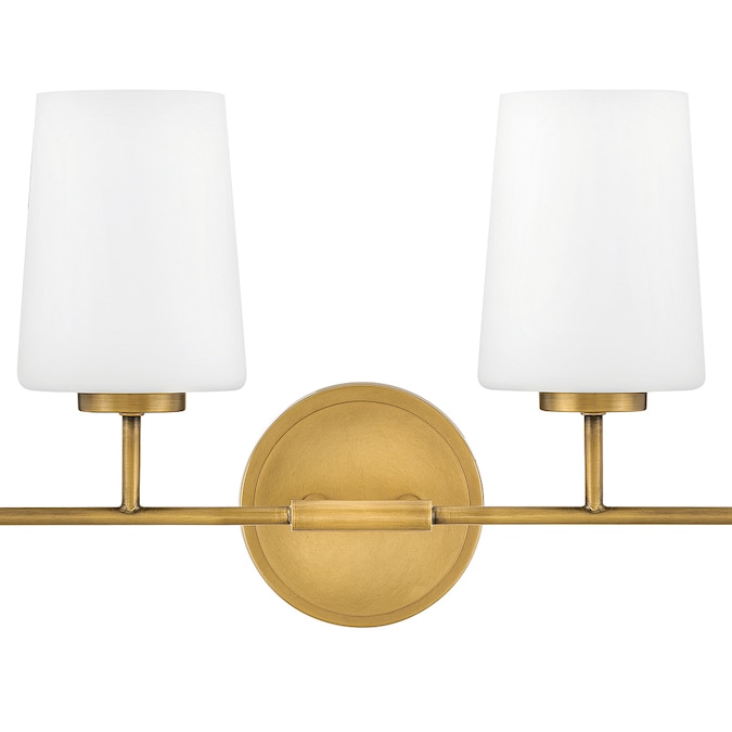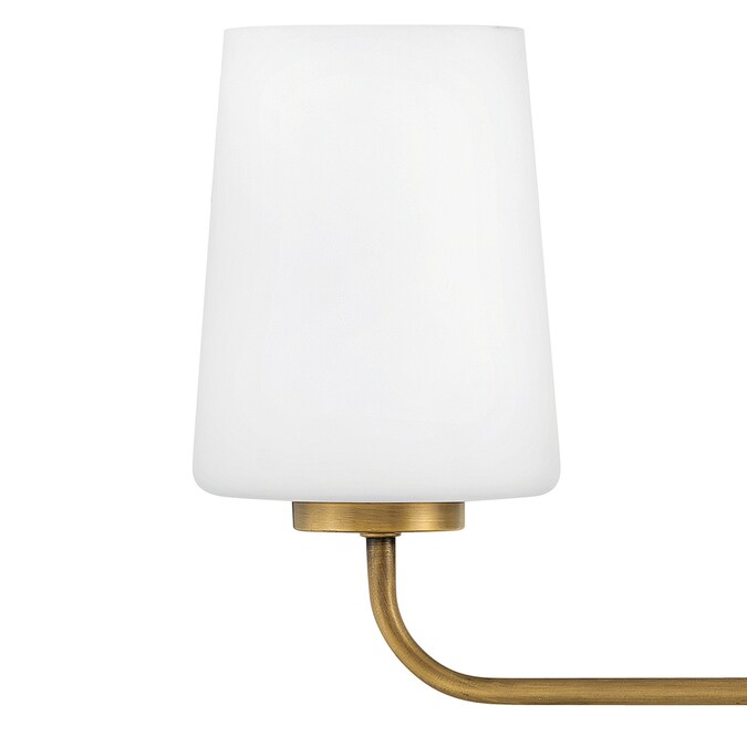 - Features slender elongated arms which unite with etched opal glass shades in a luxe Heritage Brass finish