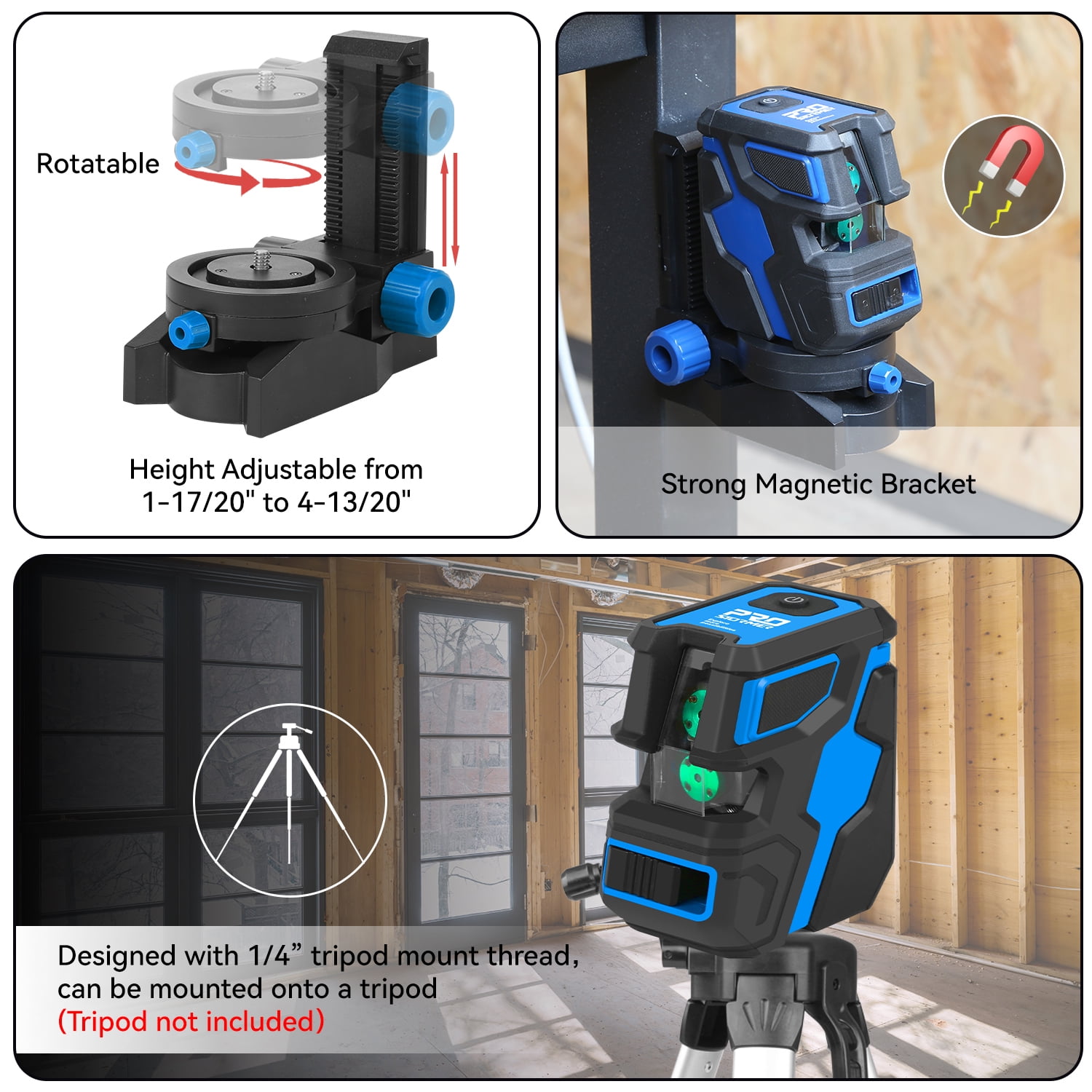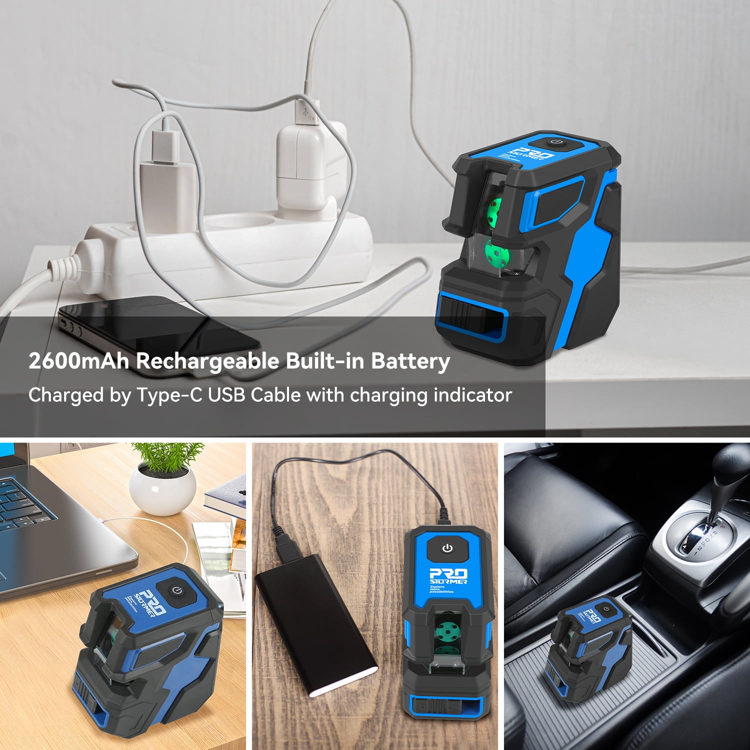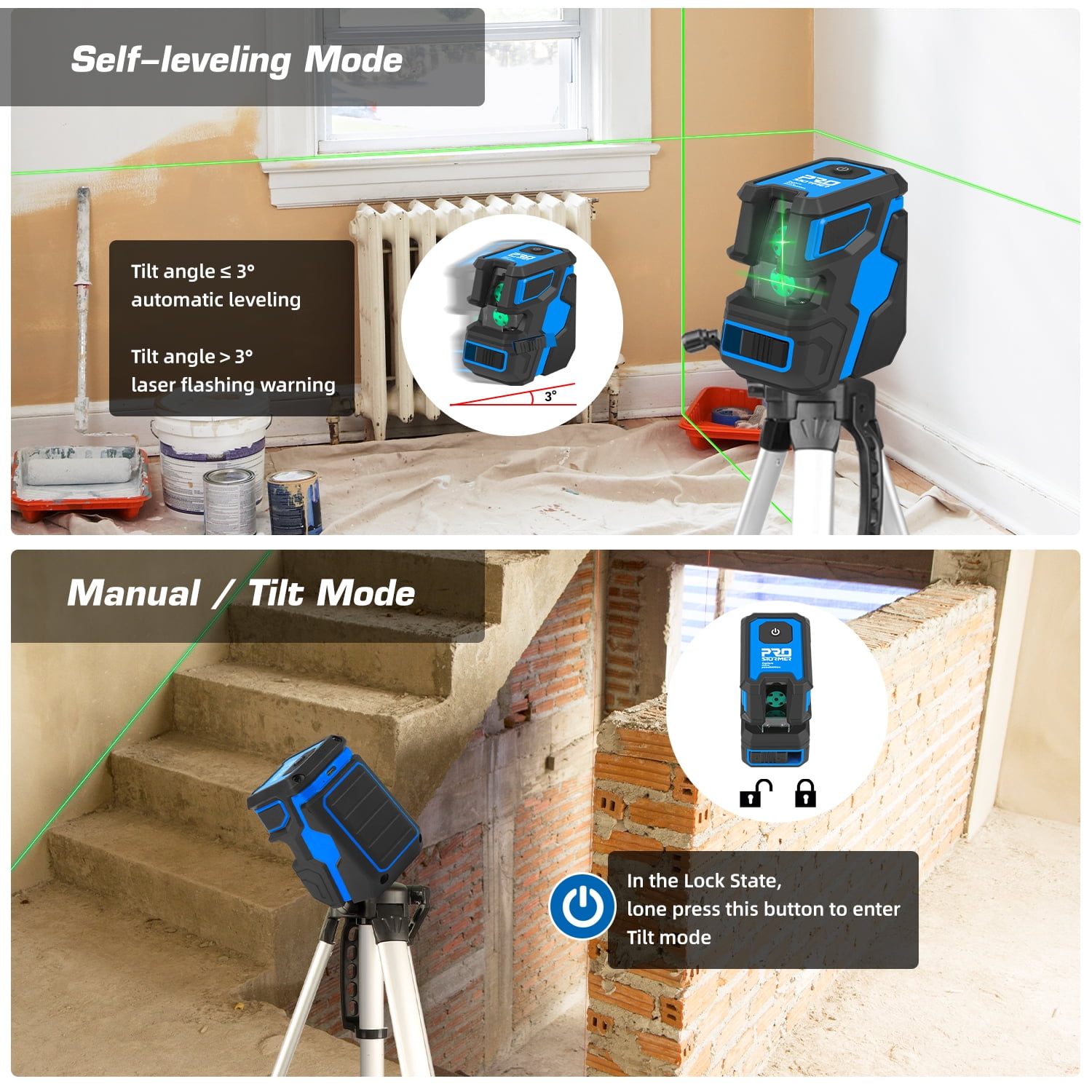 [High Visibility & Accuracy] – This laser level is designed with green laser beam, which is 2 times brighter than the traditional red laser beam. With an accuracy of 1/10 of an inch at 33 feet, the green lines provide a working distance of up to 50 feet. [Self-Leveling and Tilt Mode] – In unlocked state, this laser level can be self-leveling within 3°and indicate by flashing for tilting angle over 3°. In locked state, long press Top Button on the device to enter tilt mode, you can use the device at any angle to meet your different needs. [360° Adjustable Magnetic Stand] – This set comes with a strong adjustable magnetic stand, can be attached to metal surfaces and turn the laser level around at 360°. In addition, height of the stand is adjustable from 1-17/20″ to 4-13/20″. The laser tool also has 1/4″-20 mounting thread, can be fixed on a tripod. [Durable Design & Wide Application] – Made of ABS plastic and soft rubber, it features compact size, portable design and IP54 water/dust-proof for working well even under hazardous working conditions. It’s ideal for hanging pictures, laying tiles, installing photos, wallpapering work, construction and furniture installation, etc. [What You Get] – 1 x Prostormer Cross-line Laser Level with Built-in 2600mAh Rechargeable Battery, 1 x Adjustable Magnetic Stand, 1 x Type-C USB Charging Cable, 1 x Storage Bag, 1 x User Manual. Technical Specifications: Type: Green Cross Laser Lines Laser Class: Class 2, <1mW power output Laser Wavelength: 515nm Self Leveling Range: ±3° Accuracy: ±2.5mm/10m Working Distance: Indoor 15m (50 feet) Power Supply: 2600mAh Lithium Battery Mount Size: 1/4" Mount Thread IP Rating: IP54 Operation Temperature: -10℃ – +45℃ Note: 1. Please do not look directly at the laser line. 2. Please avoid using it in bright sunlight to avoid affecting measurement accuracy.