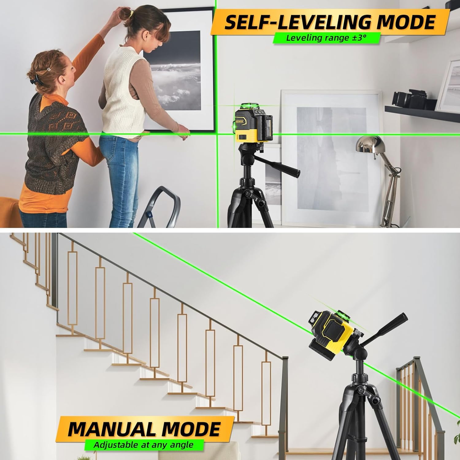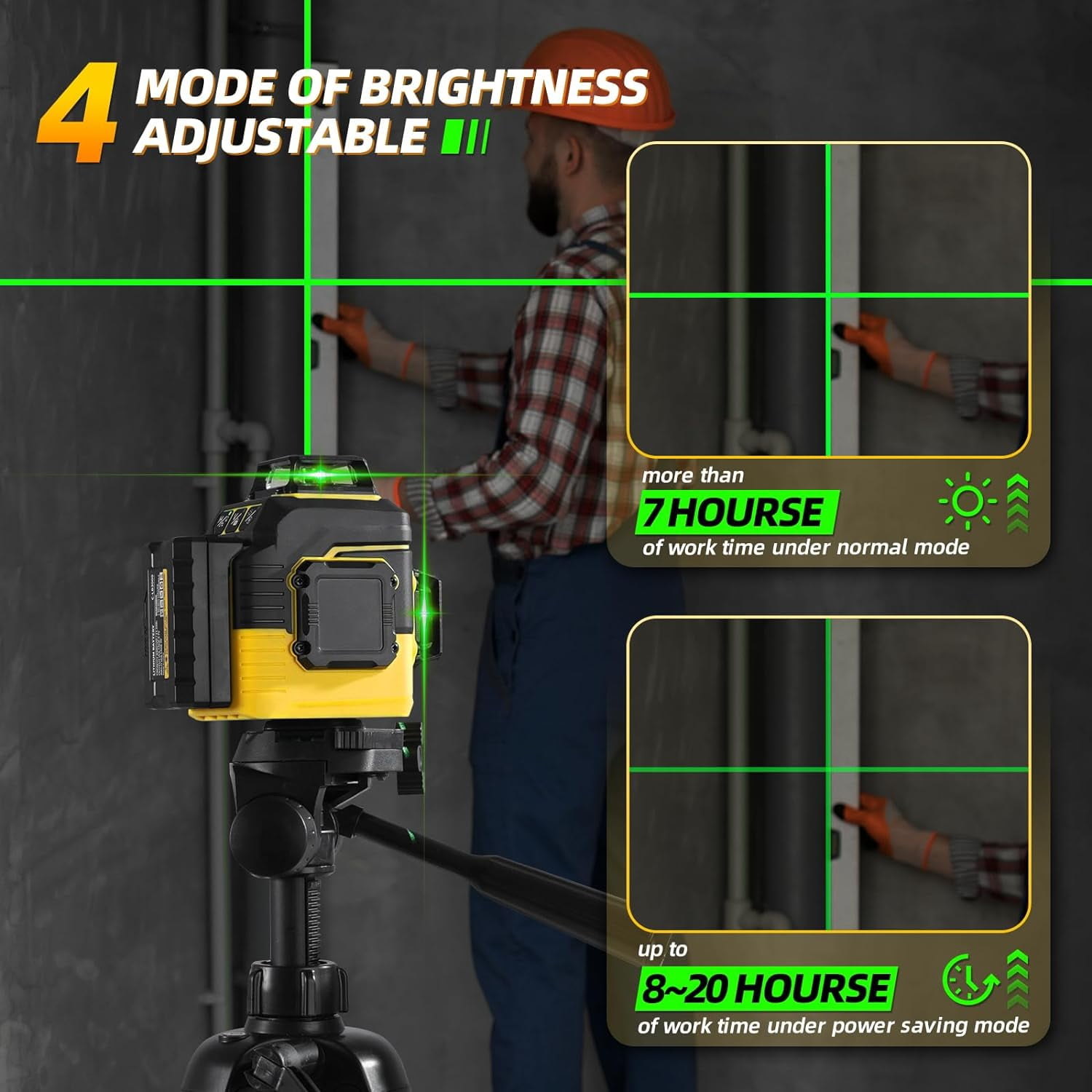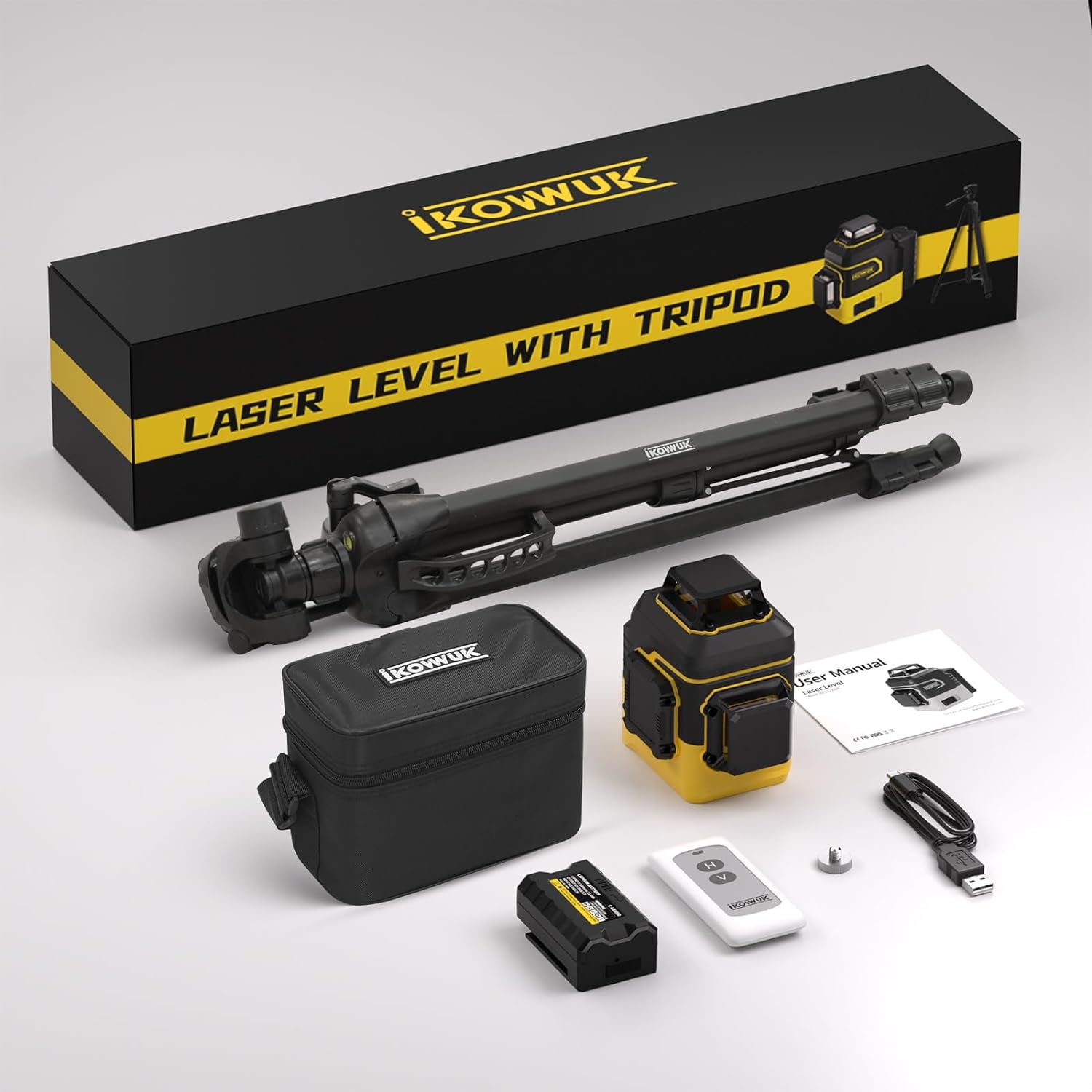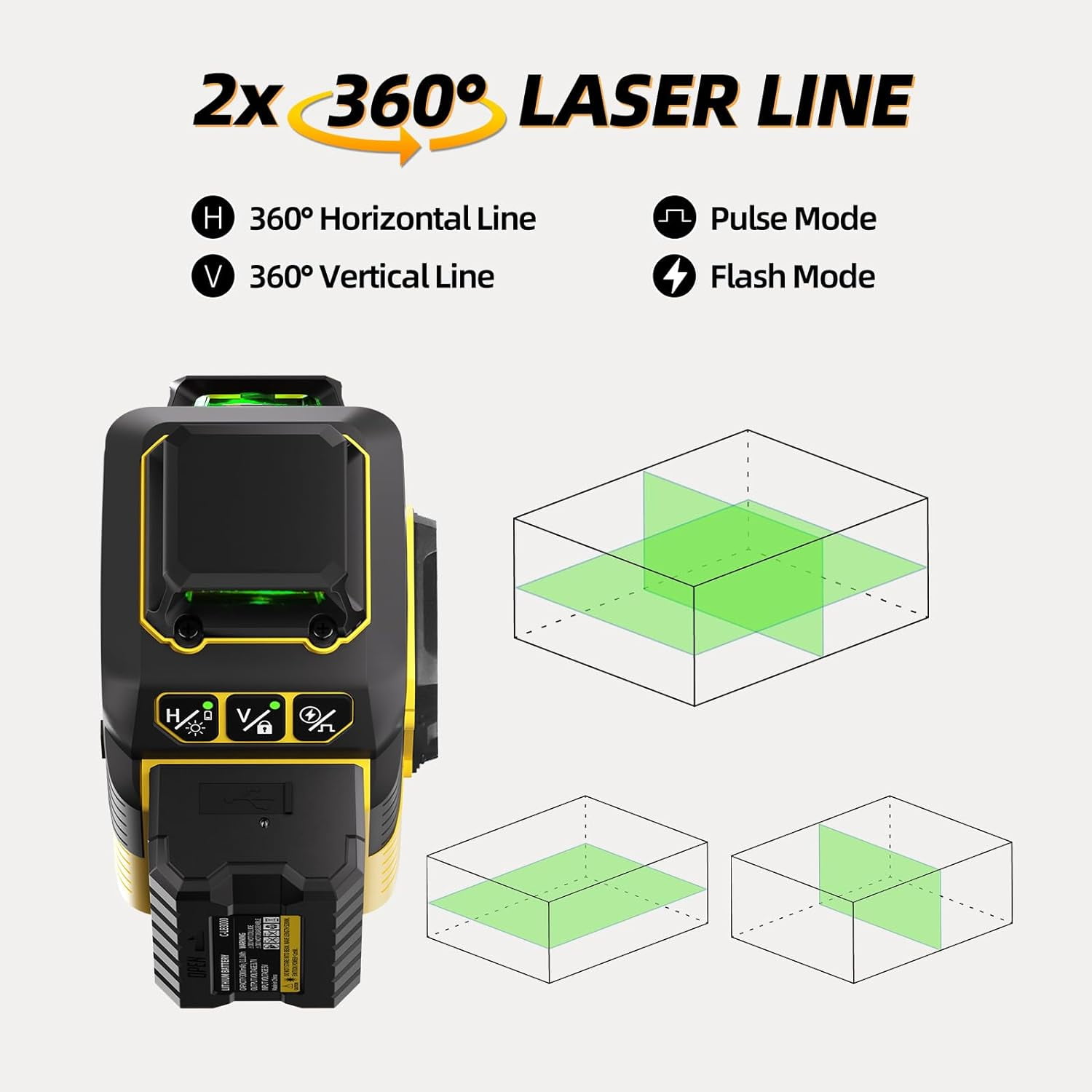 【2X360° Lasers Sources】 1×360° horizontal line & 1×360° vertical line cover all around the room. “H” stands for horizontal laser, “V” stands for vertical laser, 360° horizontal line and vertical line can be projected separately or together to meet your different needs in various scenarios. Safety Class II, power output <1mW. 【Remote Control】 The iKOVWUK laser level is equipped with a remote control function, you can control the level line from a distance without returning to the operation, improving work efficiency. The remote control distance can reach 16ft, it can be controlled even through walls. 【USB Type-C Rechargeable】 The 8-line laser level uses USB type-c interface for charging, which can achieve fast and convenient charging. The battery is removable and replaceable to avoid the trouble of the machine running out of power. (Note: It can connect to power bank) 【Bonus Compact Laser Tripod】 The tripod is made of thickened and widened aluminum alloy material, stable and durable. It can reach 65.7 inches when fully unfolded, and the flip lock design allows height adjustment arbitrarily. Measures only 25.6 inches when collapsed for easy storage. In addition to the regular 1/4" quick release plate, a 5/8" adapter is included, you can install and remove the laser level in seconds. 【Self / Manual Leveling & Pulse Mode】 The laser level will auto enter self-leveling mode after turning on the power, the cross line laser will be automatically leveled within ±3°, otherwise it will send out an alarm and keep flashing. Keep the power off, long press the “V” button for 3s to enter manual mode, which can be placed at any angle for use. Long press and hold the "H" button for 3s to enter pulse mode, the pulse distance can reach 200 ft. ("Flash" mode helps identify outdoor laser lines) 【Power-Saving Mode】 4 levels of adjustable brightness, users can adjust the brightness of the laser line according to different usage environments. At minimum brightness, the laser can continue to work for up to 20 hours, at maximum brightness, the working time is 7 hours. Green laser is 3 times brighter than red laser with the same light source.