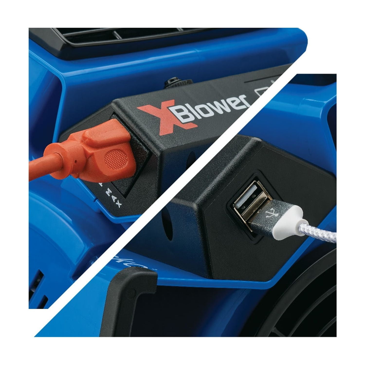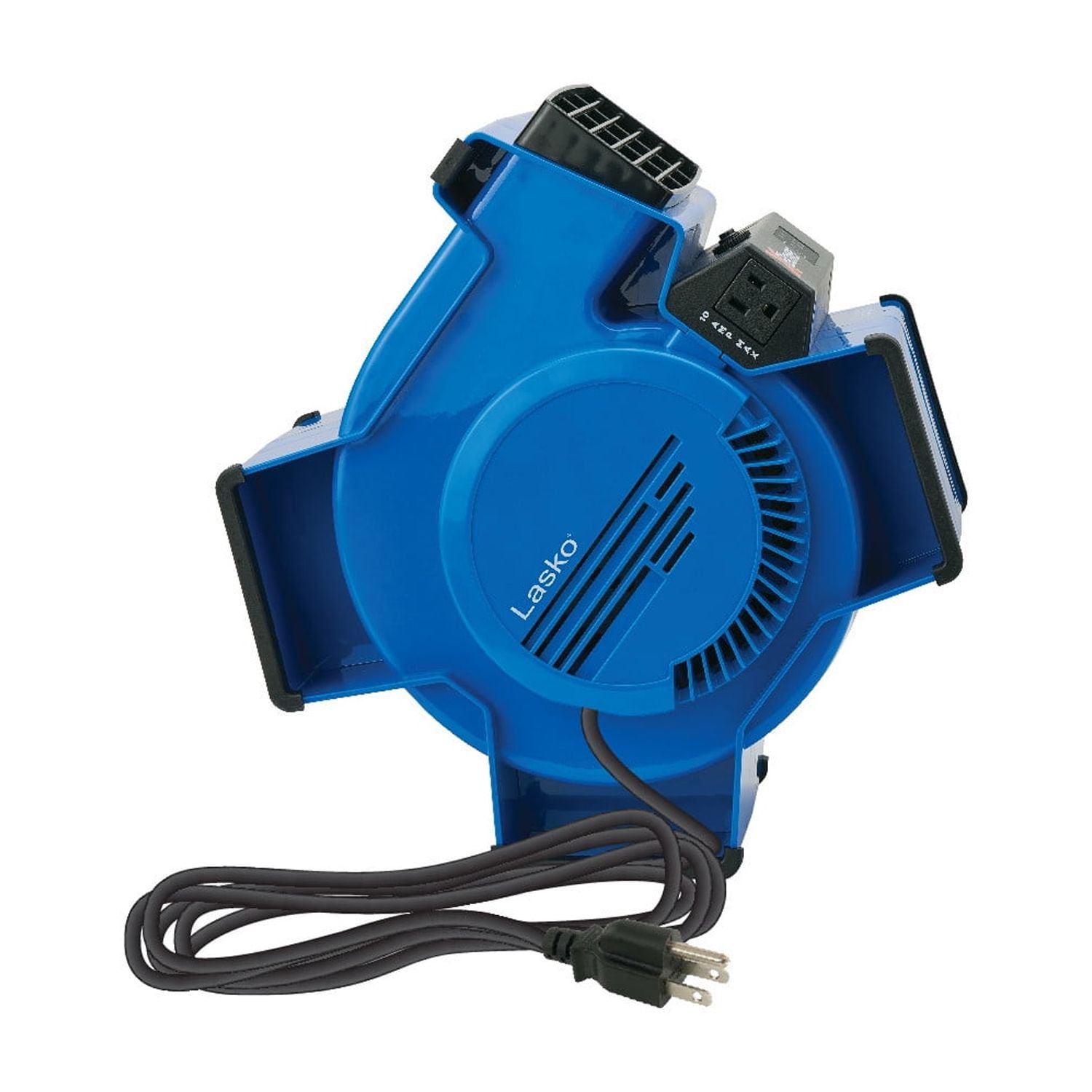 With its rugged construction and stable design, the X-Blower Multi-Position Utility Blower Fan from Lasko is perfect for use in your garage, workshop, basement, kitchen, and more. Choose from 6 positions to direct the high-velocity air stream where you need it most for cooling, ventilating, exhausting, and drying. Choose from 3 powerful speeds with easy-to-use electronic controls. Comes equipped with a circuit breaker with reset button and a 3-prong grounded plug. Charge your mobile devices while you work with 2 convenient USB ports. Plus, a built-in 120-volt outlet allows you to plug in additional fans, etc. so you can get work accomplished quickly and easily. Move this utility fan from place-to-place with the easy-grip handle. Comes fully assembled.