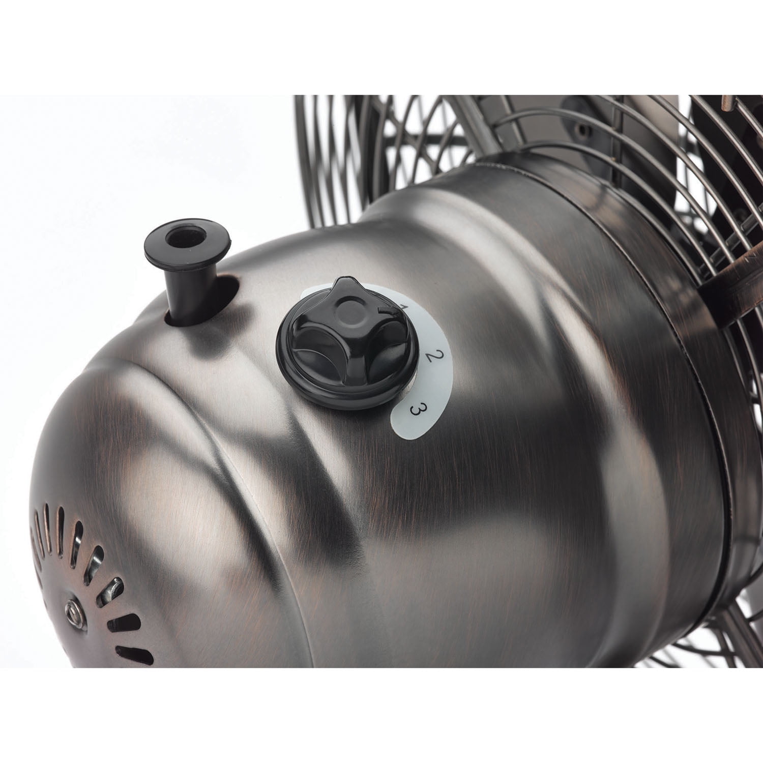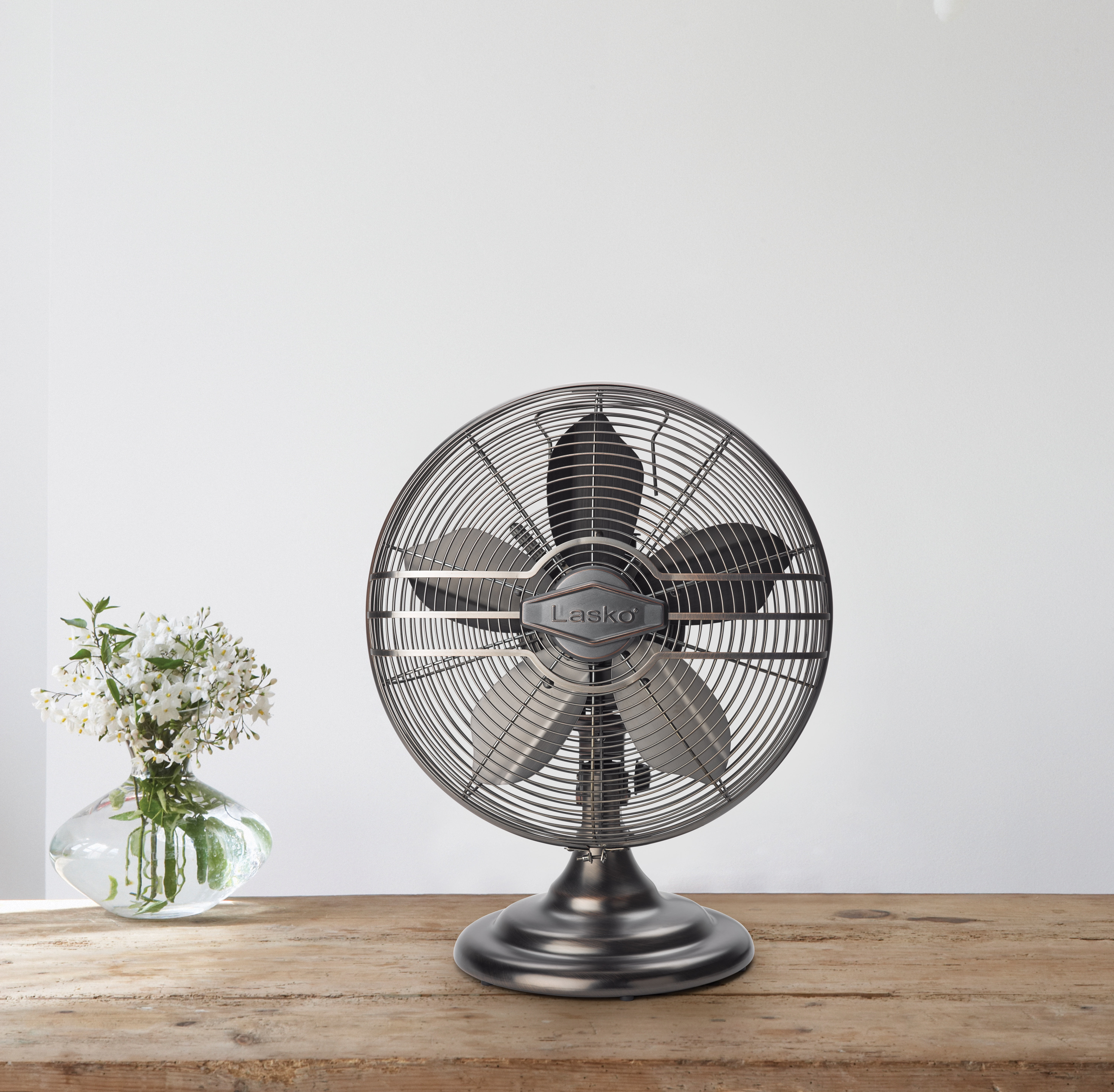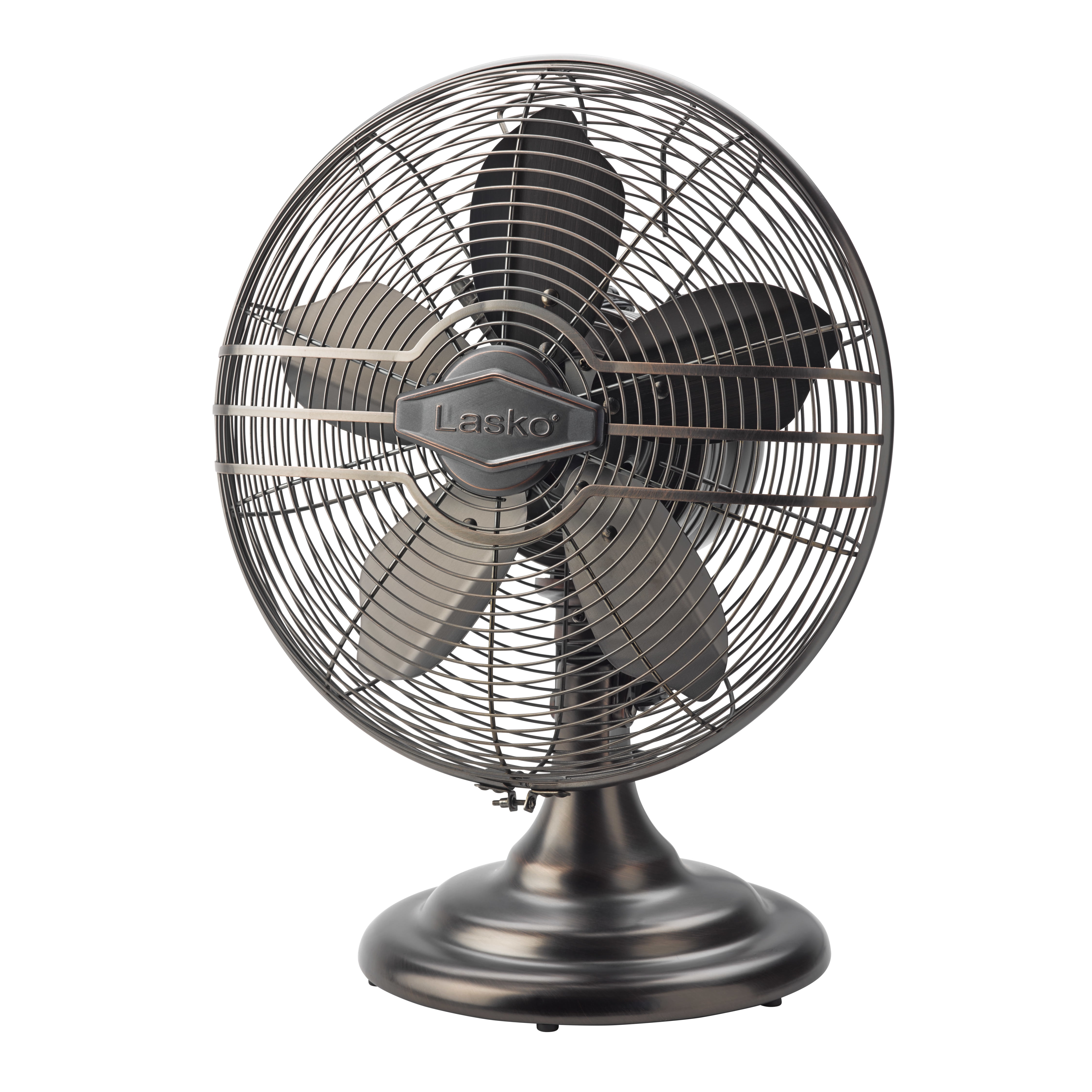 12-inch classic table fan oil-rubbed bronze finish blends into existing decor Enjoy 3 quiet speed settings to customize your airflow and comfort level The tilt-back fan head allows you to direct the airflow exactly where you need it The 12-inch blade with 3 paddles provides powerful and widespread oscillation to circulate air throughout the room Features a built-in carry handle for easy portability from room to room Equipped with a Lasko trusted, fused safety plug for added peace of mind Comes fully assembled and ready to use out of the box Non-skid pads on base keep fan firmly in place This table fan is perfect for desks, tabletops, bedrooms, living rooms, and offices This table fan is a reliable and durable addition to your home
