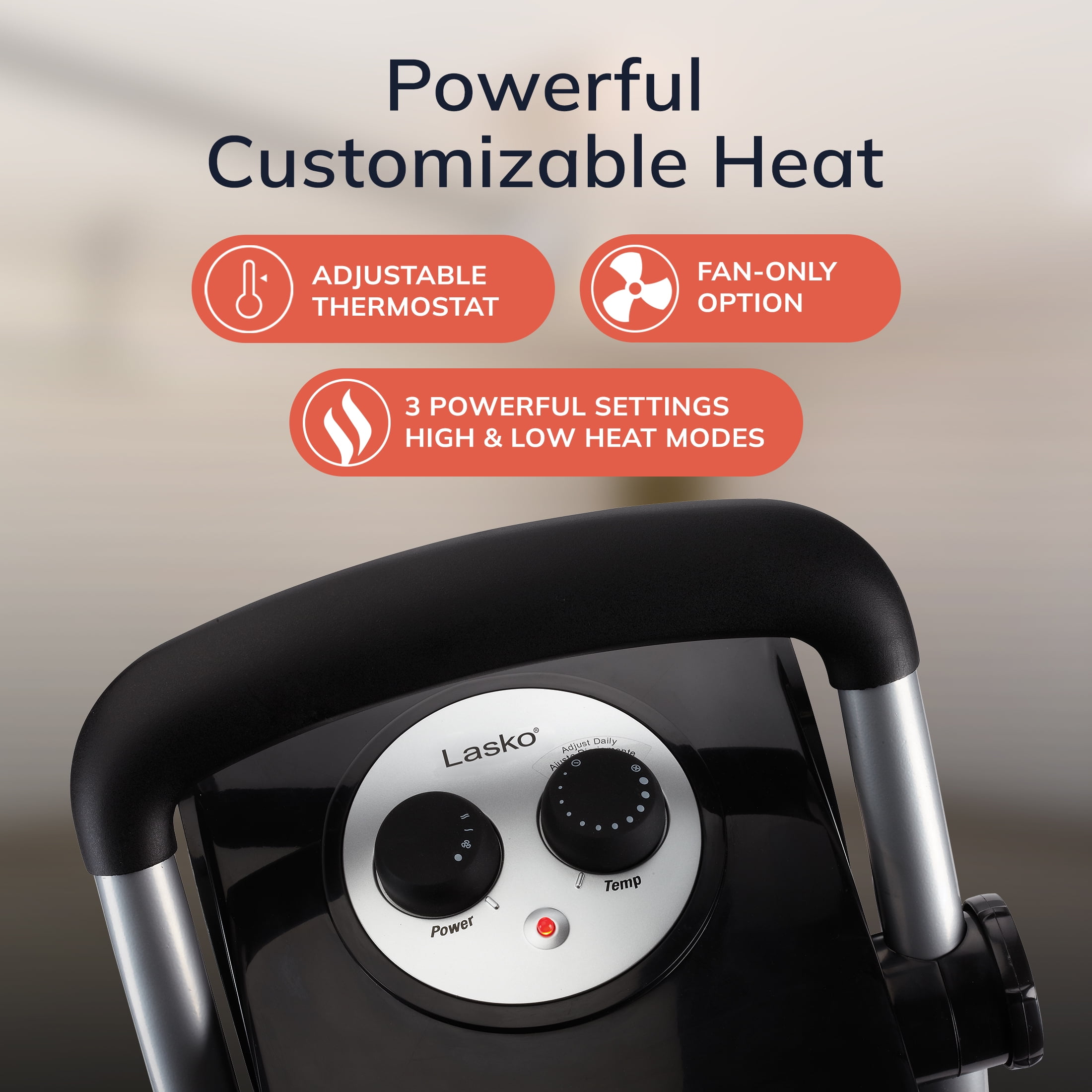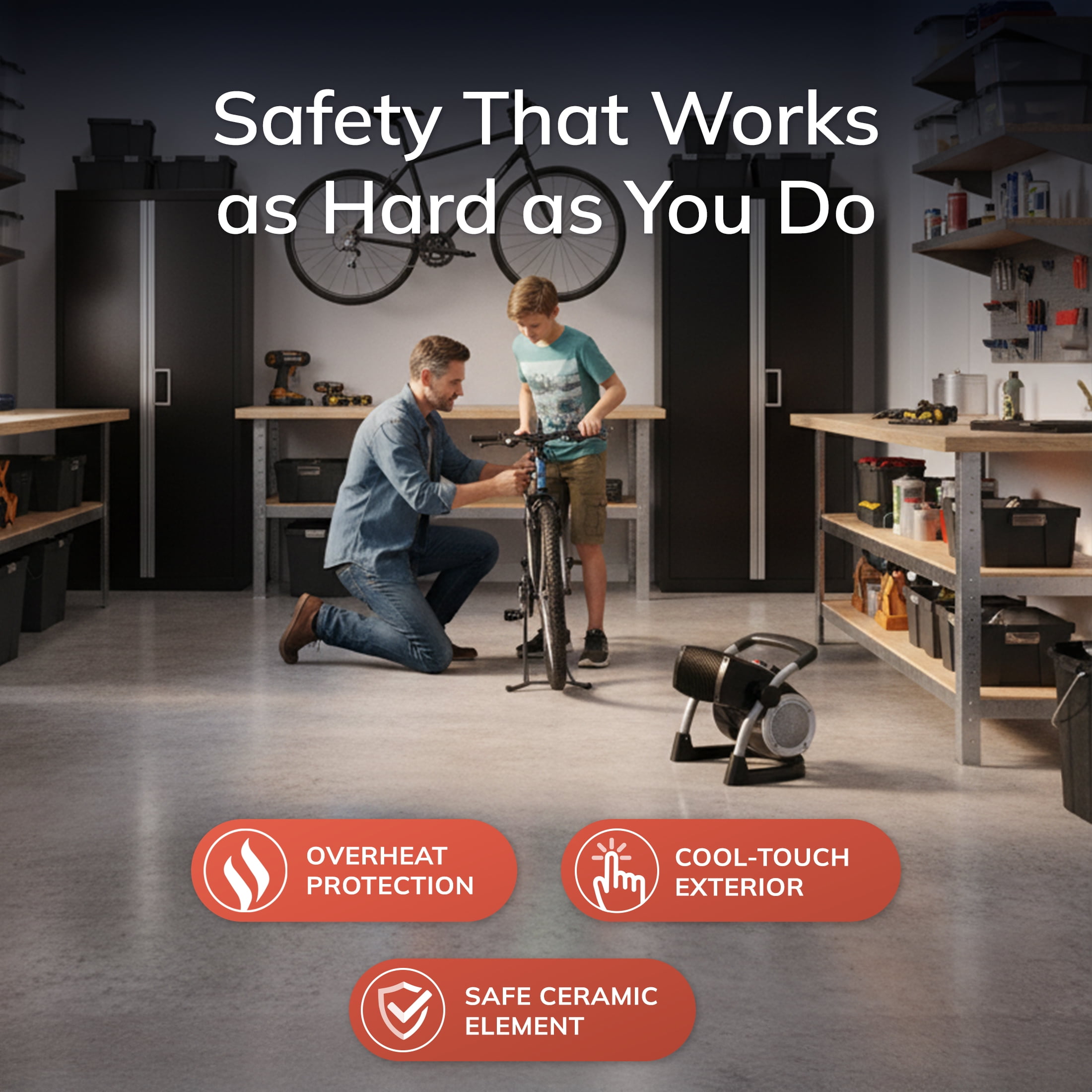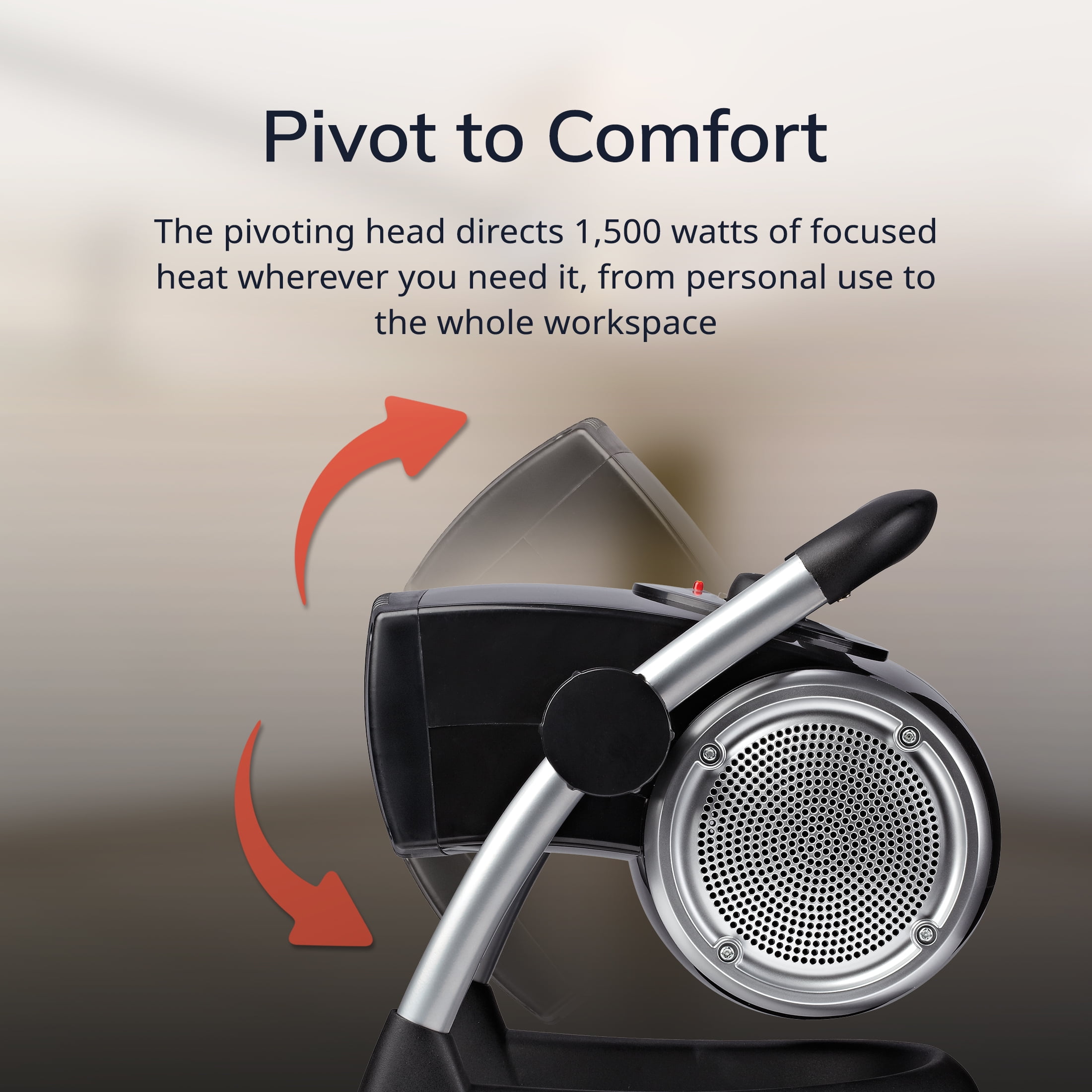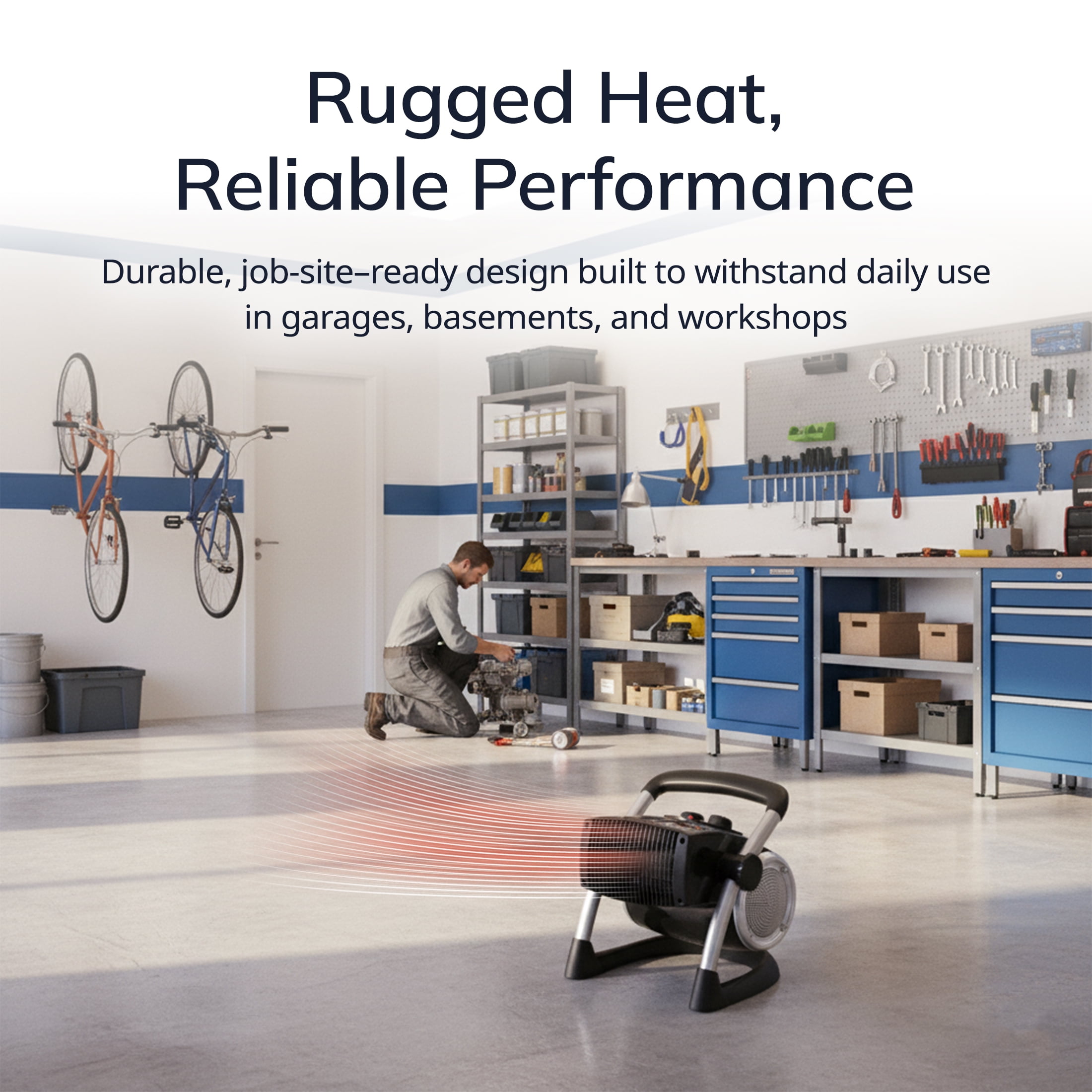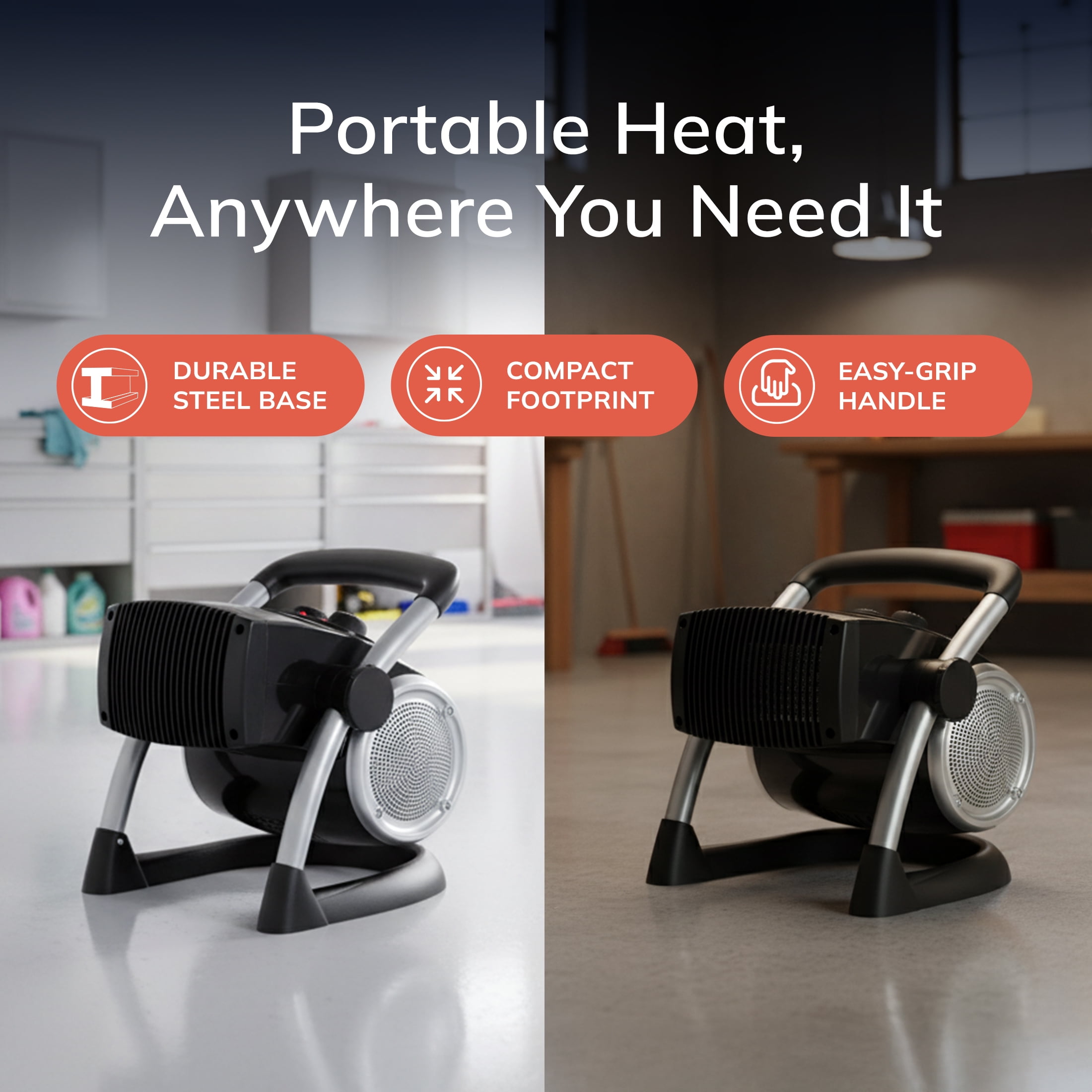 Rugged design and construction for use in garages, basements, and indoor work sites Top-mounted manual controls 3 quiet settings: high heat, low heat and fan only mode Adjustable thermostat maintains preferred temperature setting Heater pivots to direct airflow where it’s needed most Easy-grip carry handle for maximum portability Built-in safety features, like cool-touch housing and automatic overheat protection 1500 Watts of power to quickly warm your space Comes fully assembled and ready to use
