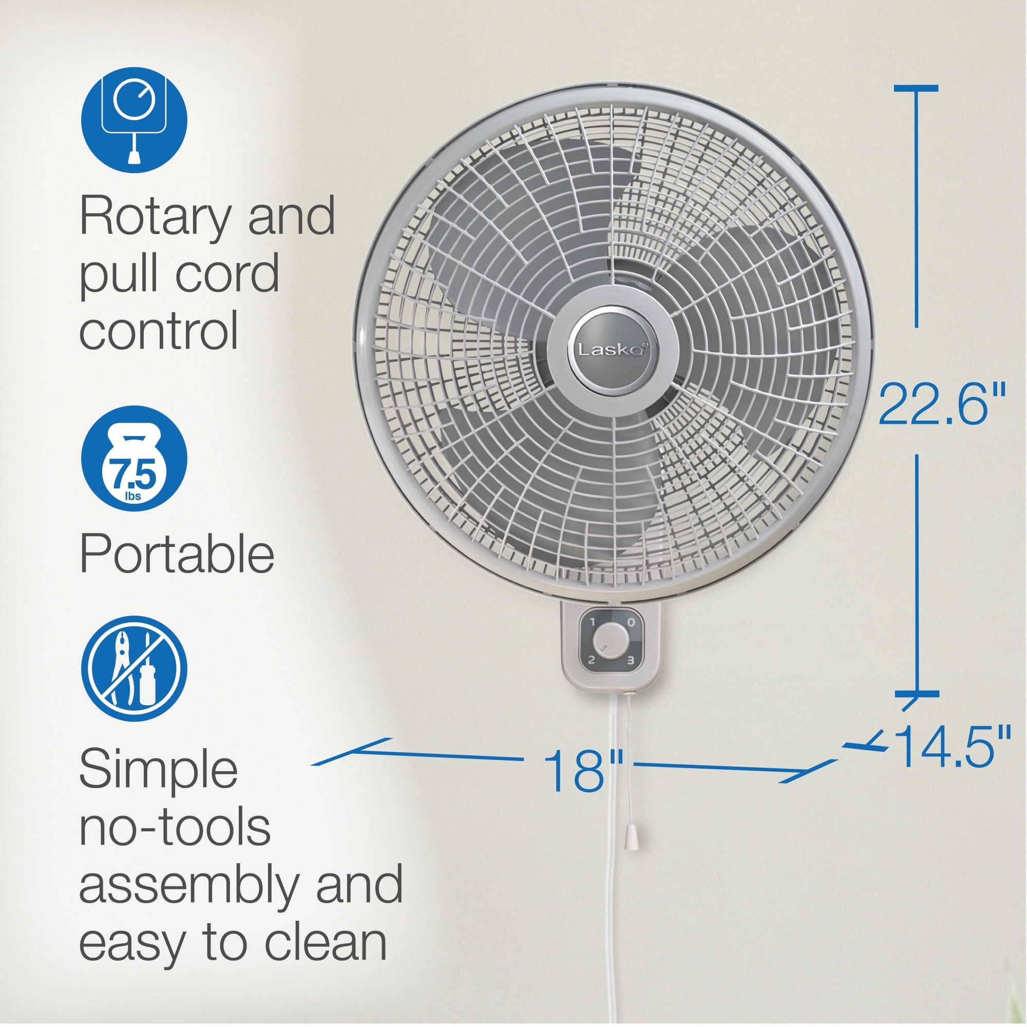 Simple, rotary and pull-cord controls 3 powerful speeds Multi-position pivot; head tilts and locks 90 degree oscillation for directional cooling Durable, quality construction – grills won’t rust or corrode Includes mounting bracket and 6-foot power cord Simple assembly required Equipped with Lasko’s trusted, fused safety plug Ideal for workshops and other areas where floor or table space is limited Condition: New