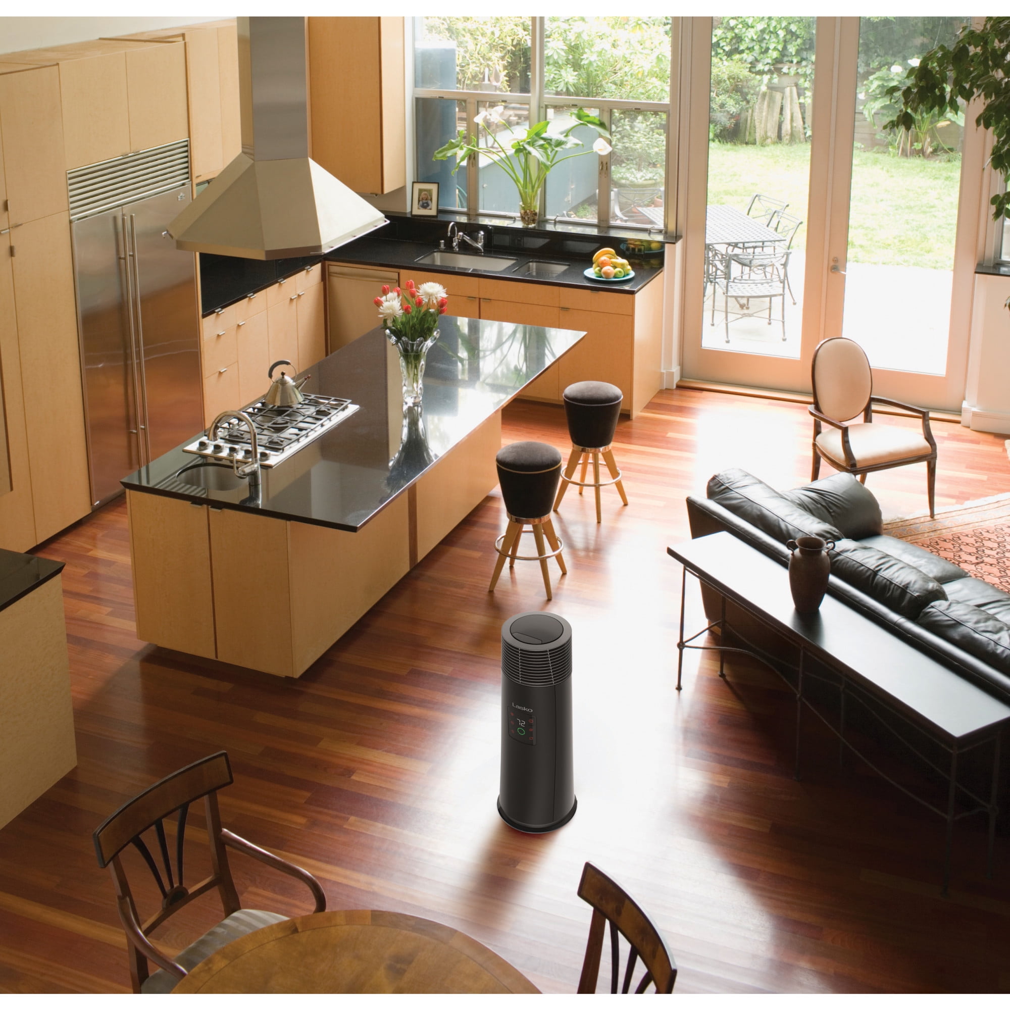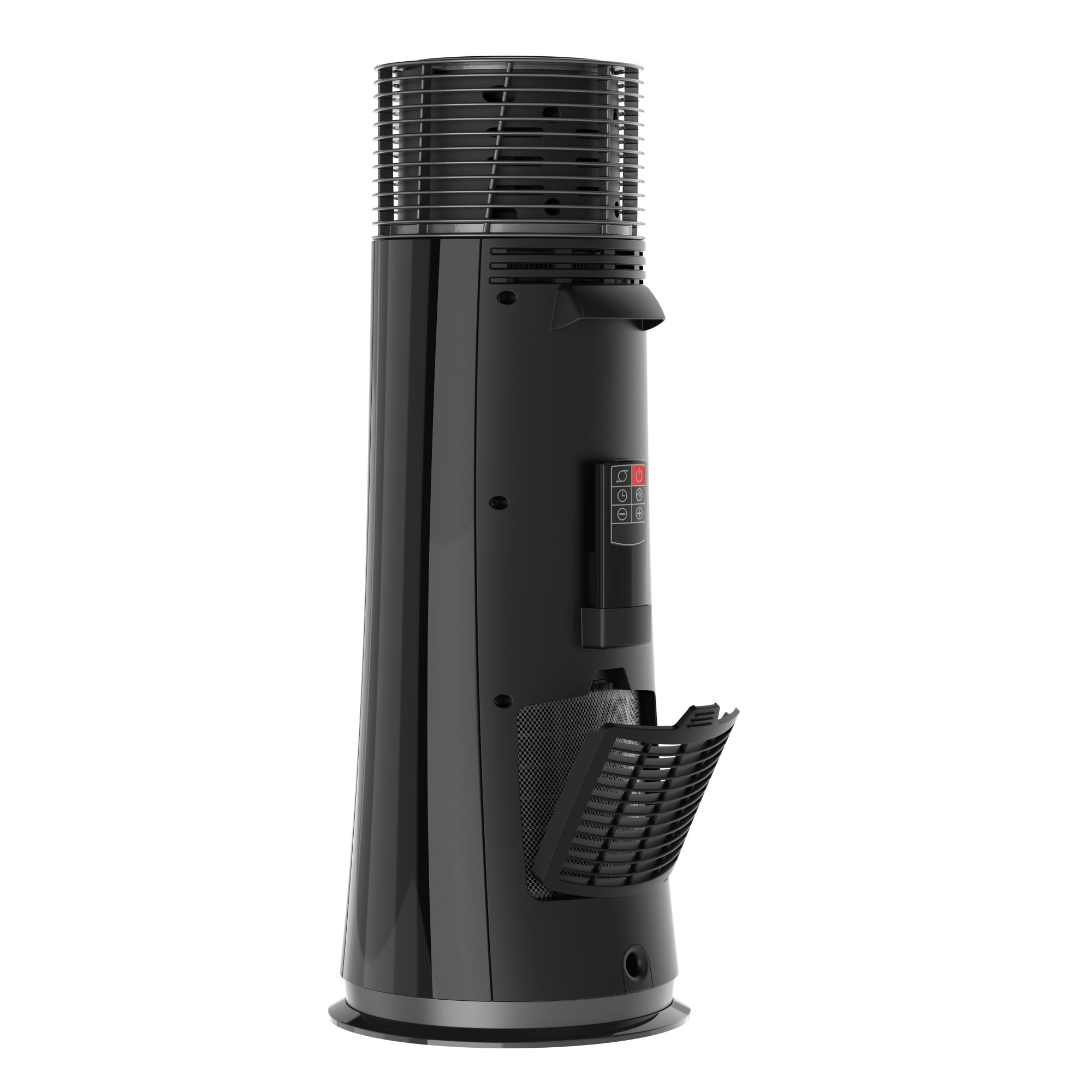Projects heat around the room with 3 heat sweep settings: 90°, 180°, and 360° 3 heat speed settings Easy digital controls with touch sensing technology Multi-function digital remote control operates the heater from a distance Thermostat mode maintains comfort using less energy 8-hour auto shut-off timer Easy-vacuum filter for high efficiency Built-in carry handle for easy portability Built-in safety features include tip-over switch and overheat protection Comes fully assembled and ready to use
