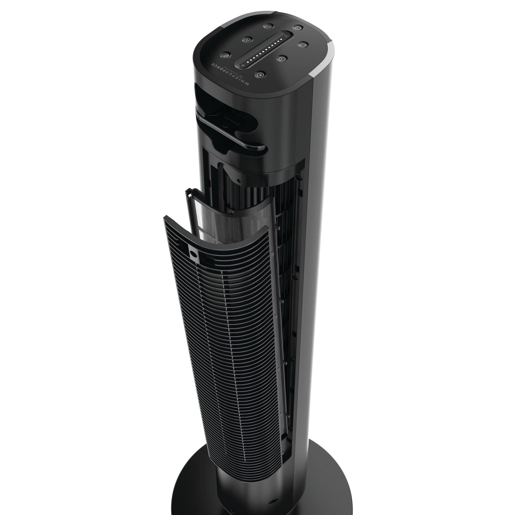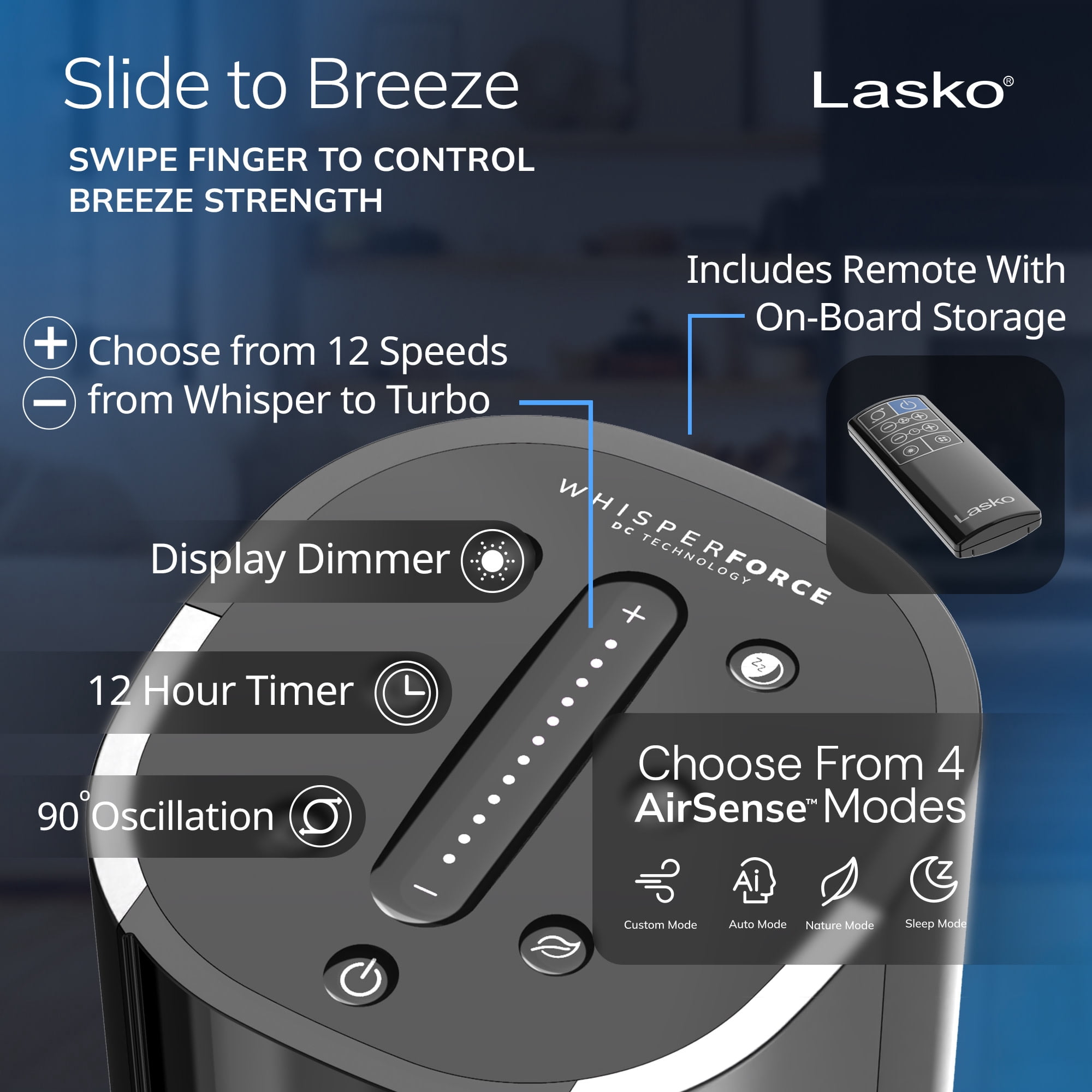 POWERFUL AIRFLOW: Feel the breeze everywhere with our tower fan’s 90° wide oscillation and speeds up to 29 ft/s (feet per second). It sweeps across your space, keeping every corner cool and refreshed with ease! Feel the breeze up to 50 feet away! FEEL IT, DON’T HEAR IT: Dive into tranquility with our WhisperForce™ DC Technology! Experience the peace of near-silence with operation noise levels as low as 24dBA on low speed—perfect for serene nights and focused days. It’s the ultimate in quiet comfort! AIR COMFORT ON AUTO PILOT: Using sensor technology integrated with smart AI capabilities, AirSense tracks your patterns and preferences to create the ideal environment. Enjoy effortless comfort with 4 intuitive modes: Custom for personalized control, Auto for adaptive adjustments, Nature for a refreshing natural breeze, and Sleep for a perfectly restful environment. SET AND FORGET: Elevate your comfort with our 12-hour timer. Program your fan in 30-minute increments to enjoy a personalized cooling experience that adapts to your schedule, so you can focus on what matters most while staying perfectly refreshed. LIMITLESS POTENTIAL, LIMITLESS POWER: Experience WhisperForce™ DC Technology. Delivering whisper-quiet operation—40% less noise, exceptional power with 34% faster wind speeds, and unmatched efficiency—38% less energy consumption, it redefines household cooling, offering a perfect blend of performance and peace. SPOTLESS PERFORMANCE: Keep your fan operating at its best with the included Filter. Designed to capture dust, lint, pet hair, it ensures cleaner air and pristine fan blades for optimal performance. Enjoy a fresher, more efficient cooling experience with minimal upkeep. Removable panel for easy access to filter for cleaning. SLIDE-TO-BREEZE CONTROLS WITH NIGHTTIME DISPLAY DIMMER: Experience intuitive control similar to your smartphone – simply swipe up to increase fan speed. With 12 speeds, you can create your ideal cooling comfort. For restful nights, press the display dimmer button to turn off the tower fan’s LED lights, ensuring uninterrupted and peaceful sleep. REMOTE CONTROL STORAGE: Say hello to hassle-free living with our built-in storage spot for the remote control, complete with a handy carry handle. It keeps your remote right where you need it and makes moving it around a breeze! SAFETY ENHANCED: Lasko’s trusted blue plug technology, swiftly responds to short circuits.
