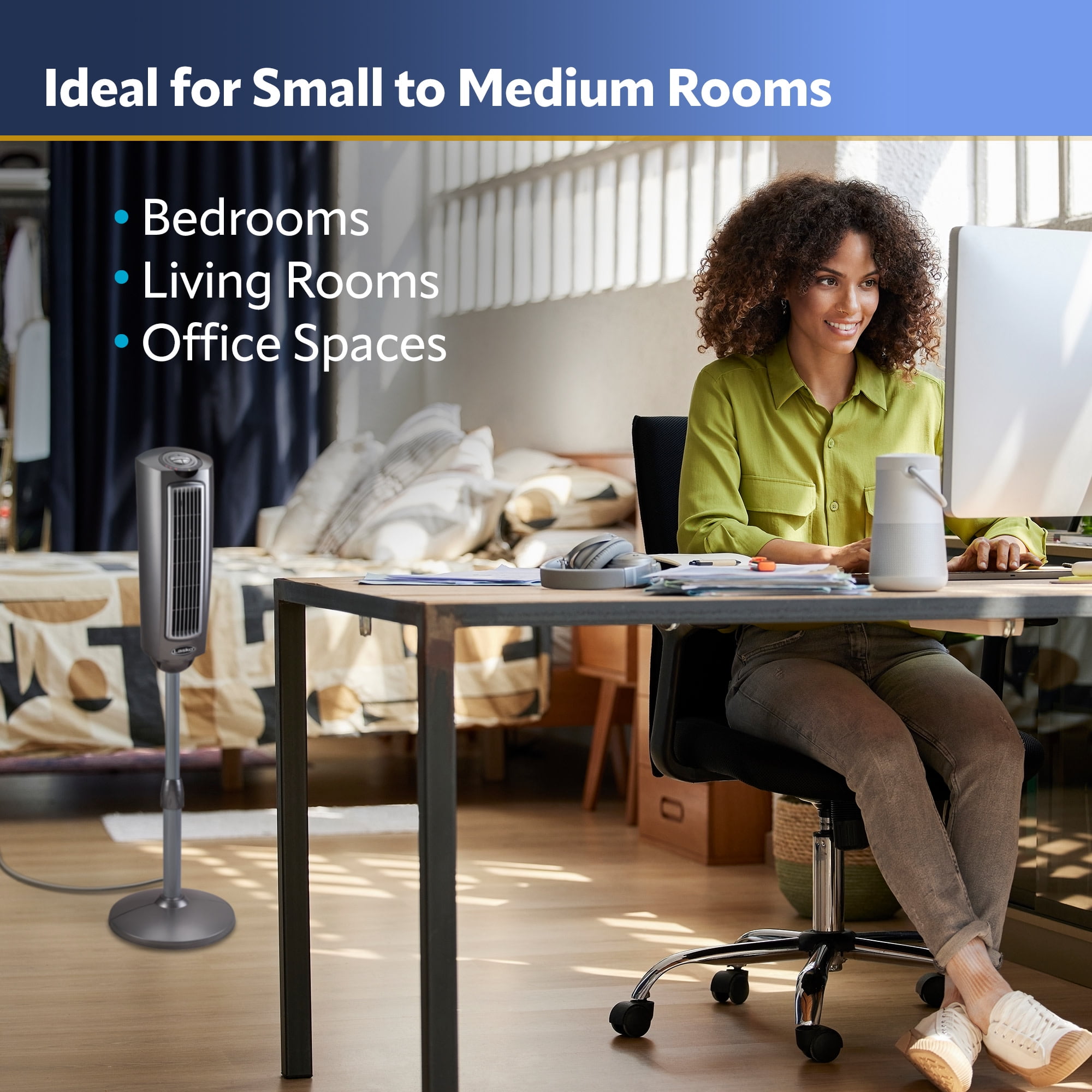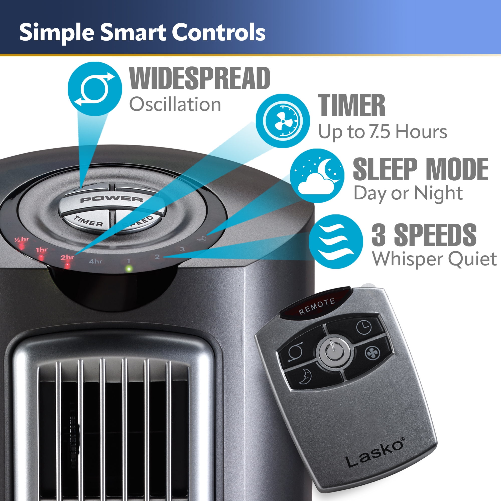 Fully-adjustable height from 41 to 52 inches for customized cooling comfort Features 3 powerful speeds to provide the perfect airflow for any room Widespread oscillation ensures full room coverage, delivering a refreshing breeze Directional louvers allow you to adjust the air flow up and down as needed Convenient multi-function remote control with on-board storage for easy access Automatic 7.5-hour timer turns the fan off after the selected time One-touch Sleep Mode automatically sets the timer to run for 6 hours Includes Lasko’s trusted safety fuse technology for added peace of mind Slim, sturdy, bladeless design complements any home or office decor Backed by a 1-year limited warranty
