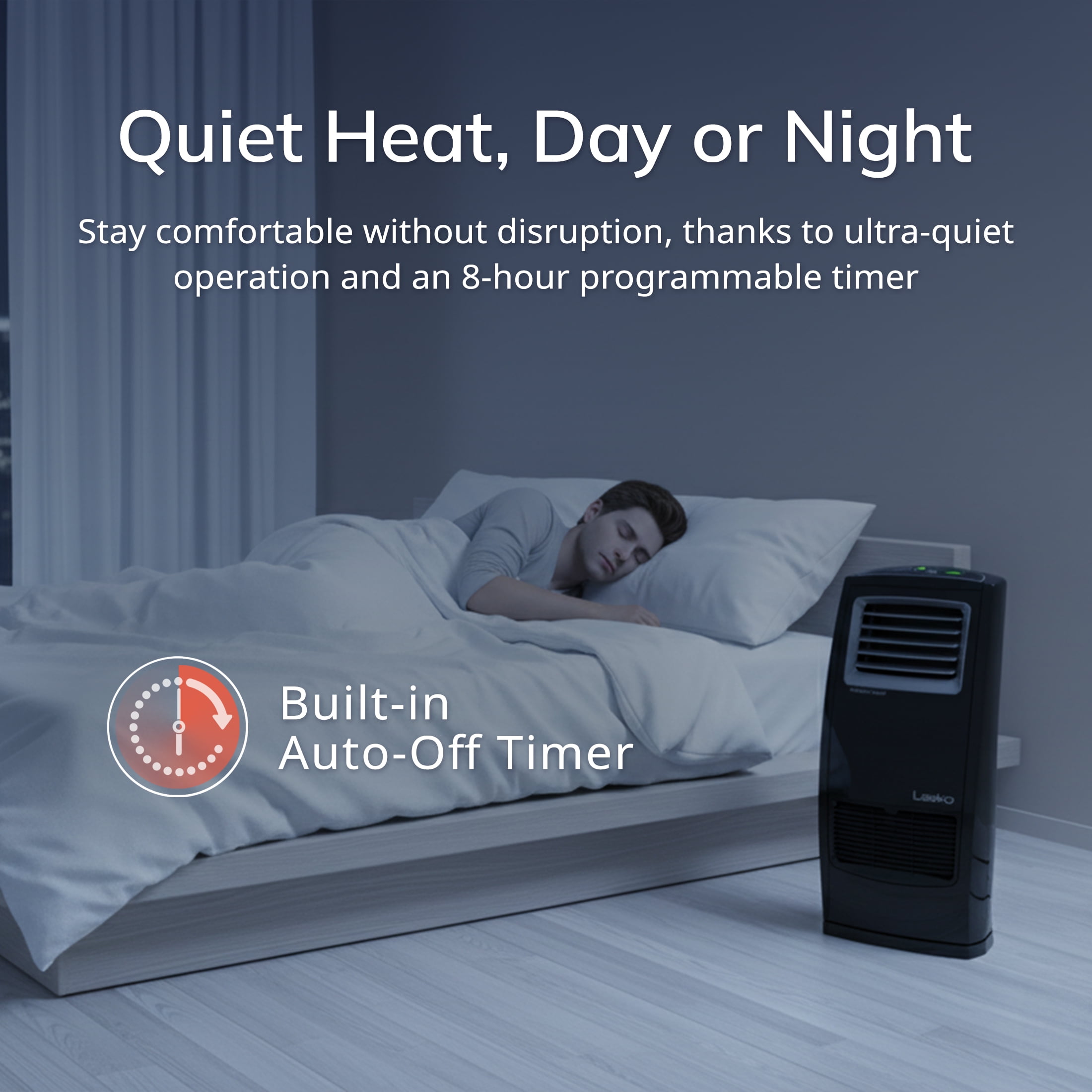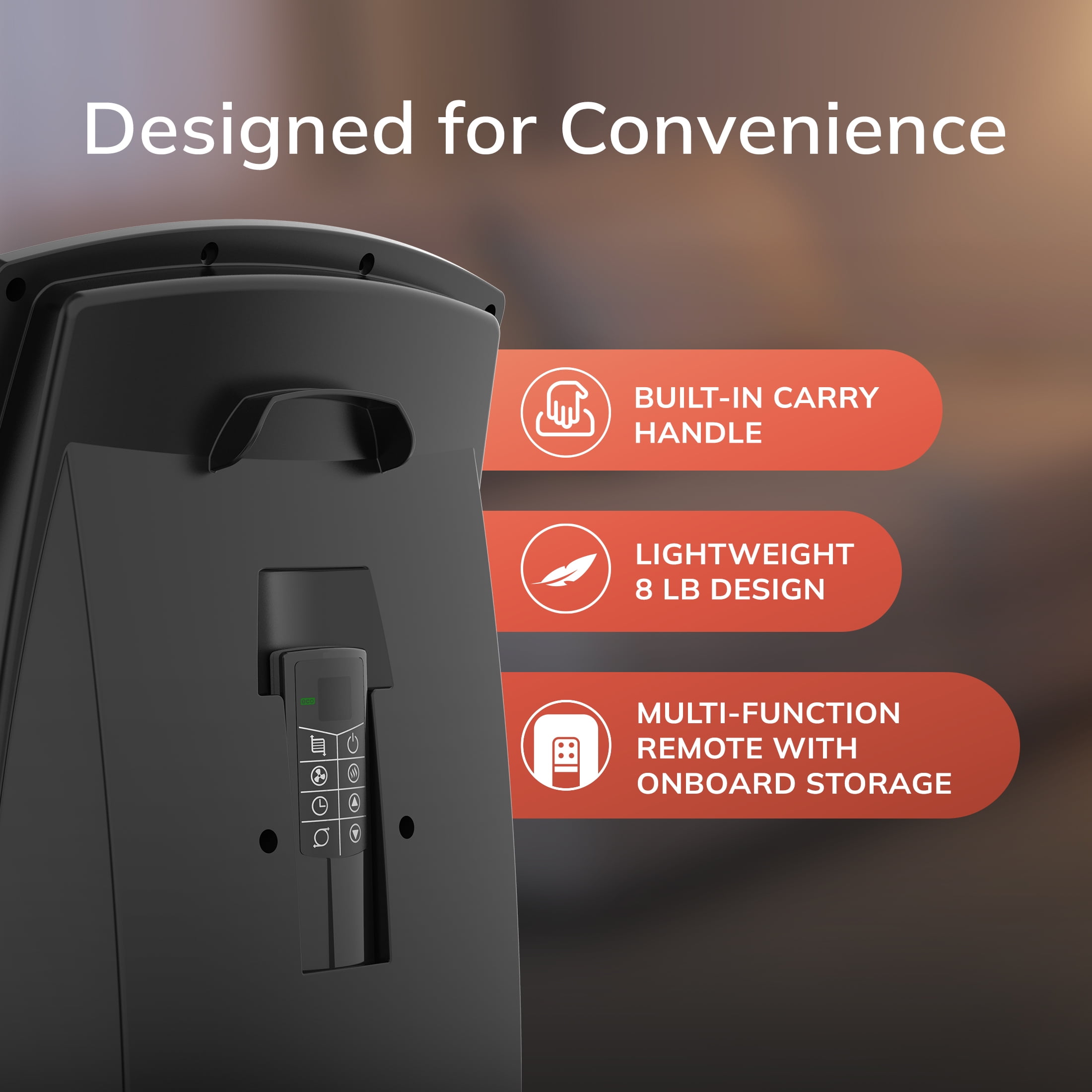 4-way heat circulation with powered vertical louvers and widespread oscillation 3 heat settings: High heat with high fan speed, High heat with low fan speed, Low heat with low fan speed Fan-only mode Built-in safety features, including tip-over switch and overheat protection Automatic electronic thermostat Easy-vacuum filter for high efficiency Multi-function, digital remote control Built-in carry handle Auto shut-off timer (up to 8 hours) Fully assembled 4-way heat circulation with powered vertical louvers and widespread oscillation 3 heat settings: High heat with high fan speed, High heat with low fan speed, Low heat with low fan speed Fan-only mode Built-in safety features, including tip-over switch and overheat protection Automatic electronic thermostat Easy-vacuum filter for high efficiency Multi-function, digital remote control Built-in carry handle Auto shut-off timer (up to 8 hours) Fully assembled