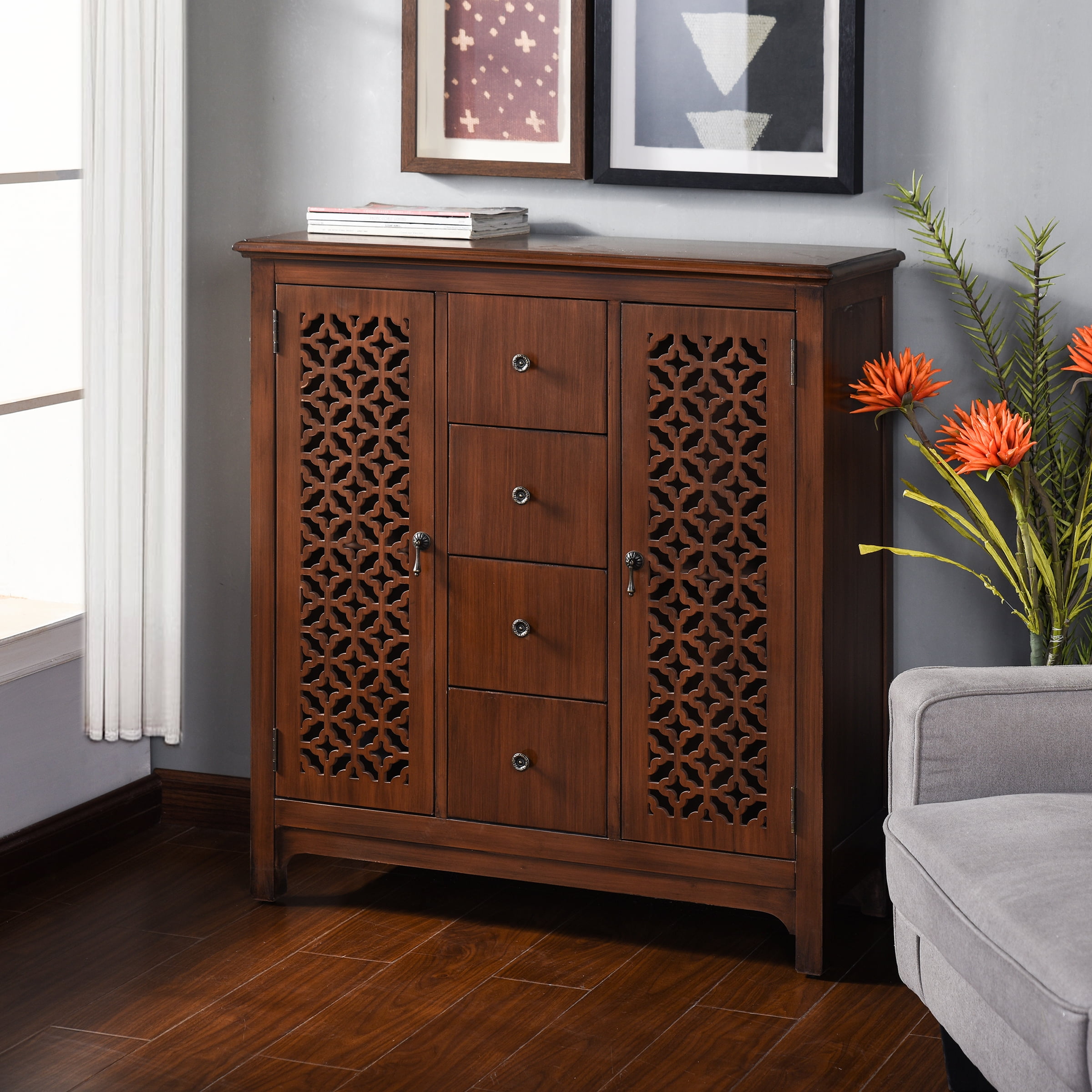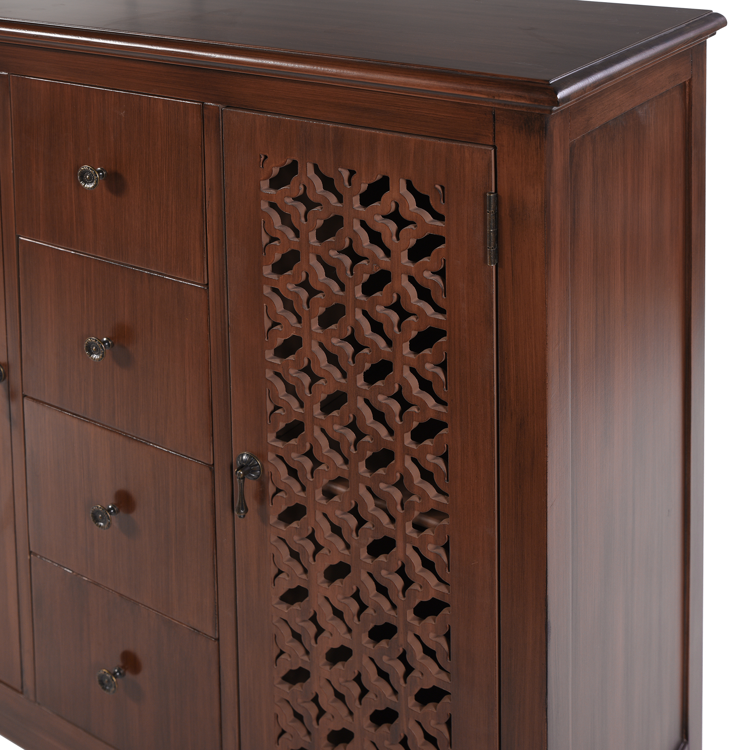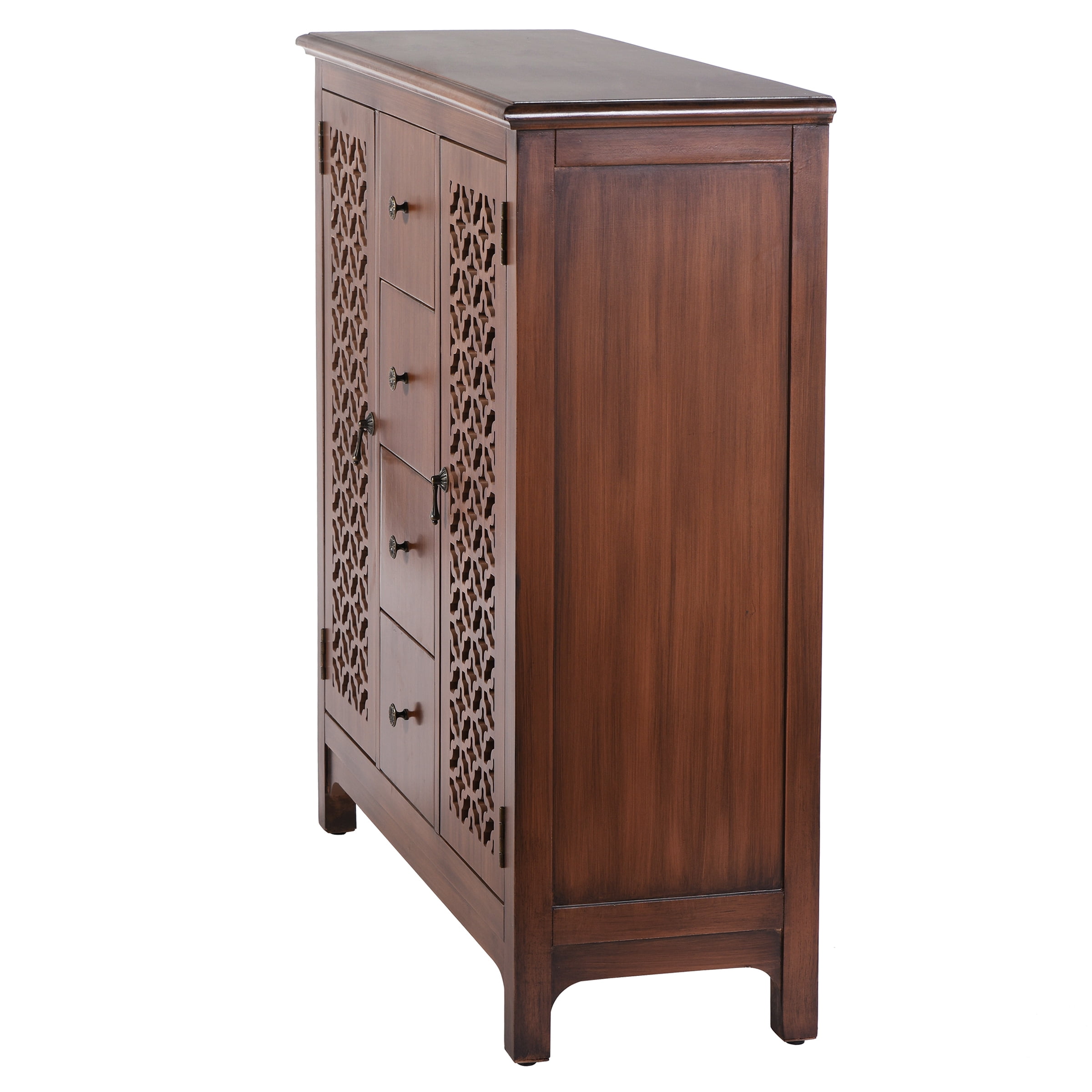 Made from wood Features 2 doors, and 4 drawers Antique brass accents Adjustable shelves and metal drawer glides