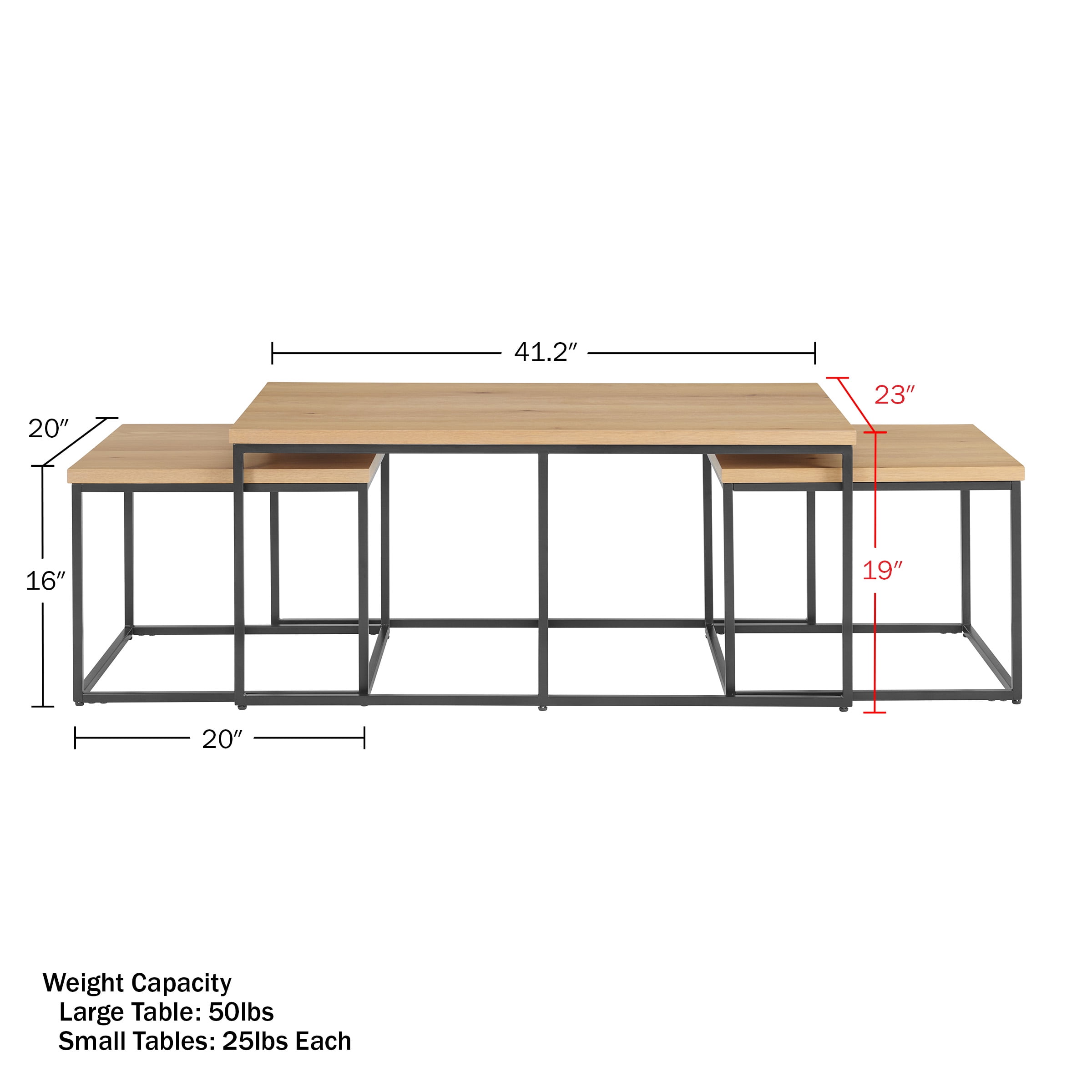 LIVING ROOM TABLE SET – This coffee table set of 3 comes with a wood coffee table and two matching end tables for a complete look that will pair well with a variety of furniture. NESTING CAPABILITIES – This table set includes 3 tables in different sizes that nest together for compact storage and can be kept together or used separately throughout the room for a cohesive design. DURABLE DESIGN – The living room table set features a sturdy metal base, durable MDF wood top, and are the perfect height to set your drink, magazine, or remote on while sitting on the couch. VERSATILE USE – This minimalist industrial coffee table set is perfect for your living room, family room, and office, and the compact footprint makes it ideal for small homes, apartments, or dorms. MATERIALS – MDF and Metal. DIMENSIONS – Coffee Table: (L) 41.2” x (W) 23” x (H) 19”; Side Tables: (L) 20” x (W) 20” x (H) 16”. Weight Capacity: Large Table: 50lbs; Small Tables: 25lbs Each. COLOR – Walnut-Finished Top with Black Base.