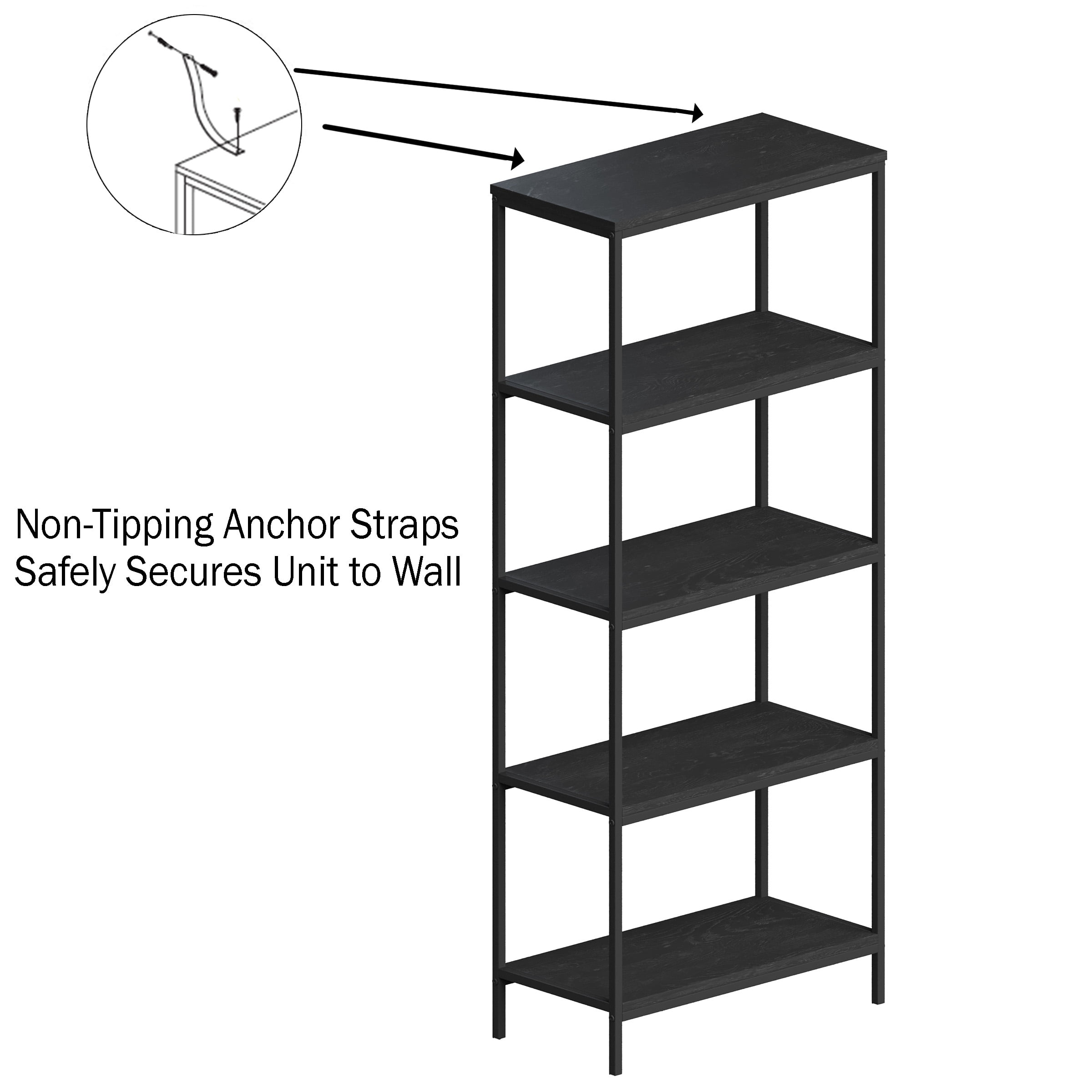 Lavish Home 5-Tier Bookshelf – Industrial Shelving Unit, Black Woodgrain