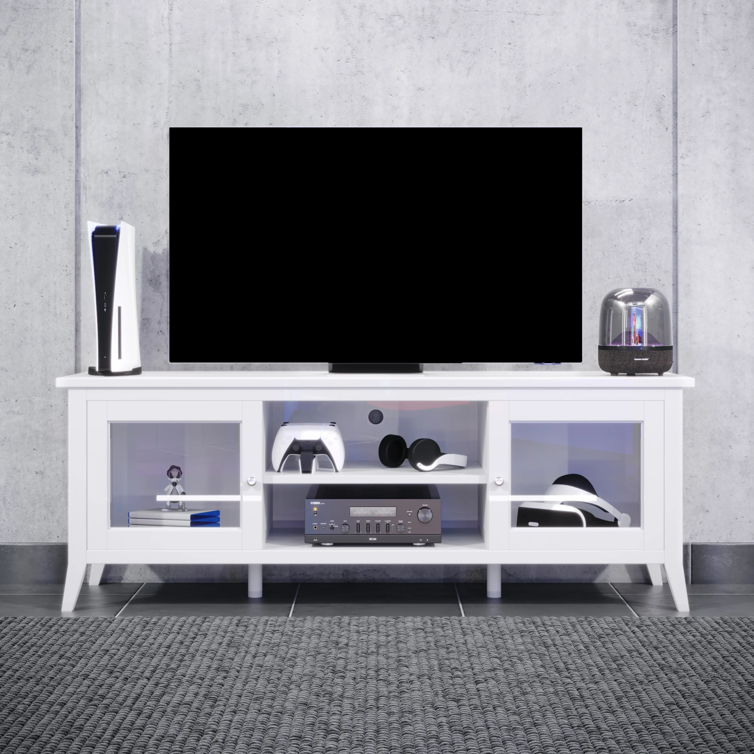 Complement any home décor with the traditional design of the TV Stands by Lavish Home. This piece of living room furniture acts as a storage cabinet or TV stand and supports TVs up to 65-inches. Easily keep multiple gaming consoles together and keep your cords organized with the convenient cord management holes in the back panel of this TV cabinet. The white TV stand features 2 open shelves and 2 cubbies with tempered glass doors on either side, giving you plenty of room to display your personality with books, art, baskets, or decorative vases.