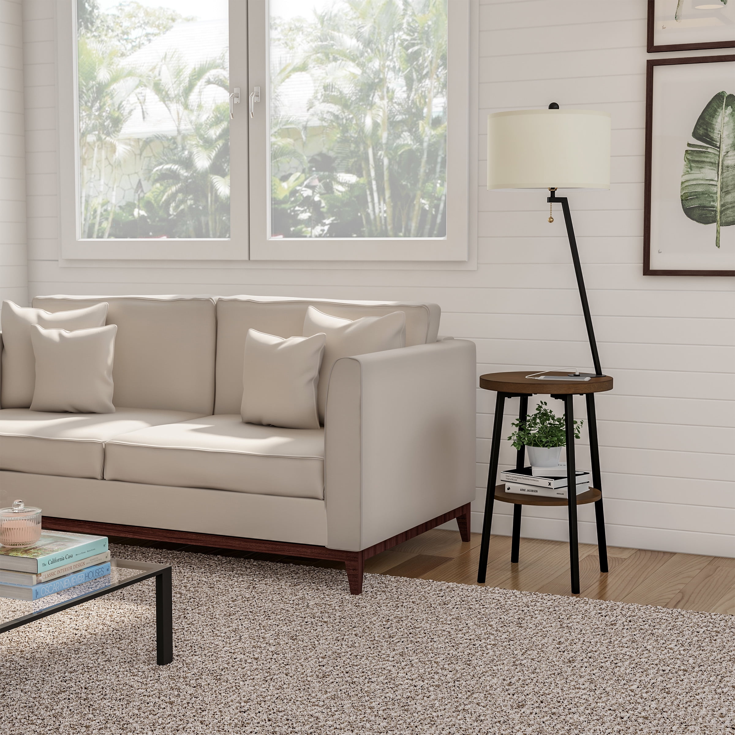 SIDE TABLE WITH LAMP – This space-saving piece of furniture will brighten any room while providing storage for knick-knacks, photos, or other home décor. USB CHARGING PORT – Whether you use this table lamp next to a sofa or by your bed as a nightstand, your charging devices will be within easy reach with the 5V 1A USB port located on top of the table. ATTRACTIVE AND DURABLE – The neutral drum-shaped shade will flatter any room, and the classy matte black legs of the end table are constructed from sturdy iron to provide a stable base. ENERGY EFFICIENT LIGHTING – The UL-listed room lamp is equipped with a pull chain for easy on/off and comes with a replaceable E26-type 60-Watt incandescent equivalent 805-lumens 9W LED ETL listed bulb. MATERIALS – Veneer Wood, Iron, and Linen DIMENSIONS – (L) 17.25 x (W) 17.25 x (H) 58-inches; Side Table: (L) 17.25 x (W) 17.25 x (H) 25.5-inches; Shade: (L) 16 x (W) 16 x (H) 9-inches; Cord Length: 9-feet COLOR – Brown, Black, and Off-White