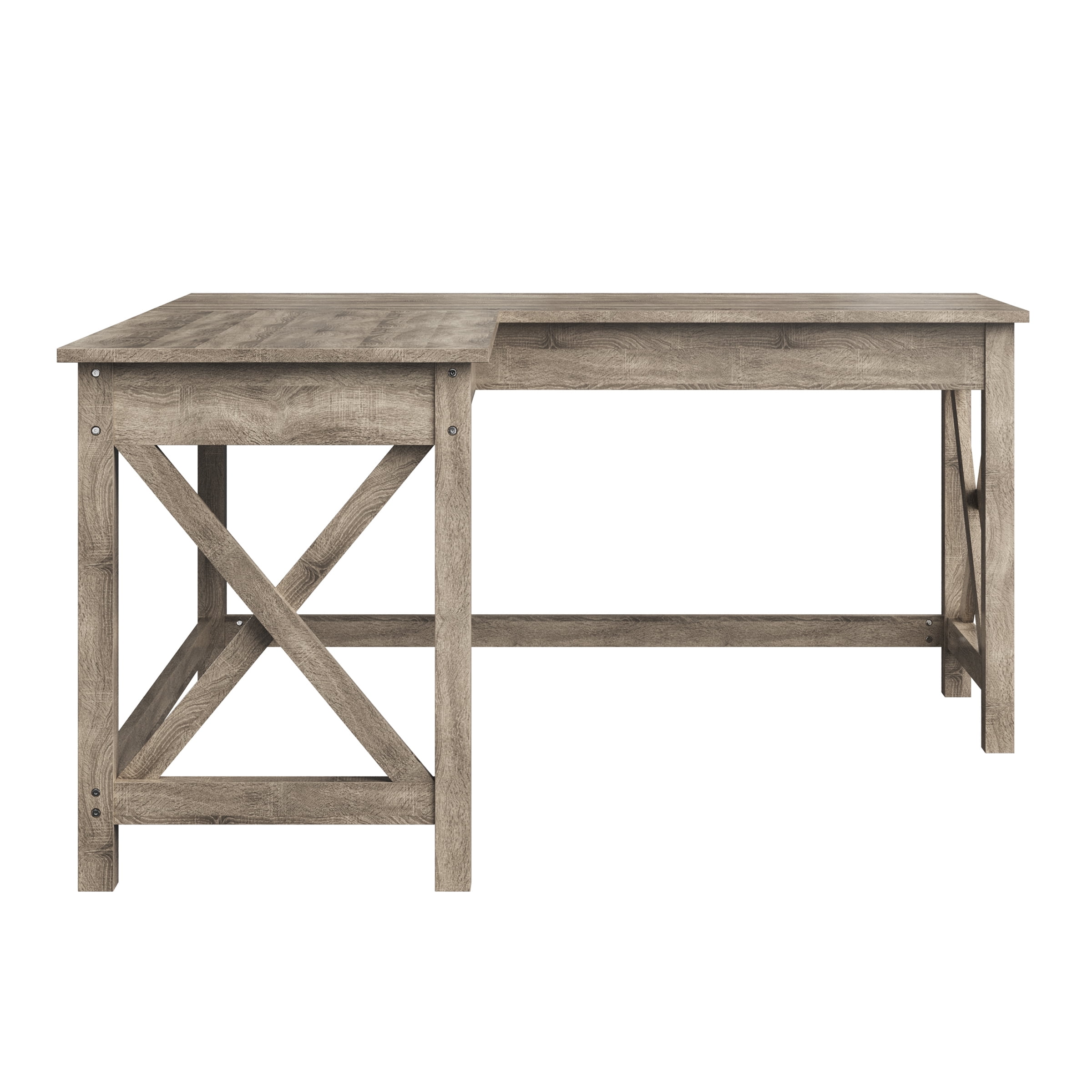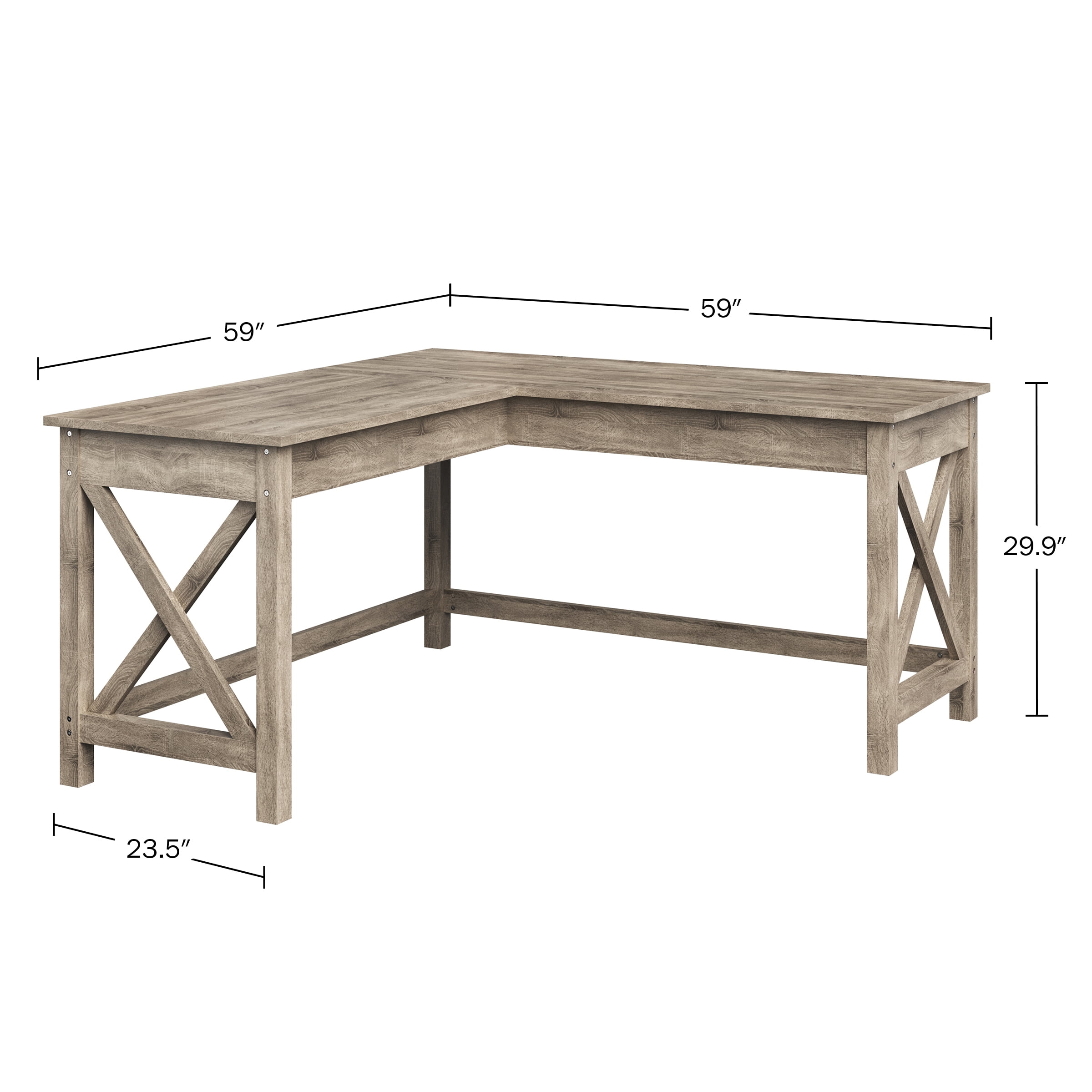 L-SHAPE DESK – The ambidextrous design allows you to orient the corner as either a left or right hand return. CONTEMPORARY STYLE – The weathered light gray oak wood veneer finish complements many design aesthetics be it cottage chic to vintage farmhouse. SPACIOUS DESKTOP – Features a roomy desktop large enough for you to spread out multiple computer monitors, paperwork, crafts, a printer, and other office supplies. DURABLE DESIGN – Easy to assemble, is made of durable MDF with X-pattern support legs for lasting use, and brings a cottage traditional design to add style to your home. VERSATILE USE – This stylish gaming table is perfect for your home office, basement, or game room and can be used as a PC desk, craft table, study desk, vanity desk, and more. MATERIALS – Wood Veneer and MDF. DIMENSIONS – Overall L 59” x W 59” x H 29.9” – Desktop Depth 23.5″ COLOR – Light Gray Oak Woodgrain Finish