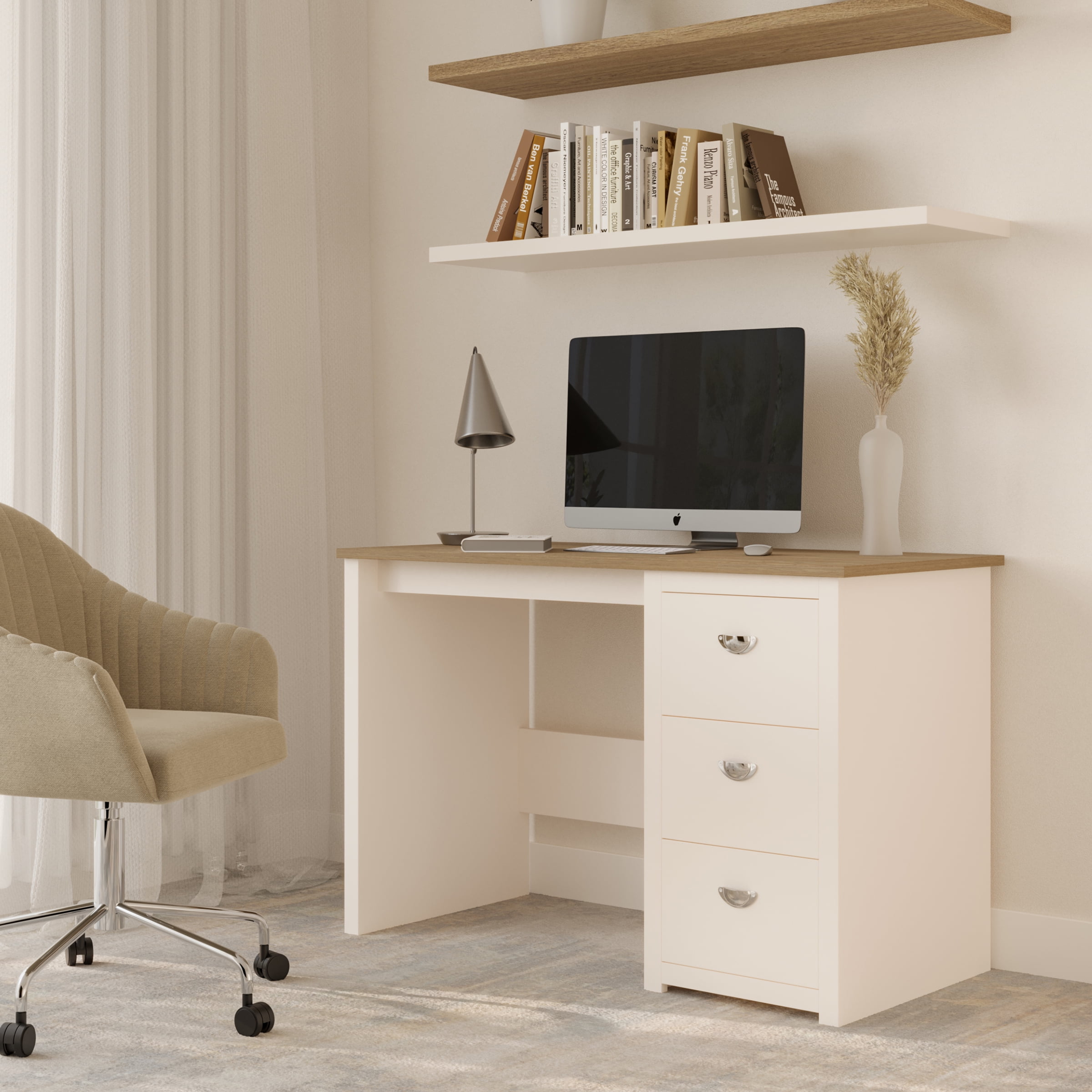 DESKS FOR HOME OFFICE – The clean lines, two-tone white and wood finish, and 3-drawers of this office desk bring functionality and traditional style to your home. TRADITIONAL DESIGN – This desk with drawers features a sleek design with a traditional finish, ideal for apartments, dorm rooms, bedrooms, or home offices. STORAGE DRAWERS – The study desk features plenty of storage space with the attached 3 side drawers, large enough to hold file folders, papers, books, and other office supplies. VERSATILE USE – This table also works great as a computer, craft, or study desk, and the large desktop provides plenty of room for multiple monitors, gaming equipment, and crafting supplies. MATERIALS – MDF Frame and Particle Board Drawers with Paper Veneer. DIMENSIONS – (L) 43.5” x (W) 21.75” x (H) 29.75”; Weight: 30.86lbs COLOR – White and Wood Finish.
