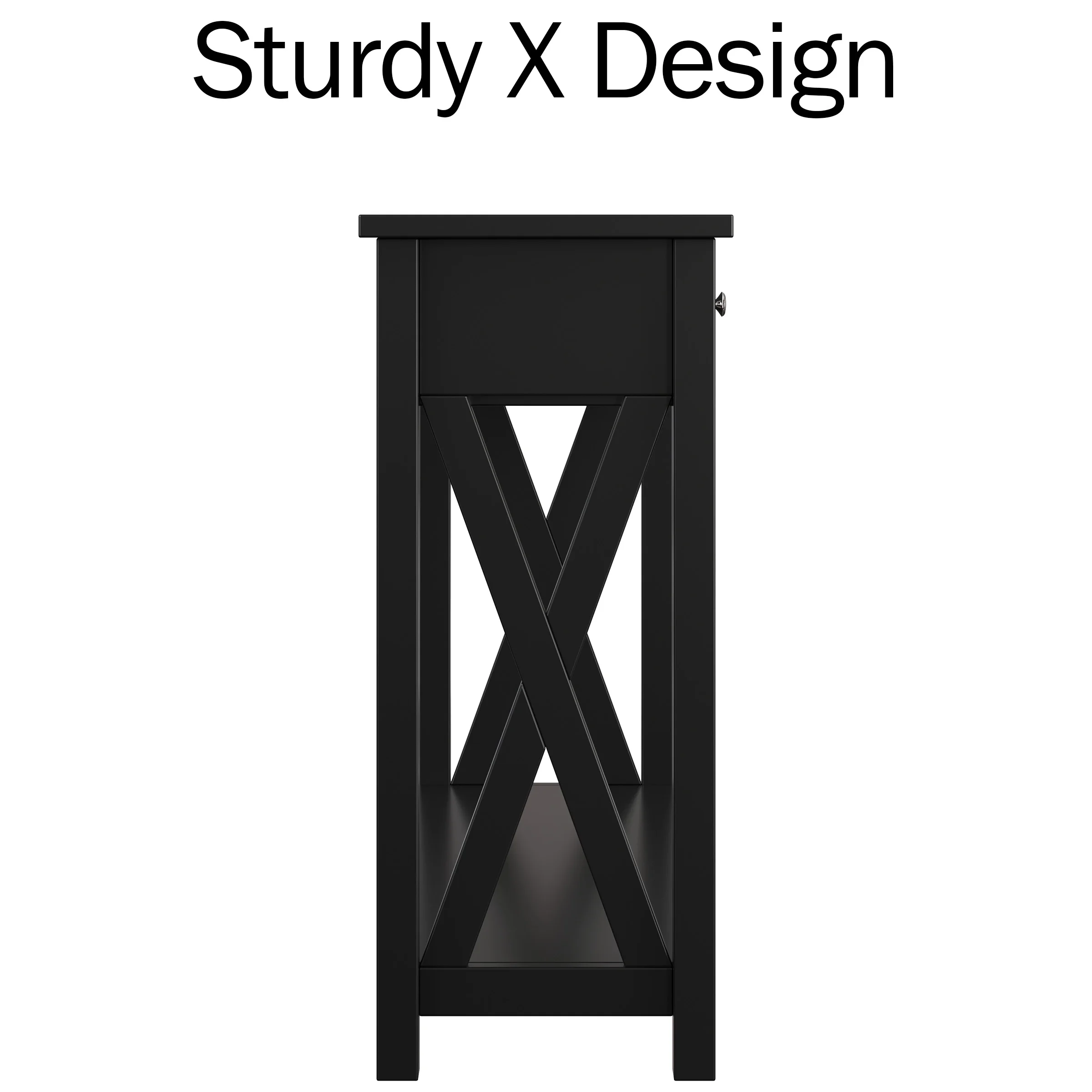 COMPACT CONSOLE TABLE – This 42.5-inch-long by 14-inch-wide buffet table has a compact footprint that’s perfect for cozy living rooms, apartments, tight hallways, or placing next to a sofa. 2 STORAGE DRAWERS – Two 16.5-inch-long drawers keep clutter out of sight, providing a handy place to stash keys, important mail, reading glasses, extra coasters, or television remotes. VERSATILE USE – This small table can be used as a tv stand, in your entryway, in a home office, or even in a bedroom or bathroom, and the clean lines and modern black finish complement a variety of home décor styles. STURDY CONSTRUCTION – Built from durable manufactured wood with X-shaped side braces that add stability, this entry table is sure to add functional style to your home for years to come. PRODUCT DETAILS – Materials: MDF Wood. Dimensions: (L) 42.5” x (W) 14” x (H) 31.75”. Drawer: (L) 16.5” x (W) 9.5” x (H) 3.5”. Bottom Shelf: (L) 37.75” x (W) 12.75” x (H) 19.25”. Color: Black.