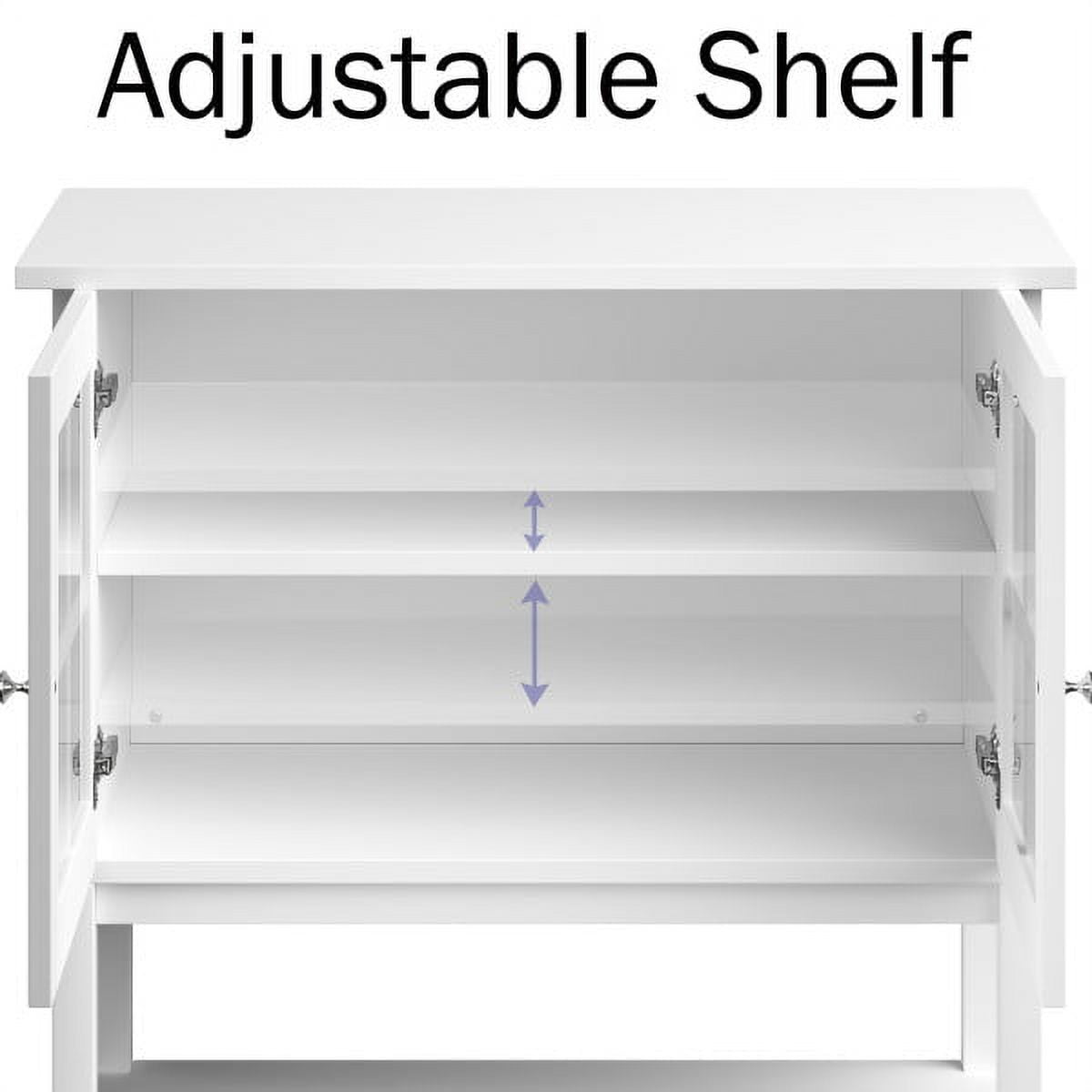 BUFFET TABLE – This contemporary accent table with storage is a stylish and practical addition to any home, and the clean lines and modern white finish complement a variety of interior design styles from coastal to modern farmhouse. ATTRACTIVE DISPLAY – The tempered glass doors allow you to use this curio cabinet to display decor items, keepsakes, or barware while keeping them secure and free from dust. VERSATILE USE – This attractive cabinet makes a great addition to any area of your home that needs a storage solution. It can be used as an entryway table, as a bathroom cabinet, for kitchen storage, in a home office, or even as a coffee bar. MULTIPURPOSE SHELVES – The shelf inside the buffet cabinet is adjustable to adapt to any storage purpose, and the 29.5-inch-long by 14.75-inch-wide lower shelf provides open storage to help you keep your kitchen, entryway, or living room organized. PRODUCT DETAILS – Materials: MDF Wood and Tempered Glass. Dimensions: (L) 31.5″ x (W) 15.5″ x (H) 30.75″; Inside Shelf: (L) 27.25″ x (W) 13.75″; Bottom Shelf: (L) 29.5″ x (W) 14.75″ x (H) 7.5″. Color: White.
