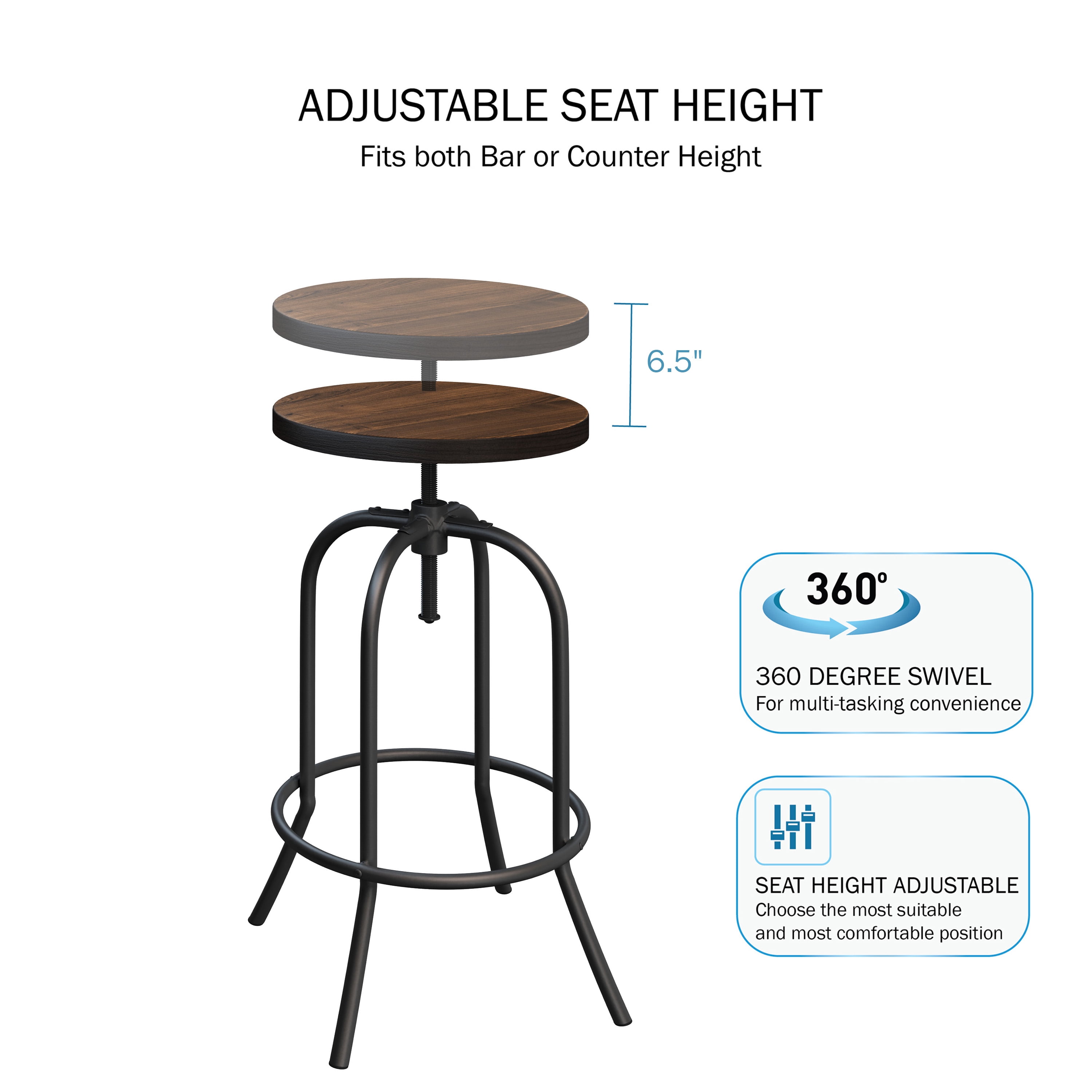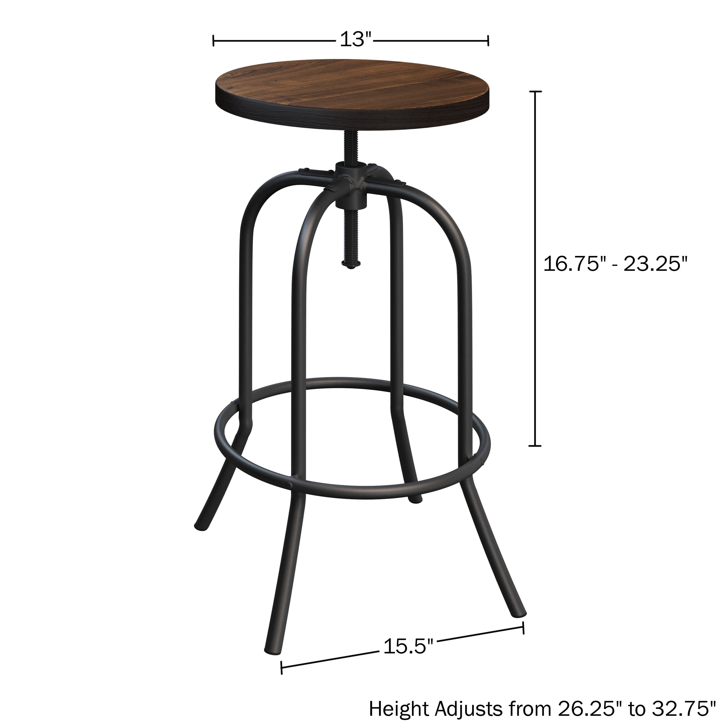 ADJUSTABLE HEIGHT – With a seat that adjusts from 26.25 to 32.75-inches, the adjustable bar stool can be adapted to fit counter or bar heights. We suggest that the table or bar is 10-inches taller than the stool or chair for your guests’ comfort. SWIVEL SEAT – The 13-inch round stool seat swivels a full 360-degrees for versatile use at a kitchen island or peninsula, at a pub table, or in a commercial space. It also has a locking bolt on the backless seat to prevent it from turning as needed. QUALITY CONSTRUCTION – Constructed from sturdy powder-coated iron tube and real Elm wood, this high-quality bar stool has a 265lb weight capacity, a lower ring that serves as a footrest, and plastic feet to protect your floors from scratches and scuffing. STYLISH ACCENT FURNITURE – With coffee colored metal Tube legs and a dark walnut stained wood seat, this kitchen stool creates a stylish look that is sure to complement your home or space with any interior design, from vintage farmhouse to modern industrial. PRODUCT DETAILS – Materials: Powder-Coated Iron tube and Elm Wood. Dimensions: (Seat Diameter) 13″; (Base Diameter) 15.5″ x (H) 26.25″ can adjust up to 32.75″. Weight Capacity: 265lbs. Color: Dark Walnut Stained Seat and Coffee-Colored Legs.