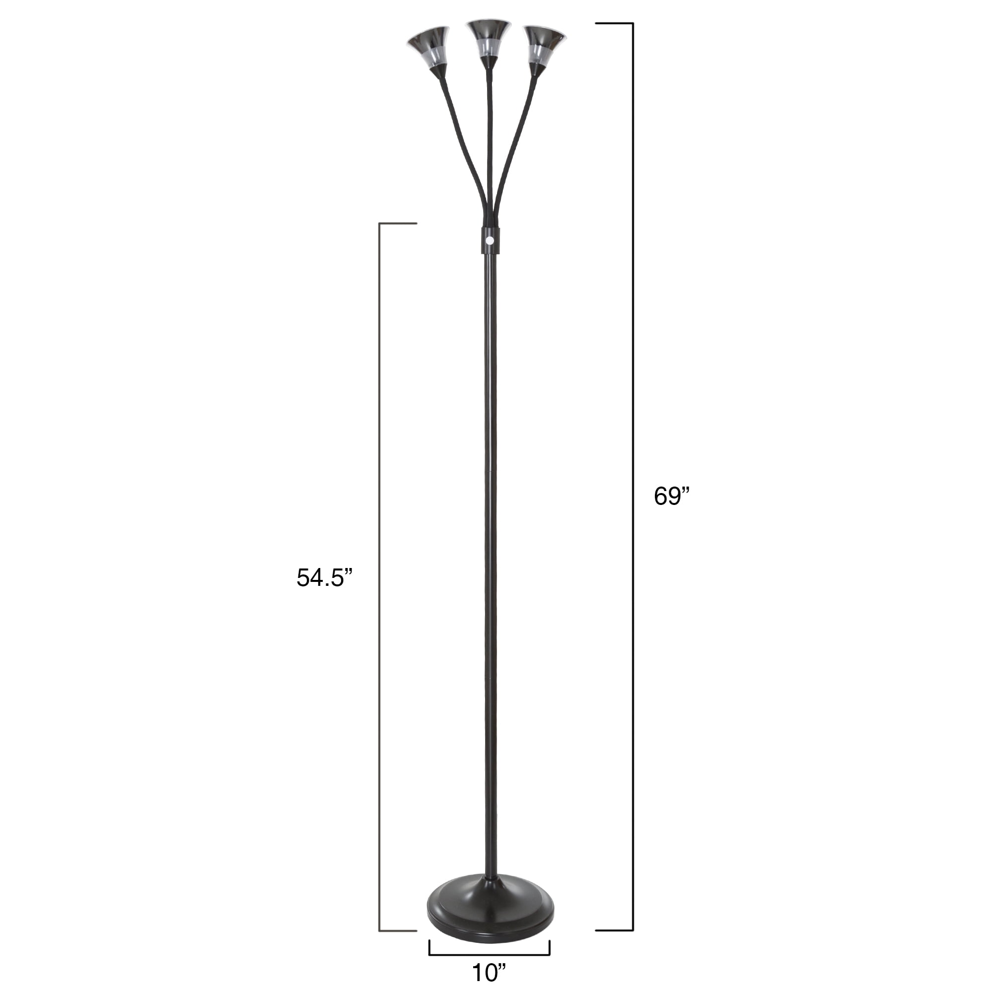 MODERN FLOOR LAMP – This bedroom lamp includes nonreplaceable PL-27W bulbs with 6400K color temperature that provide natural light, helping to eliminate eye stress and fatigue. ADJUSTABLE DESIGN – The standing lamp features 3 flexible gooseneck arms that allow you to focus the light where you need it or straighten it to spread light across the room. VERSATILE USE – Whether you are looking for a reading lamp for homework, need a craft light for sewing, or are an esthetician, the bright illumination provided by this black floor lamp will suit all your needs. DURABLE AND FUNCTIONAL – With a metal construction and weighted base, this living room lamp is sure to illuminate your home for years and features a touch on/off switch with 4 brightness levels. MATERIALS – Metal and Plastic. DIMENSIONS – Straight Neck: (L) 10” x (W) 10” x (H) 69”; Arms: (L) 13”; Lamp Head: (L) 3.5”; Cord Length: 70”. Voltage: 120V. COLOR – Black.