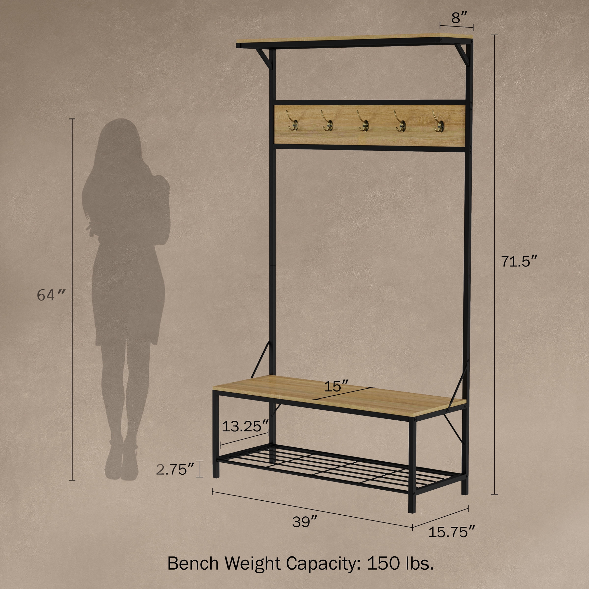 THREE-IN-ONE ORGANIZER – The bench with storage provides easy access to footwear and a spot to put it on, while hooks above make it simple to grab coats on the way out the door. HANDY SHOE STORAGE – The wire rack beneath the seat holds up to five pairs of shoes and boots, providing drainage for wet or soiled footwear. CONVENIENT COAT RACK – This entryway bench with coat rack includes five sturdy metal hooks that hold 5 pounds each and include two prongs to maximize storage. ATTRACTIVE AND DURABLE – The light oak veneer contrasts beautifully with the black iron frame for a gorgeous look in country foyers and farmhouse mudrooms and kitchens. MATERIALS – Iron and Particle Board with Paper Veneer. DIMENSIONS – Overall: (L) 15.75″ x (W) 39″ x (H) 71.5″; Ground Clearance: 2.75″. COLOR – Black and Weathered Sand Woodgrain.