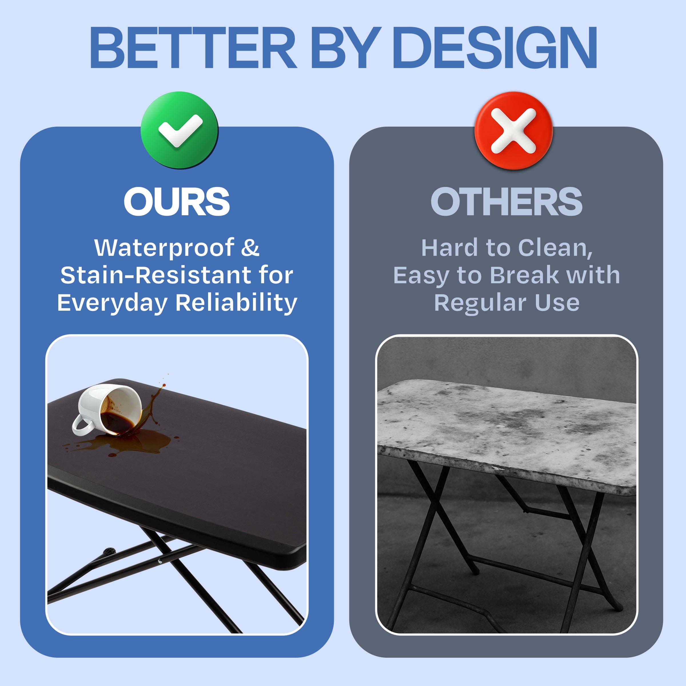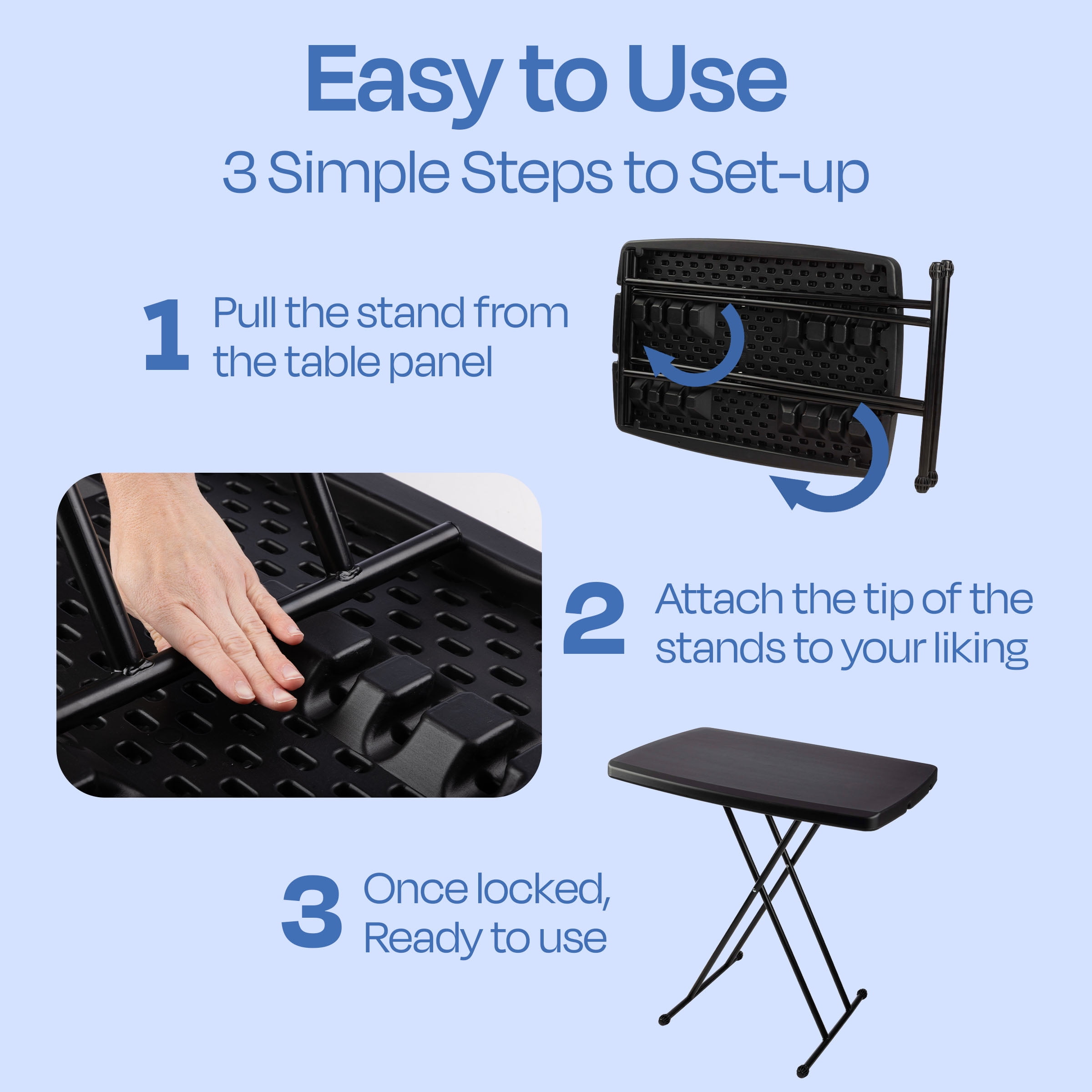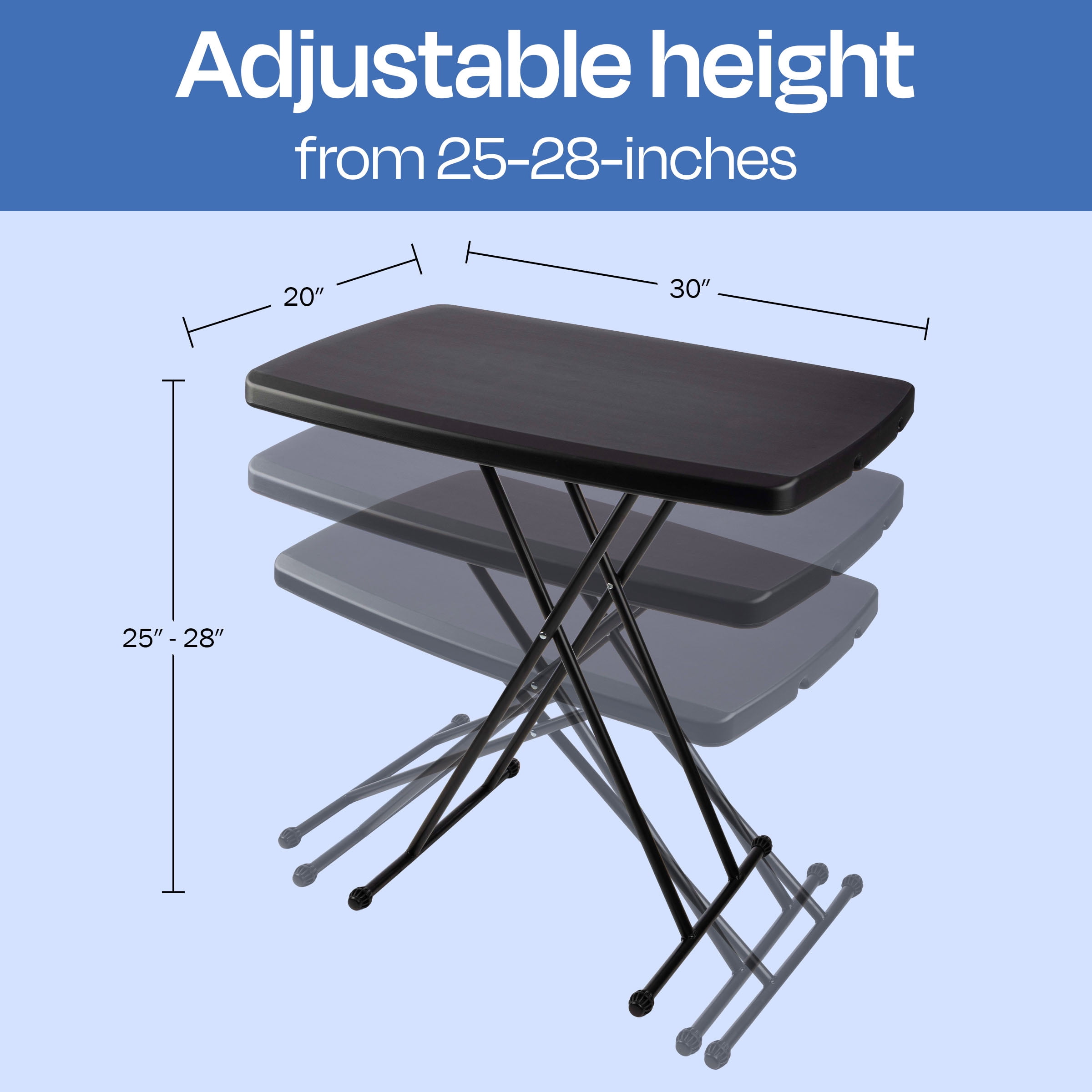 This folding card table has an adjustable height from 25-28-inches, so you can use it as a craft table for sewing or place a TV tray on it The powder-coated steel frame on this lightweight portable table resists stains, and the durable blow mold polyethylene top makes it great for both indoor and outdoor use The scratch-resistant surface of this outside table makes it easy to clean in the event of a spill, so you can use it for camping, tailgating, craft projects, and kids’ activities The minimalist look of the plastic folding table complements a wide range of interior design aesthetics, and its compact size makes it perfect for small spaces Materials: Tubular Powder-Coated Steel and Blow Mold Polyethylene Dimensions: (L) 30 x (W) 20 x (H) 25-28-inches; Max Weight Capacity: 40lbs Color: Black