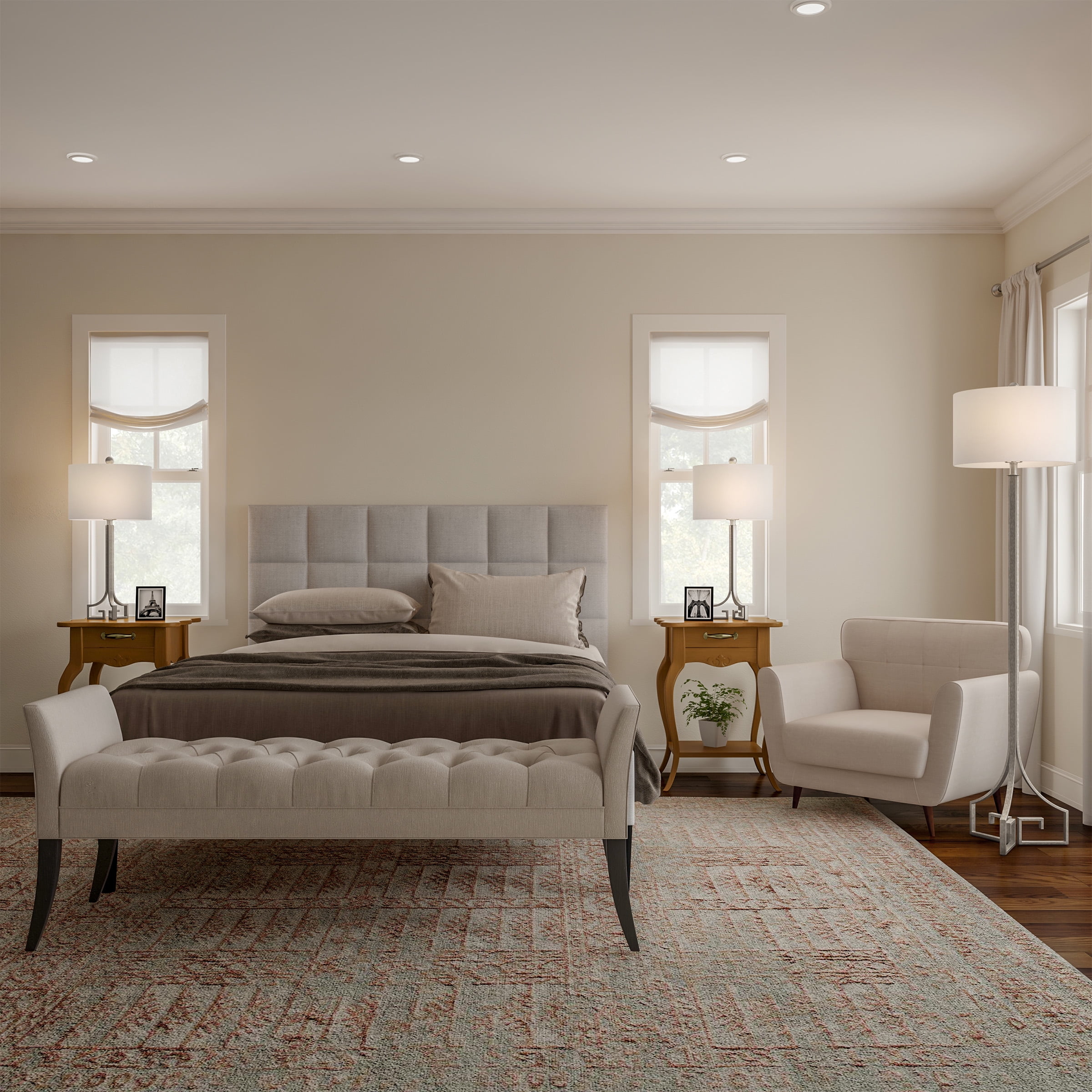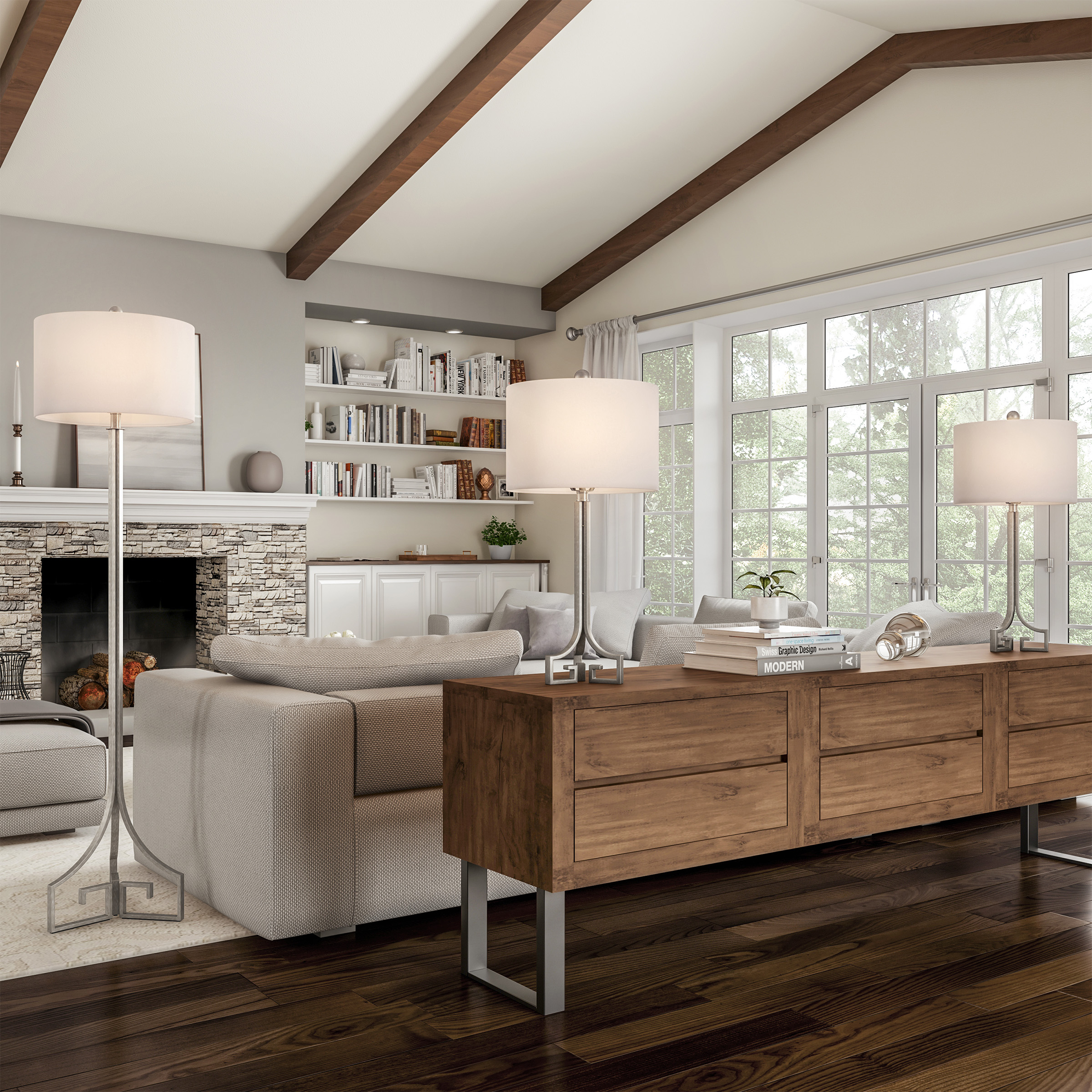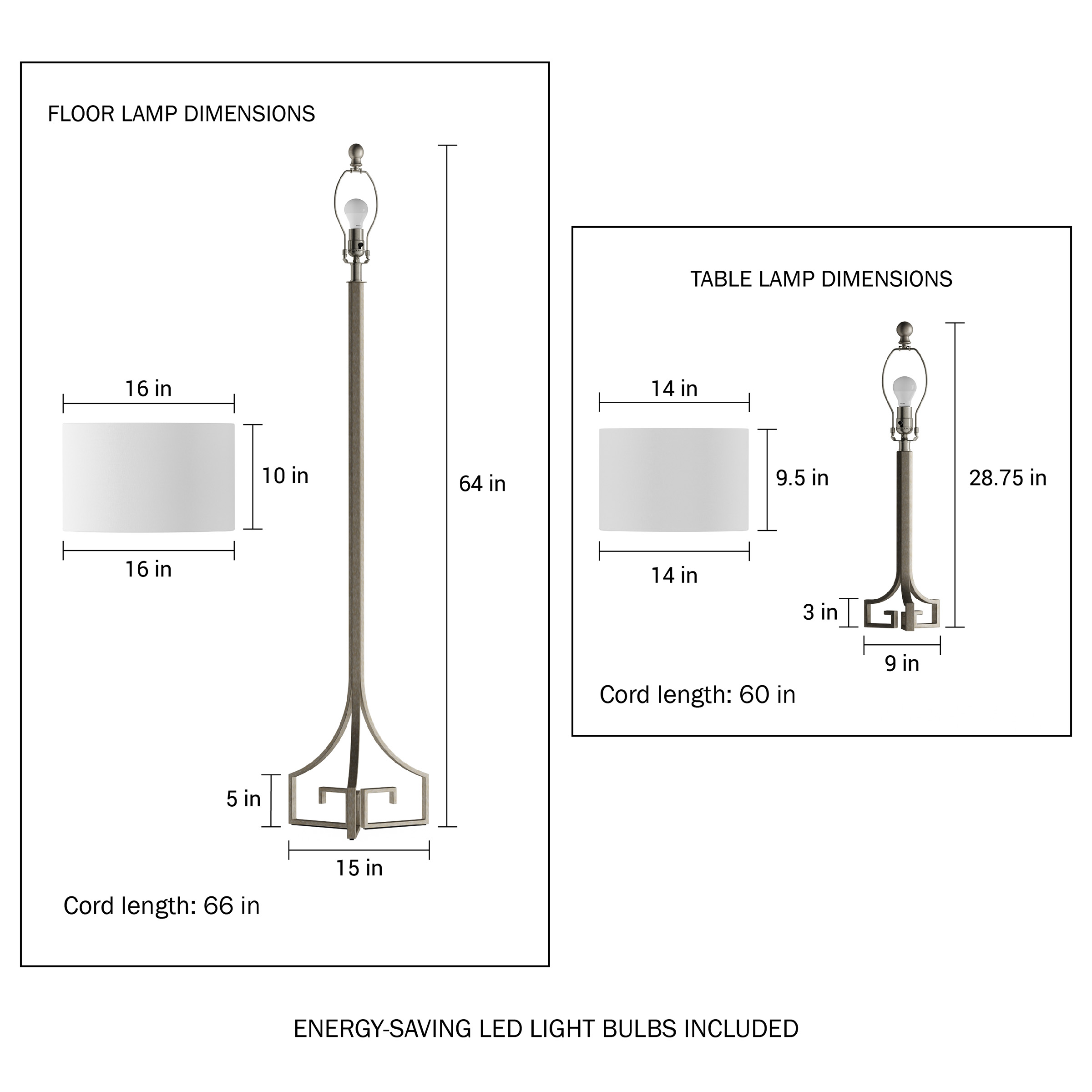 STYLISH DESIGN – The lamp body features a unique metalwork design with an antique silver finish. The Greek key design is a symbol of friendship, unity, and love, while the elegant silhouette is sure to add style to any bedroom, office, or living room! MATCHING 3-PIECE SET – With two table lamps and one-floor lamp included, you can place the lamps separately in different rooms or utilize the matching set in one room for a more consistent look. The crisp ivory drum shades will complement any décor. ENERGY EFFICIENT LIGHTING – The set includes 3 replaceable 60-Watt equivalent, 805lumens 9W LED light bulbs. The bulbs are ETL listed and each has a 25,000-hour life span. ATTRACTIVE AND DURABLE – The UL-listed lamps are constructed with high-quality materials and are built to stand the test of time. These lamps are sure to add a touch of glamour to any room and will beautifully illuminate your home for many years to come. PRODUCT DETAILS – Materials: Steel; Poly-Cotton blend. Table Lamp: 14” L x 14” W x 28.75” H. Shade: 14” L x 14” w x 9.5” H. Cord: 60” L. Floor Lamp: 16” L x 16” W x 64” H. Shade: 16” L x 16” W x 10” H. Cord: 66” L. Colors: Antique Silver and Ivory.
