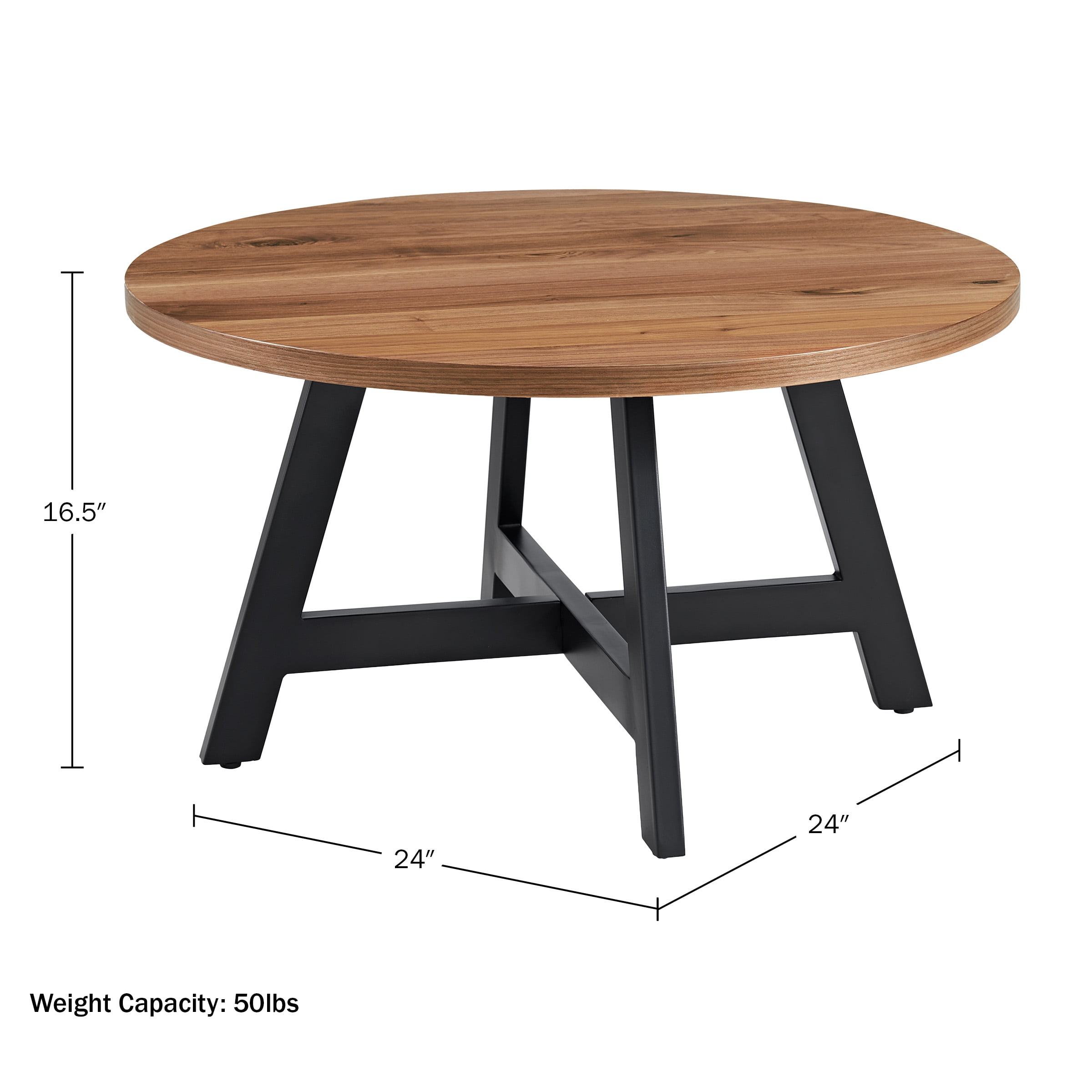 Lavish Home Industrial Modern Round Coffee Table with Metal Base, Walnut Living Room Table – This round coffee table is perfect for your home, office, dorm room, or as a stylish addition in front of your sofa Durable Design – Features a sturdy metal base and a durable MDF top, providing the ideal height for drinks, magazines, or remotes while relaxing on the couch Modern Style – Showcases a black base and an attractive walnut-finished tabletop, making it a chic choice for small homes, apartments, or dorms Versatile Use – This minimalist industrial coffee table is not only great for living rooms but also serves well in offices or as a craft table in playrooms Materials – Constructed from MDF and metal for lasting durability Dimensions – Measures (L) 24” x (W) 24” x (H) 16.5”, with a weight capacity of 50 lbs Color – Features a walnut-finished top paired with a black base