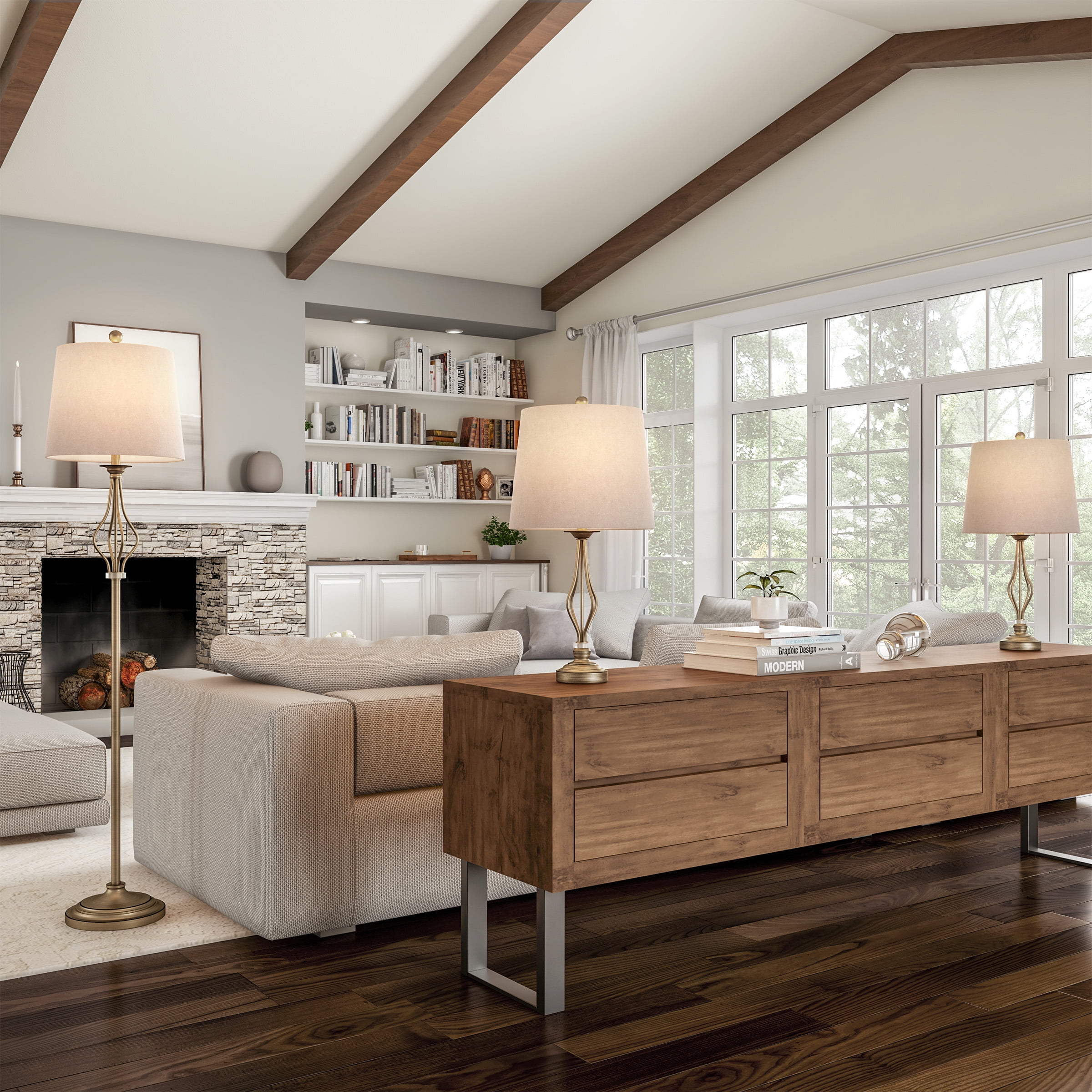 STYLISH DESIGN – The lamp body features a unique metal openwork with a graceful curve design in a distressed gold finish. The elegant silhouette is a stylish touch for side tables or nightstands, in your entryway, living room, bedroom or office. MATCHING 3-PIECE SET – With two table lamps and a standing floor lamp included, you can place them separately in different rooms or utilize them in one room for a more consistent look. The included linen shades are sure to complement any décor. ENERGY EFFICIENT LIGHTING – The set includes 3 replaceable 60-watt equivalent, 805 lumens 9W LED light bulbs. The bulbs are ETL-listed and each has a 25,000-hour lifespan. ATTRACTIVE AND DURABLE – The UL-listed lamps are constructed with high-quality materials and are built to stand the test of time. These lovely lamps will beautifully illuminate your home for many years to come. PRODUCT DETAILS – Materials: Steel, Acrylic and Linen. Table Lamp: 13″ L x 13″ W x 27″ H. Shade: 13″ L x 13″ W x 9.5″ H. Cord: 60″ L. Floor Lamp: 14″ L x 14″ W x 61.5″ H. Shade: 14″ L x 14″ W x 9.5″ H. Cord: 66″ L. Colors: Distressed Gold, Natural Linen.