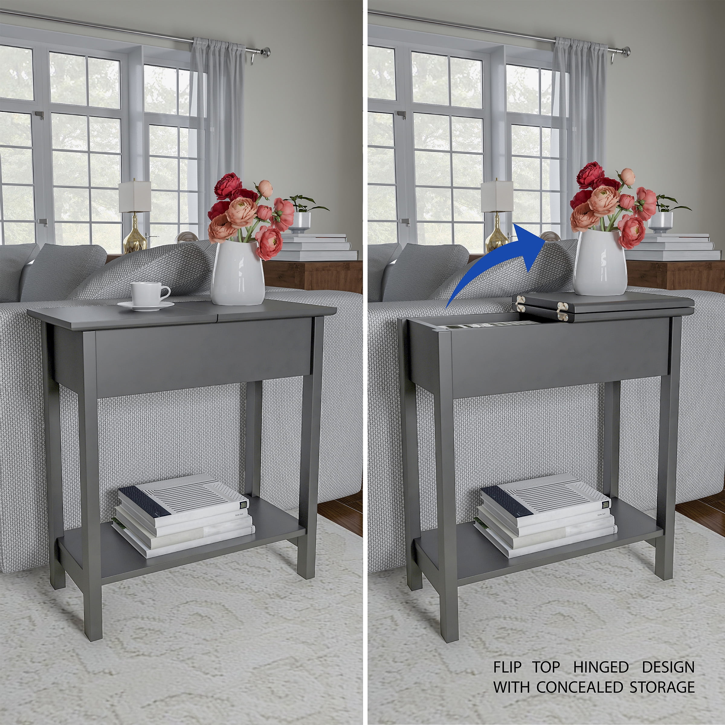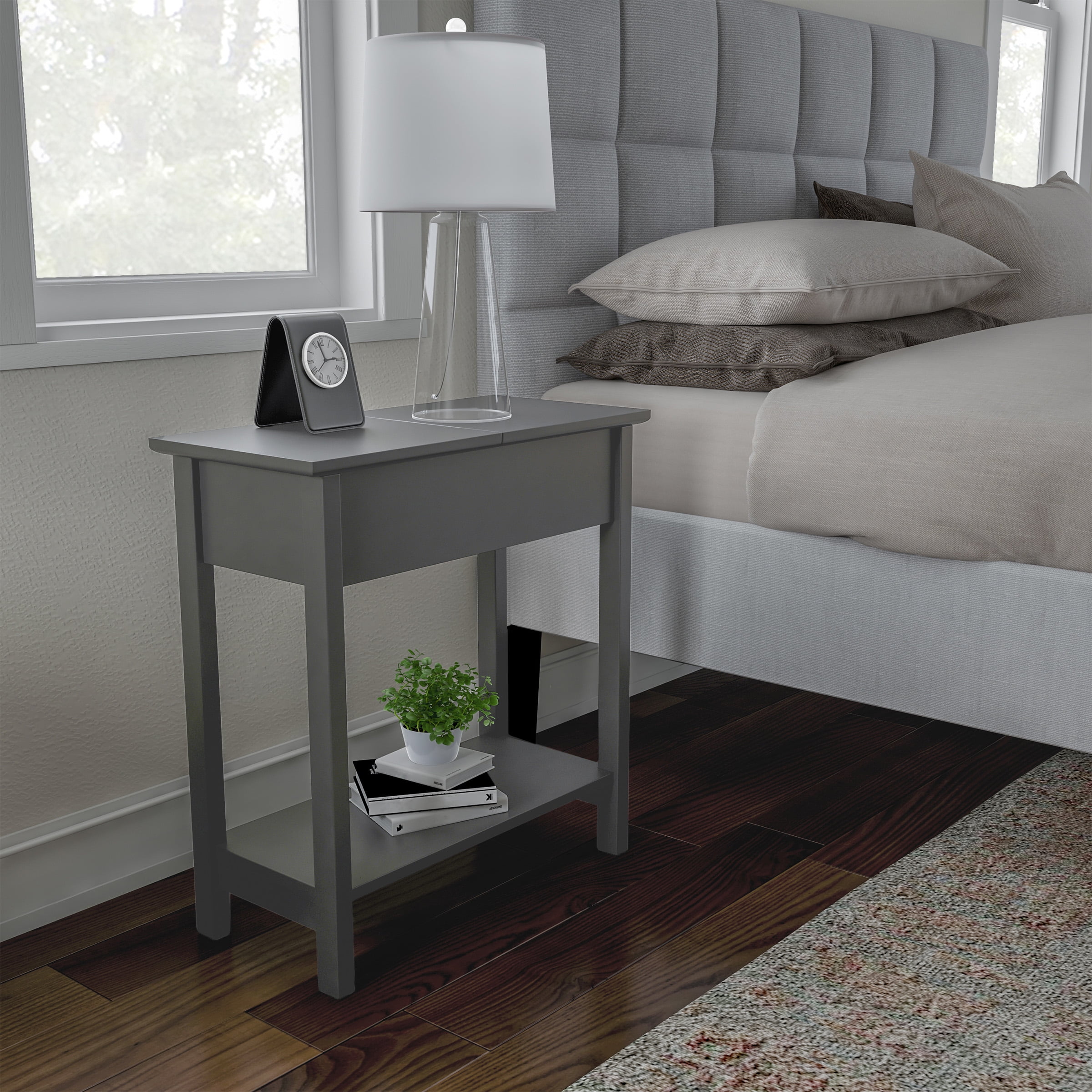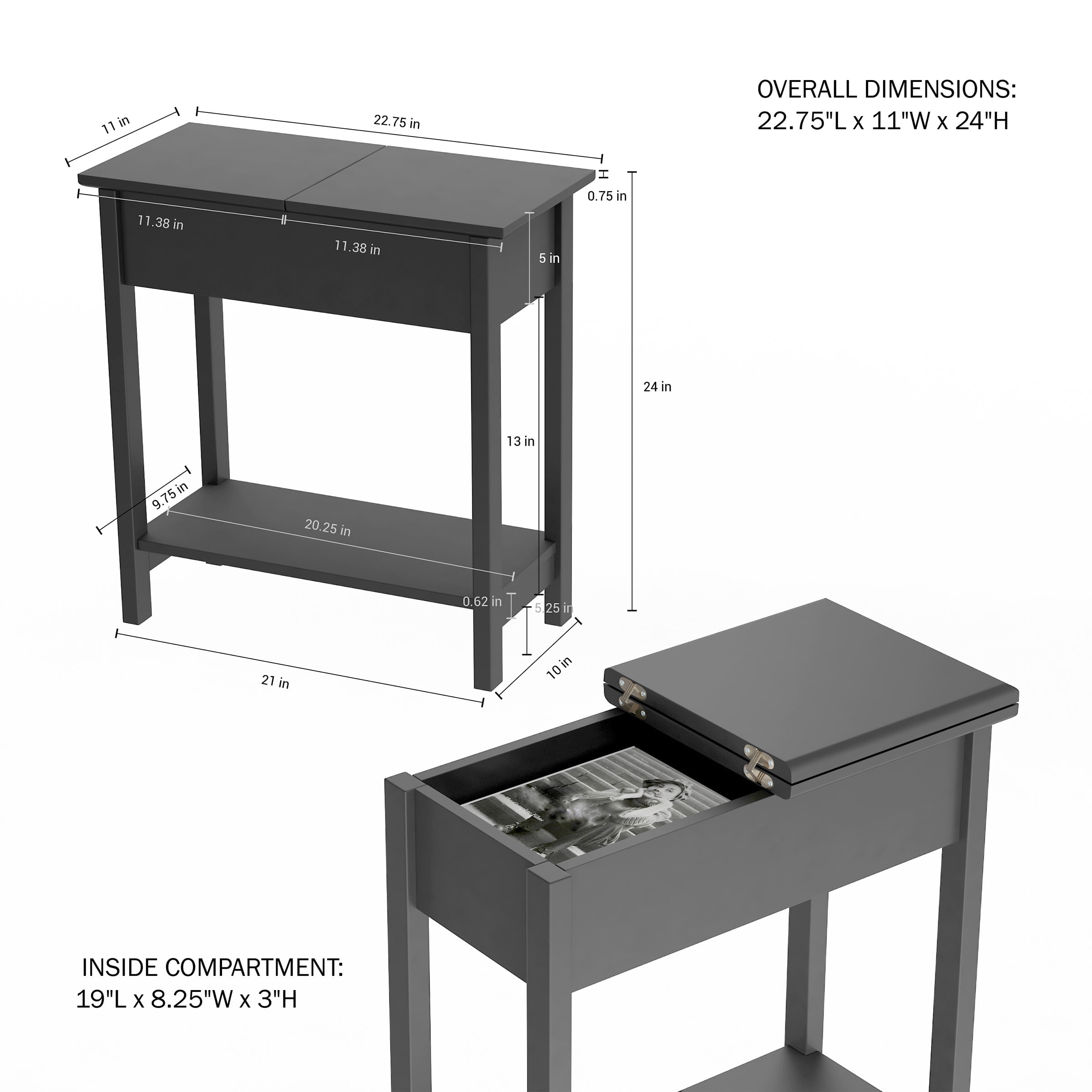 FLIP TOP SIDE TABLE – The end table is equipped with a spacious inner compartment that can be accessed by flipping open the hinged top. Store remotes, notepads, and more! LOWER SHELF – The side table also has a lower shelf for additional storage. EASY TO ASSEMBLE – With all assembly hardware included, this accent table can be put together with ease. FOOT PADS – The table legs have foot pads to protect your floors. DURABLE MATERIALS – Constructed from MDF, this side table is sure to last. WEIGHT CAPACITY – Total weight capacity of 44 pounds; 22 pounds on a tabletop, 11 pounds in the drawer, and 11 pounds on the lower shelf. DIMENSIONS – (L) 22.75”x (W) 11”x (H) 24”. COLOR – Gray. Versatile Durable