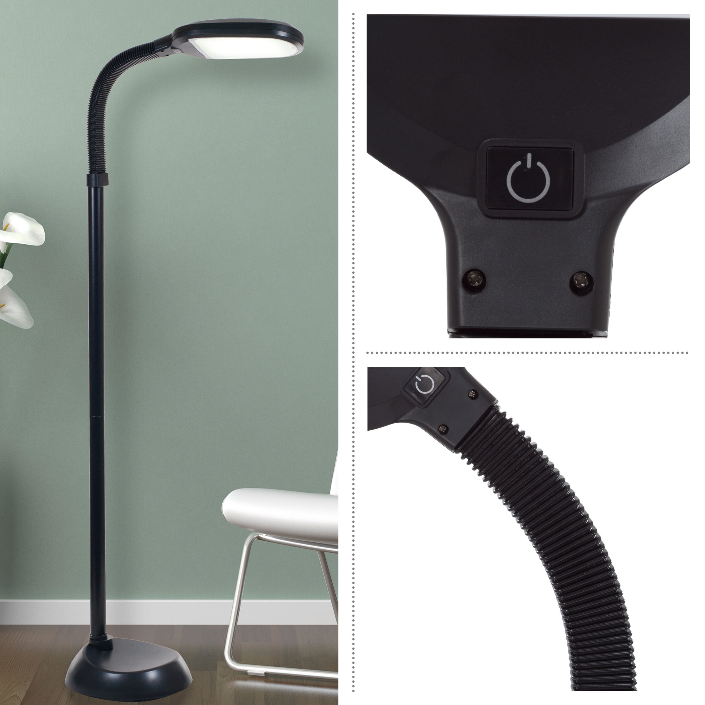MODERN FLOOR LAMP – This stylish standing lamp has a modern black finish with a matching 64-inch-long cord and simple touch on/off button on the lamp head for straightforward use. IMITATES NATURAL LIGHT – Equipped with a 17W LED bulb with a 5000K color temperature, this lamp for living room projects bright natural light, helping to eliminate eye stress and fatigue. DIMMABLE – The included energy-saving LED bulb can be dimmed using the touch power button to 4 brightness settings to cater to your various lighting moods. MULTI-DIRECTIONAL – The gooseneck arm on the LED light provides flexible height adjustment from 50.2-inches to 62.5-inches-tall when completely straight with unlimited angle choices. MATERIALS – Plastic and Metal. DIMENSIONS – Straight Neck: (L) 10.2” x (W) 8.7” x (H) 62.5”; Angled at 90-Degrees: (H) 50.2”; Cord Length: 64”. Voltage: 120V. COLOR – Black.