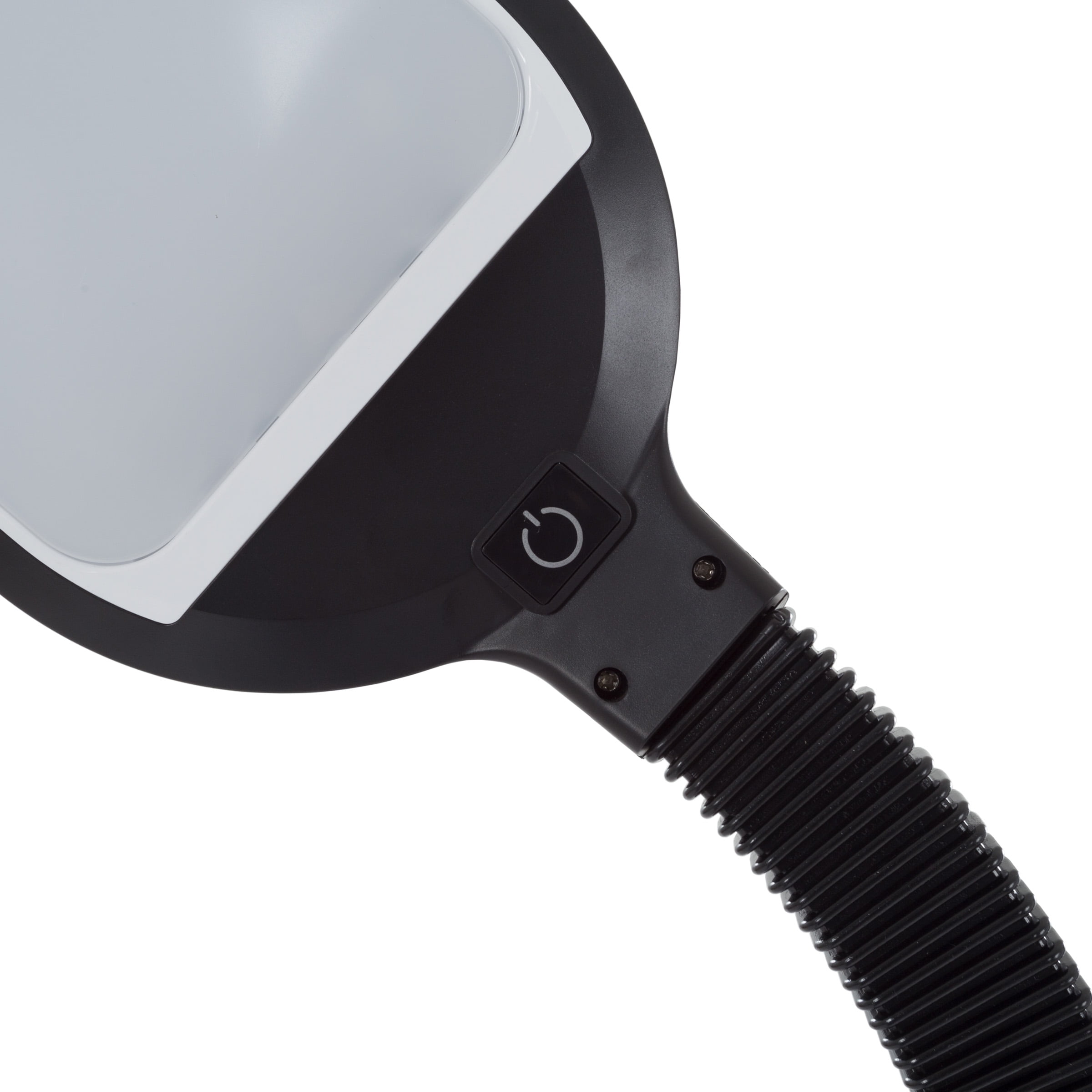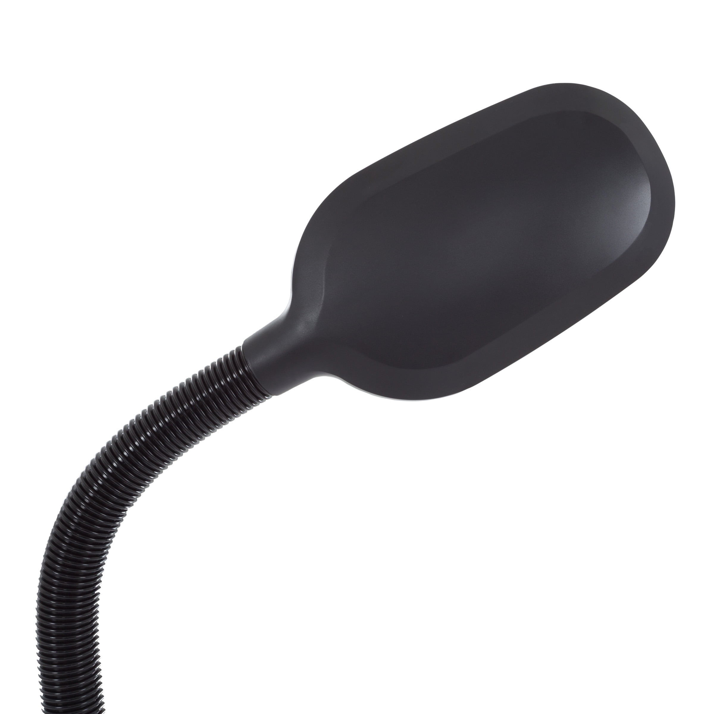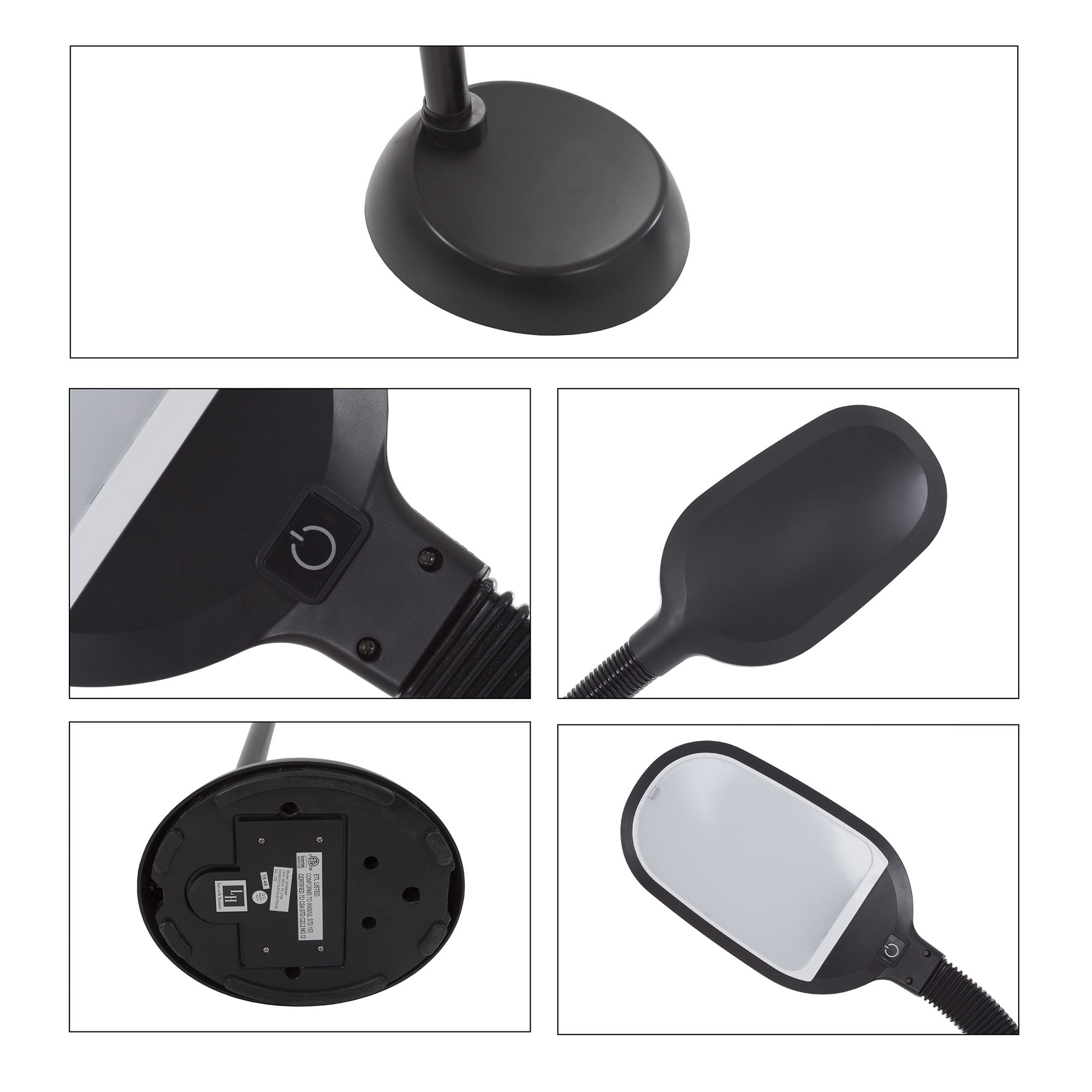 MODERN FLOOR LAMP – This stylish standing lamp has a modern black finish with a matching 64-inch-long cord and simple touch on/off button on the lamp head for straightforward use. IMITATES NATURAL LIGHT – Equipped with a 17W LED bulb with a 5000K color temperature, this lamp for living room projects bright natural light, helping to eliminate eye stress and fatigue. DIMMABLE – The included energy-saving LED bulb can be dimmed using the touch power button to 4 brightness settings to cater to your various lighting moods. MULTI-DIRECTIONAL – The gooseneck arm on the LED light provides flexible height adjustment from 50.2-inches to 62.5-inches-tall when completely straight with unlimited angle choices. MATERIALS – Plastic and Metal. DIMENSIONS – Straight Neck: (L) 10.2” x (W) 8.7” x (H) 62.5”; Angled at 90-Degrees: (H) 50.2”; Cord Length: 64”. Voltage: 120V. COLOR – Black.