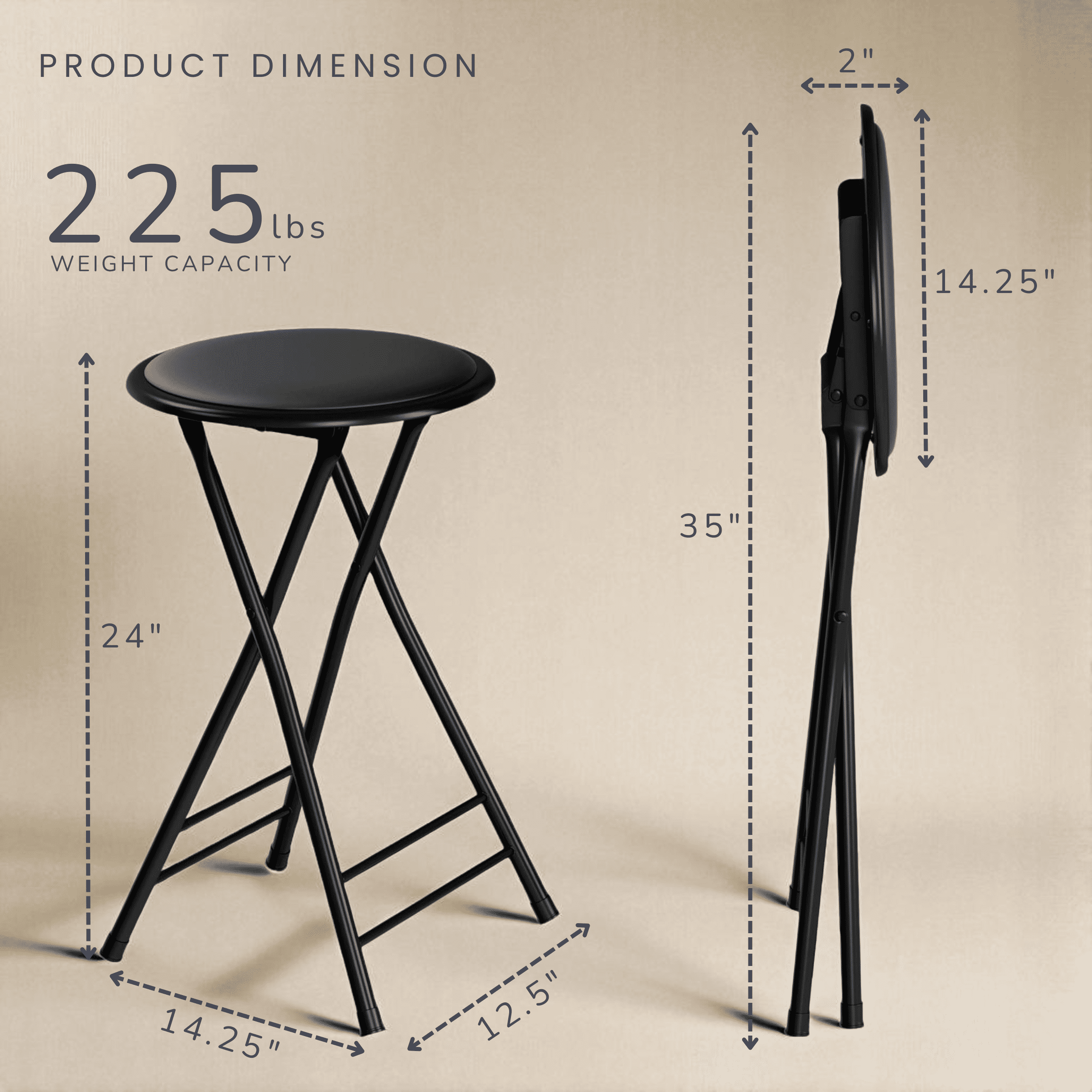 SET OF 2 – The two-piece 24-inch bar stools set fold flat for convenient storage in tight spaces when they aren’t being used. Each portable stool measures just 14.25-inches-wide, making it perfect for dorms, apartments, or small kitchens. 225-POUND CAPACITY – The base of these foldable bar stools is constructed from sturdy steel tubing for strength and durability. The heavy-duty frame and 225-pound weight limit mean the vanity stools are suitable for both kids and adults. EASY TO CLEAN – Each foldable stool has extra-thick PVC cushioning to provide a comfortable seat. The PVC covers are easy to clean with a soft, damp cloth or sponge and soapy water. The seats should be dried completely before their next use. PORTABLE – The stools for kitchen counter are designed to be lightweight and compact enough to easily take anywhere. Once folded, the folding chairs with padded seats easily fit in most vehicles for convenient travel to parties or performances. MATERIALS – PVC and Steel. For Indoor Use Only. DIMENSIONS – (L) 14.25” x (W) 12.5” x (H) 24”; Folded: (L) 14.25” x (W) 2” x (H) 35”; Seat Diameter: 14.25”. COLOR – Black.