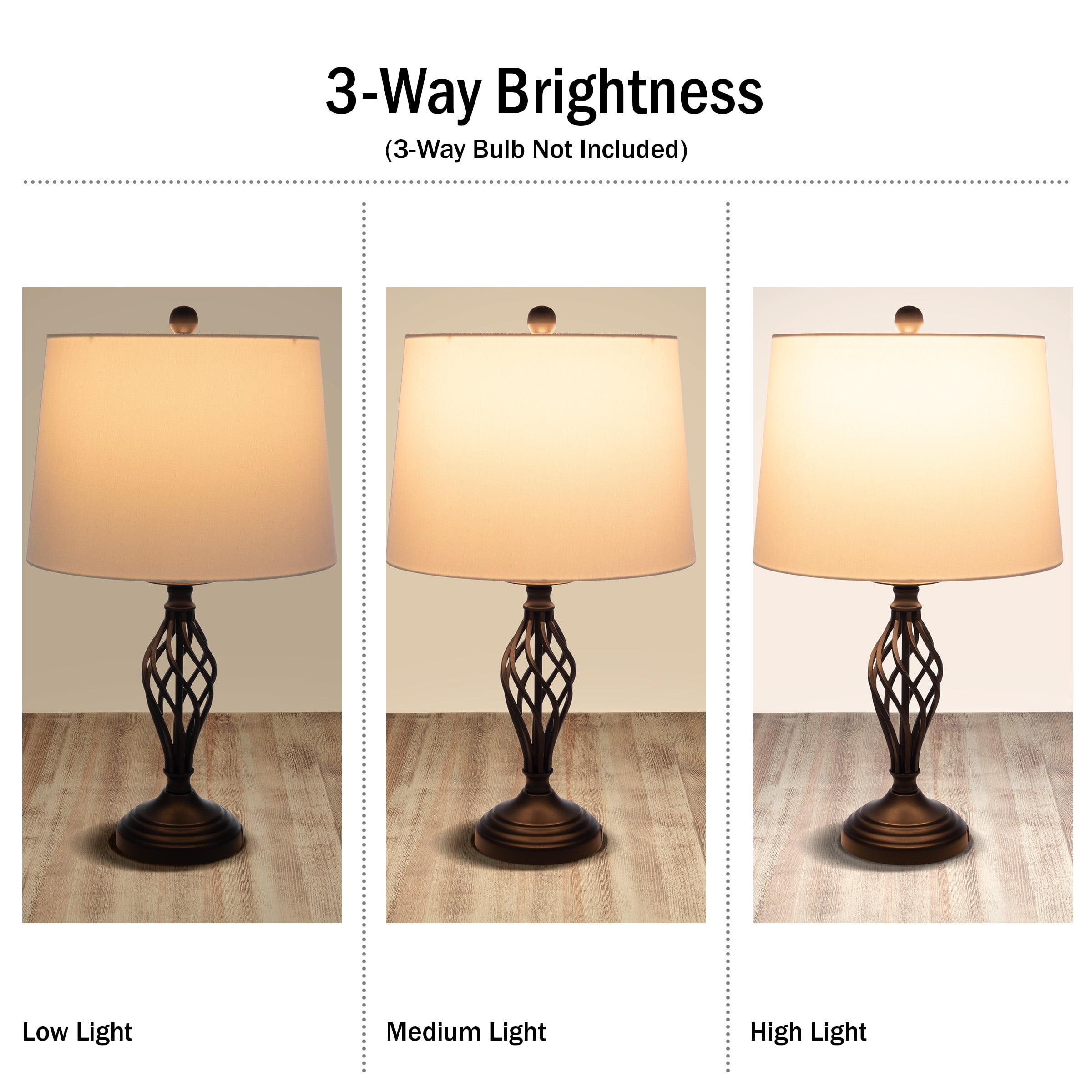 NIGHTSTAND LAMPS SET OF 2 – This set of 2 bedroom lamps complements your home décor when placed separately in different rooms or as a matching pair on living room end tables or nightstands. ENERGY-EFFICIENT – The table lamps come equipped with 2 energy-efficient 9W LED bulbs, and a separate 3-way bulb can be purchased for different light modes. BUILT-IN USB PORTS – This LED lamp set has a built-in USB charging port for charging smartphones, electronic reading devices, or other electronic devices. STYLISH MODERN LAMPS – These table lamps feature a spiral cage design that adds a modern touch to side tables or nightstands in your living room, bedroom, entryway, or office. MATERIALS – Metal and Linen. DIMENSIONS – (L) 13.98″ x (W) 13.98″ x (H) 24.41″; Shade: (L) 14” x (W) 12” x (H) 10”; Cord Length: 5’. COLOR – Black.