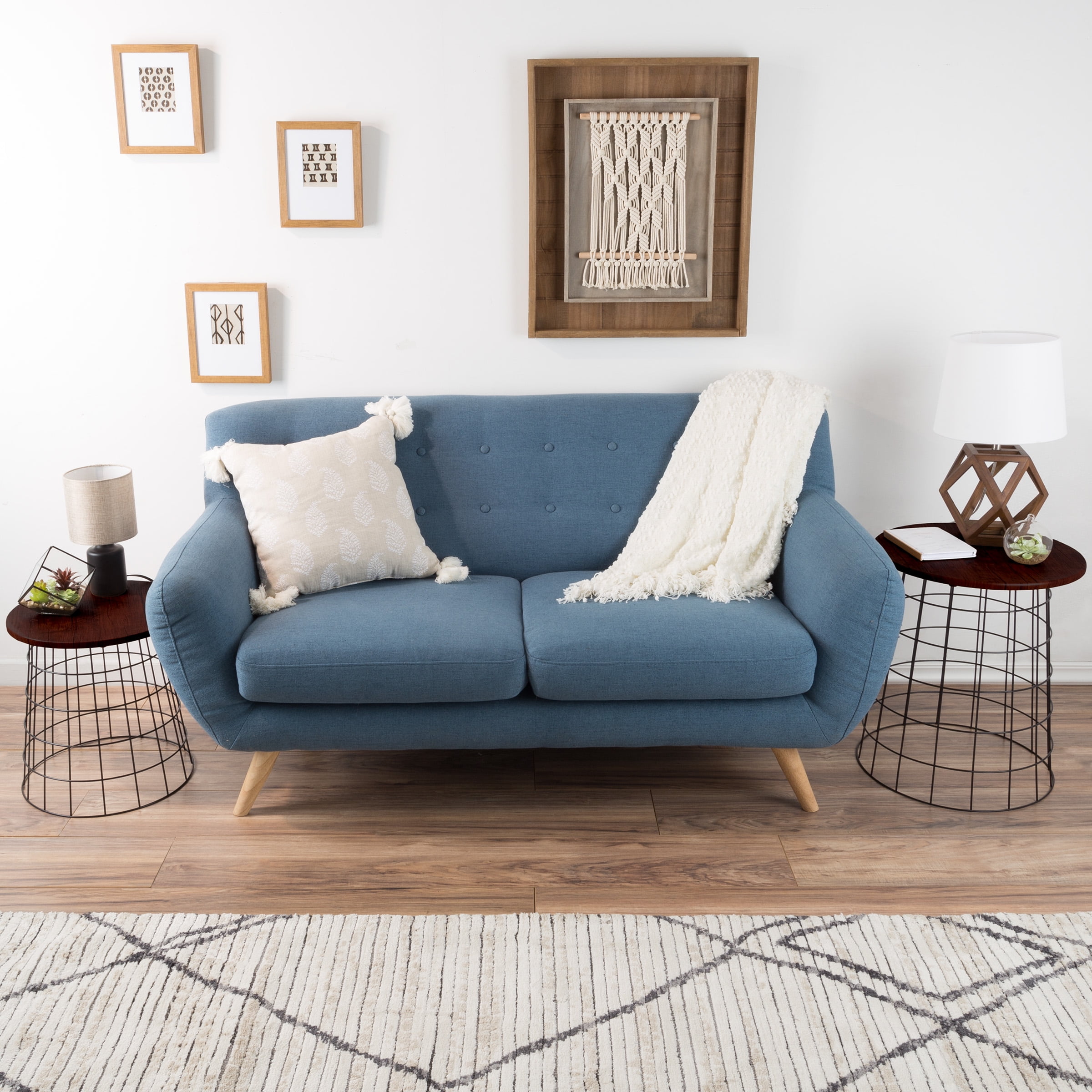 PERFECT ACCENT- The decorative side tables add style to small spaces in any home or office. The square pattern on the basket and woodgrain look on the veneer lid offer a fresh take on openwork design for rustic industrial or modern farmhouse decor. DECORATIVE STORAGE- This multifunctional set with a table and storage basket all-in-one, can be used as a tray table, decorative basket, or storage bin. It has a removable lid and ample storage room in the basket for books, blankets, games, toys, and more. SMART DESIGN -The caps on the bottom of the lid allow it to lock in place on the basket 2 ways, basket right side up or down, which can create different looks and decor styles! This set can work for both adult or kid spaces and nests for easy storage. SOLID BUILD-This modern end table set is constructed of durable metal with a patterned construction and a high-quality MDF wooden top with wood grain veneer. Maximum weight capacity: Small- 50lbs and Large- 90lbs. PRODUCT DETAILS- Material: MDF, Veneer, Metal. Dimensions: Large= Lid- 17.5” (D) x .5”(H), Basket- top 17”(D), bottom base 13”(D), 20.5”(H). Small= Lid- 15.5(D) x .5” (H), Basket- top 15” (D), bottom base 11” (D), 16” (H). Color: Cherry woodgrain look. Versatile Durable