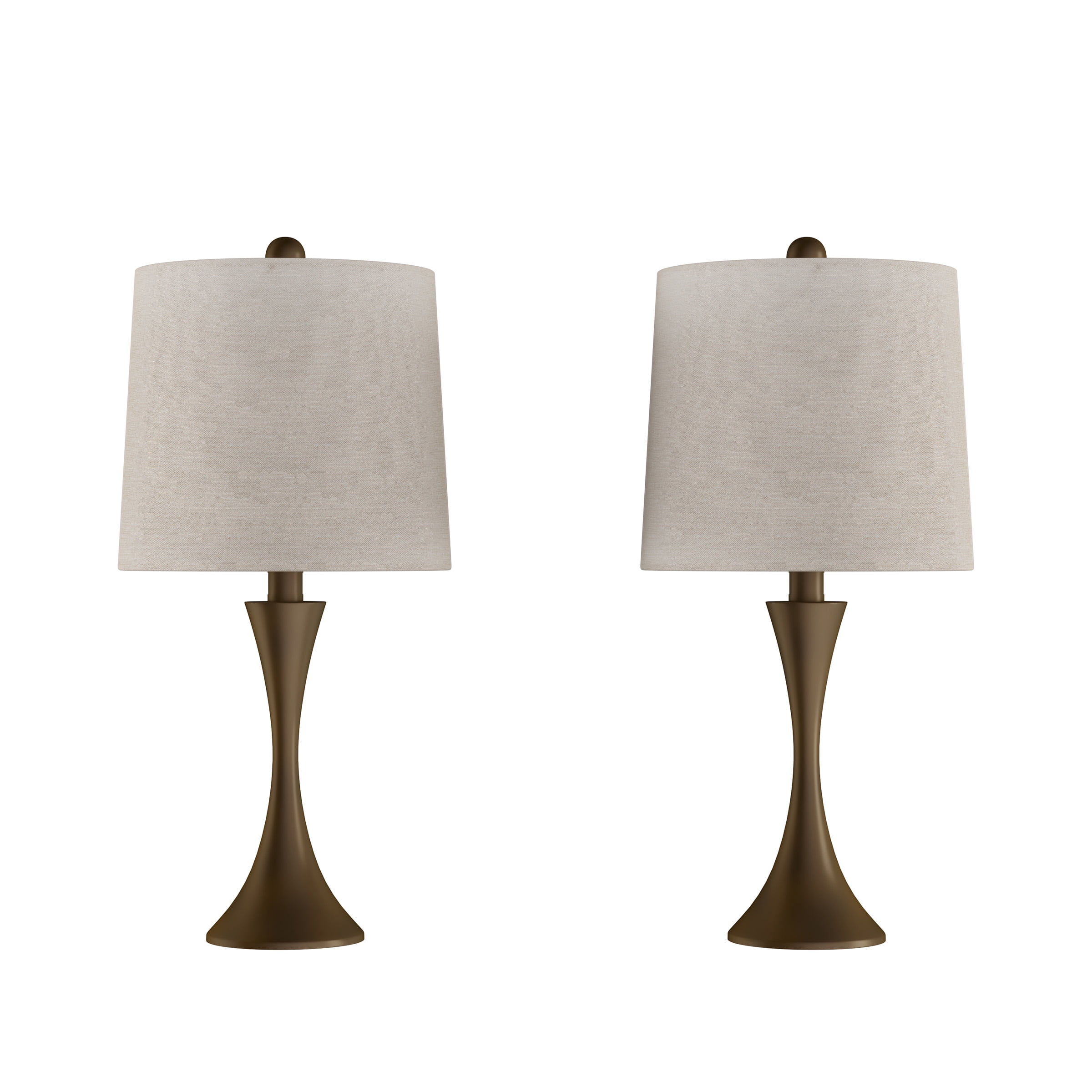Add a mid-century modern style to your living room, bedroom, entryway, or office with this matching Set of 2 Metal Flared Table Lamps by Lavish Home. Conveniently, this set of two trumpet-shaped bedroom lamps for nightstands, consoles, and end tables comes with energy-saving 9W LED bulbs that provide your home or office with plenty of warm ambient lighting for up to 25,000-hours. Each matte bronze-finished living room lamp set comes with natural linen shades to complement your home decor for many years to come.