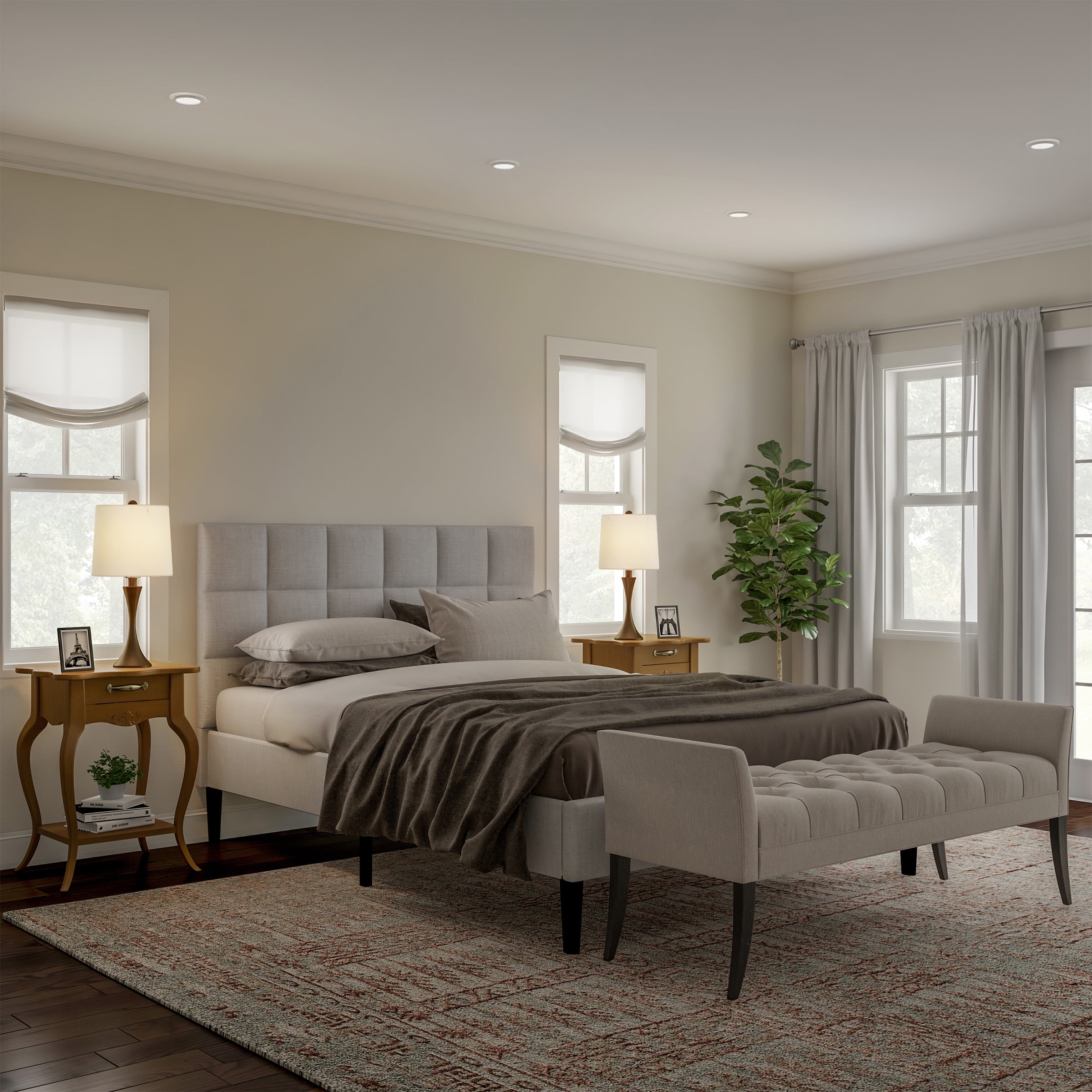 SET OF 2 SIDE TABLE LAMPS – For a consistent look, place these bedroom lamps as a matching pair in one room or individually in two different rooms to add lighting wherever needed. STYLISH DESIGN – Each bedside lamp’s flared trumpet-shaped base and matte bronze finish add a chic, modern touch to any living room, bedroom, or office nightstand and side table. ENERGY-EFFICIENT LIGHTING – These bedside table lamps include two replaceable 9W LED light bulbs with a 25,000-hour lifespan to help save on energy costs throughout the year. ATTRACTIVE AND DURABLE – The base of each nightstand lamp is constructed of sturdy steel, and the natural shades are made from high-quality linen fabric to brighten your home. MATERIALS – Steel and Linen. DIMENSIONS – (L) 11″ x (W) 11″ x (H) 24.5″; Shade: (W) 11″ x (H) 9.75″; Cord: (L) 60″. COLOR – Matte Bronze and Natural Linen.