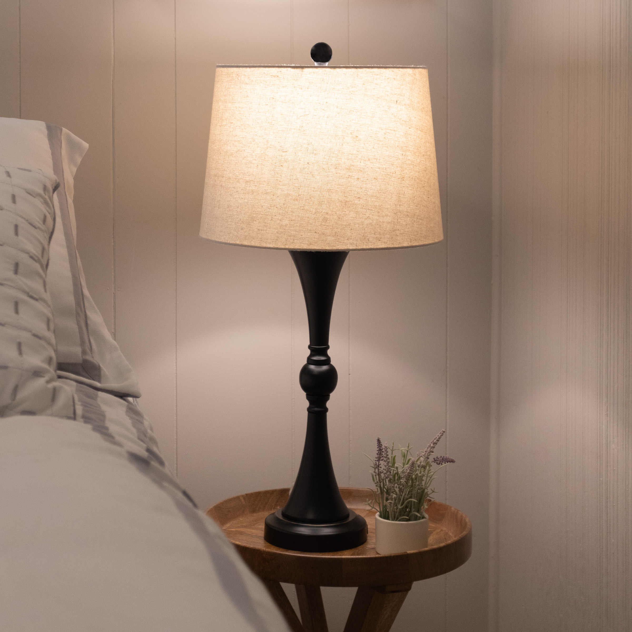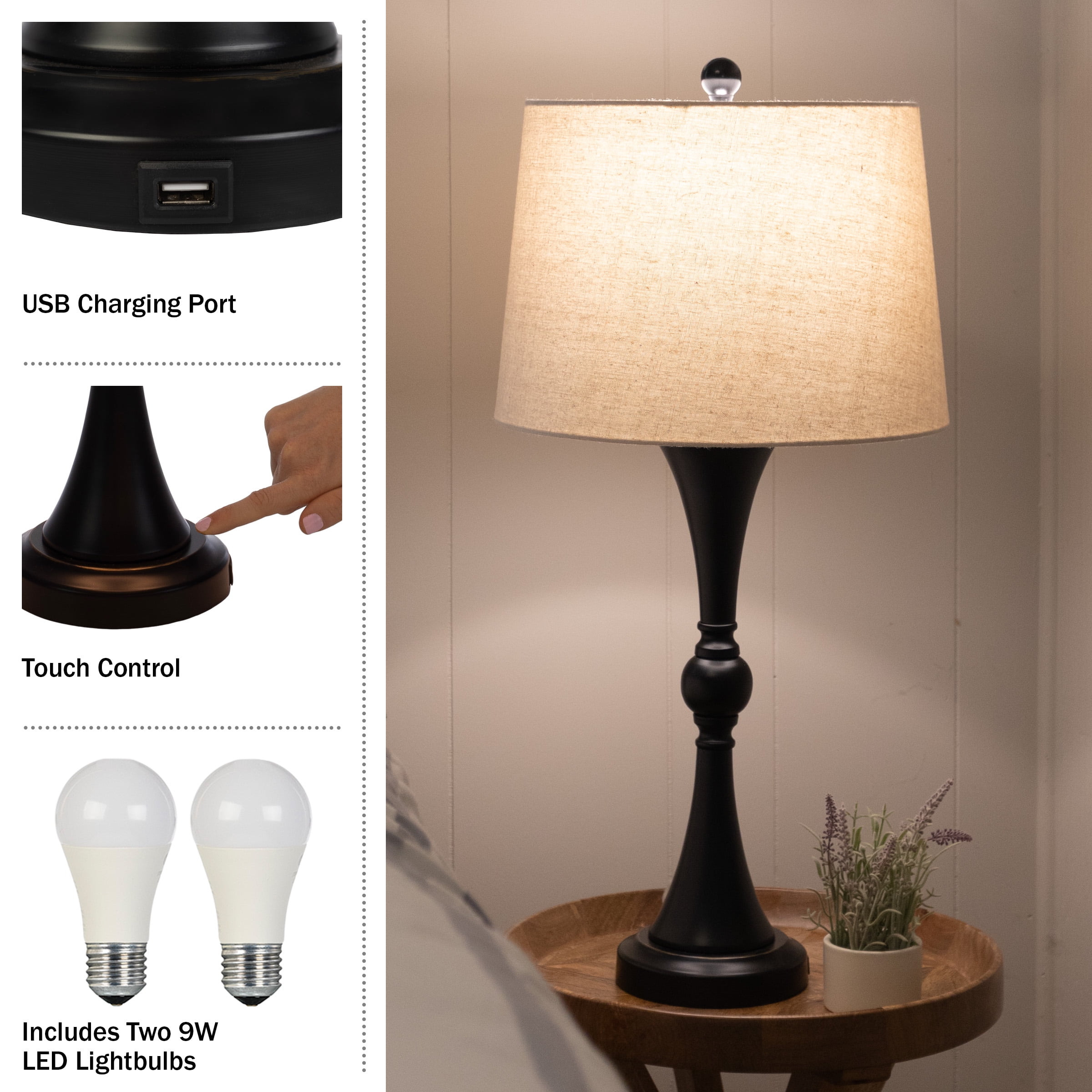 Illuminate your living room, bedroom, entryway, or home office with the Bedside Lamps Set of 2 by Lavish Home. This table lamp set comes with 2 matching lamps with an attractive black finish and linen shades for a cohesive look in any area of your home. Each desk lamp comes equipped with an energy-efficient 9-Watt LED light bulb, a USB charging port that is built-into the base of each lamp for functional room décor and turns on/off using touch control. Use this lamp set in your home office, in the living room on end tables, in the hallway or entryway, or in your bedroom as bedside lamps.