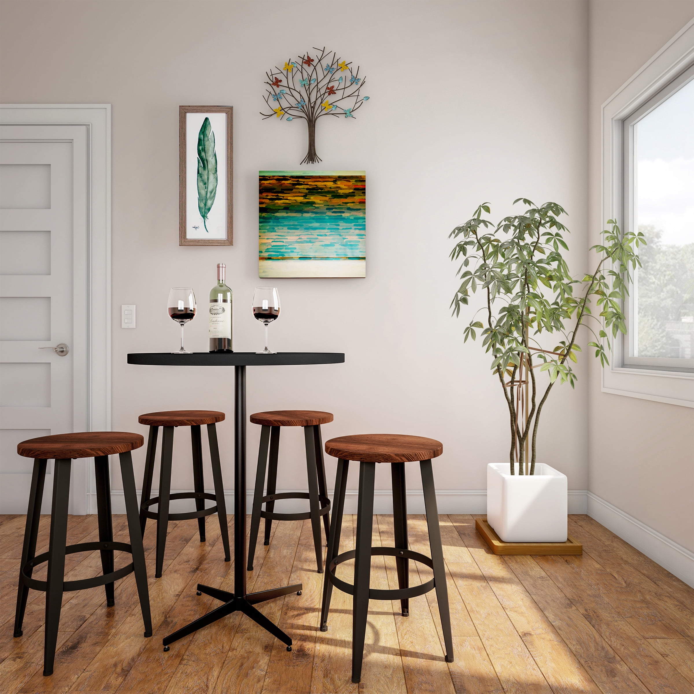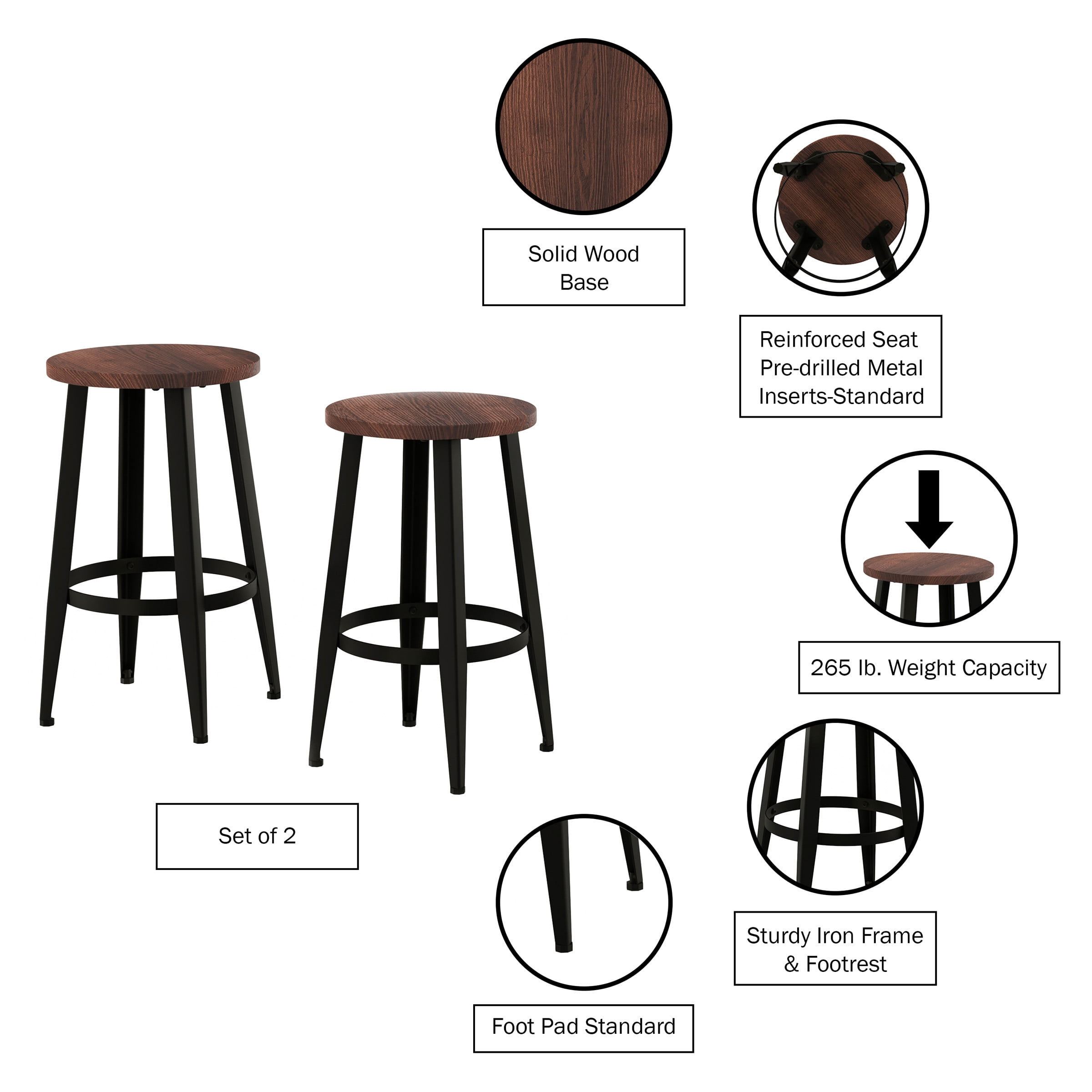 EASY COORDINATION – These counter-height bar stools come in packs of two for easy planning when redecorating kitchens, entertainment spaces, and breakfast nooks. QUALITY CONSTRUCTION – Sturdy iron frames and tough elm wood seats ensure these counter-height bar stools dependably support up to 265 pounds for versatile seating. FASHIONABLE FURNISHINGS – Coffee-colored metal legs and dark walnut-stained wood seats help these counter stools fit seamlessly with most palettes. EASY ASSEMBLY – These stools for kitchen counters and bars come with all the tools and hardware necessary for fast setup and near-immediate use. MATERIALS – Powder-Coated Iron Frames and Elm Wood Seats. DIMENSIONS – (L) 13″ x (W) 13″ x (H) 24″. COLOR – Coffee Frames with Dark Walnut-Stained Seats.