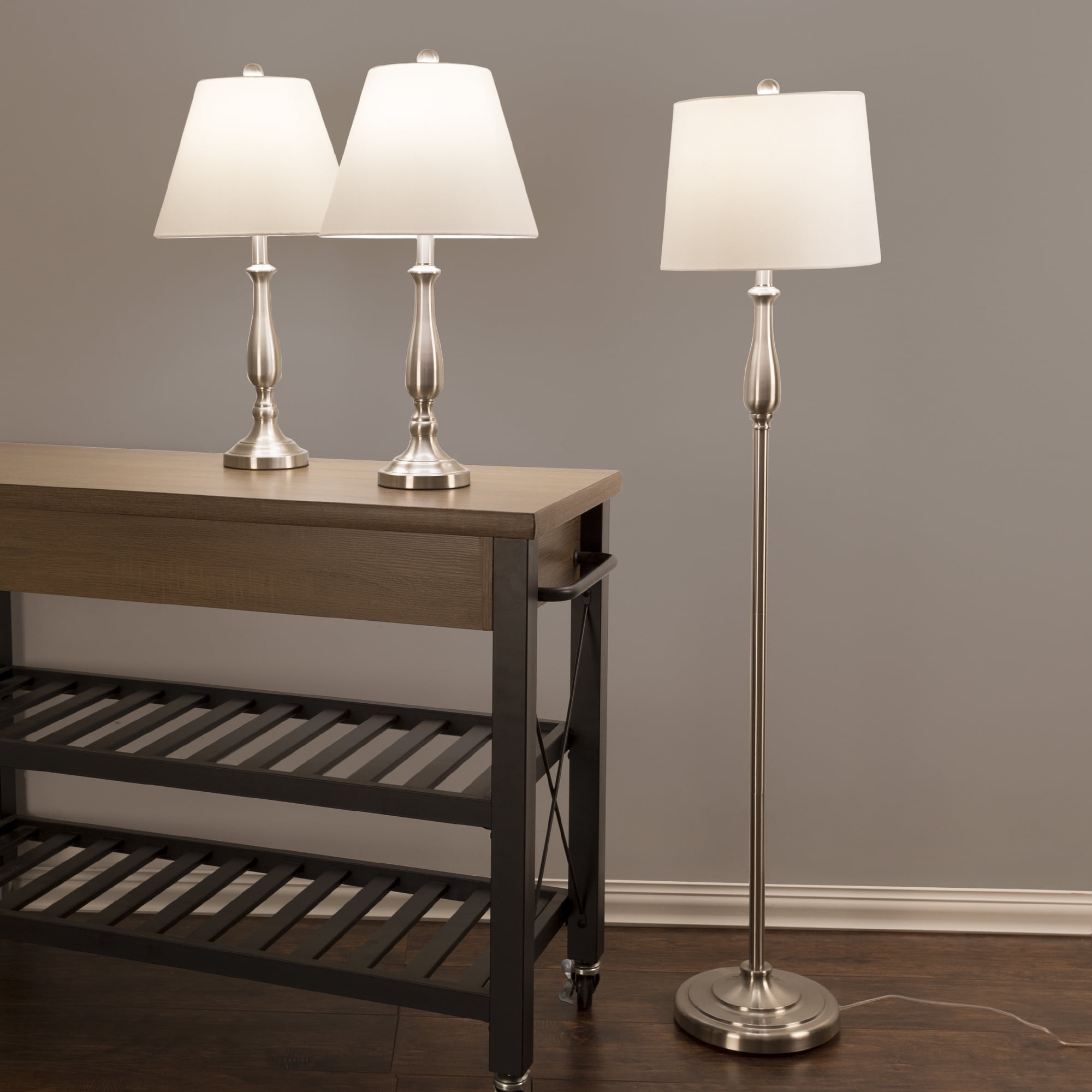 COHESIVE STYLE – The sleek transitional styling helps this three-piece lamp set blend beautifully with classic and contemporary furnishings alike. COORDINATED LOOK – This three-piece table and floor lamp set features a matching design to give your living space a polished, attractive appearance. EASY MATCHING – The white drum shades and brushed steel finish complement color schemes from basic and pastel to vivid and rich for fuss-free decor matching. ENERGY EFFICIENT – This three-way rotary switch lamp set includes three replaceable LED bulbs that last longer and use less energy than standard bulbs. MATERIALS – Fabric and Steel. DIMENSIONS – Table Lamps: (W) 13″ x (H) 25.5″ x 5.5″ Diameter Base; (L) 60″ Cord; Floor Lamp: (W) 13″ x (H) 59.5″ x 10″ Diameter Base; (L) 76″ Cord. COLOR – White Shades and Brushed Steel Finish.