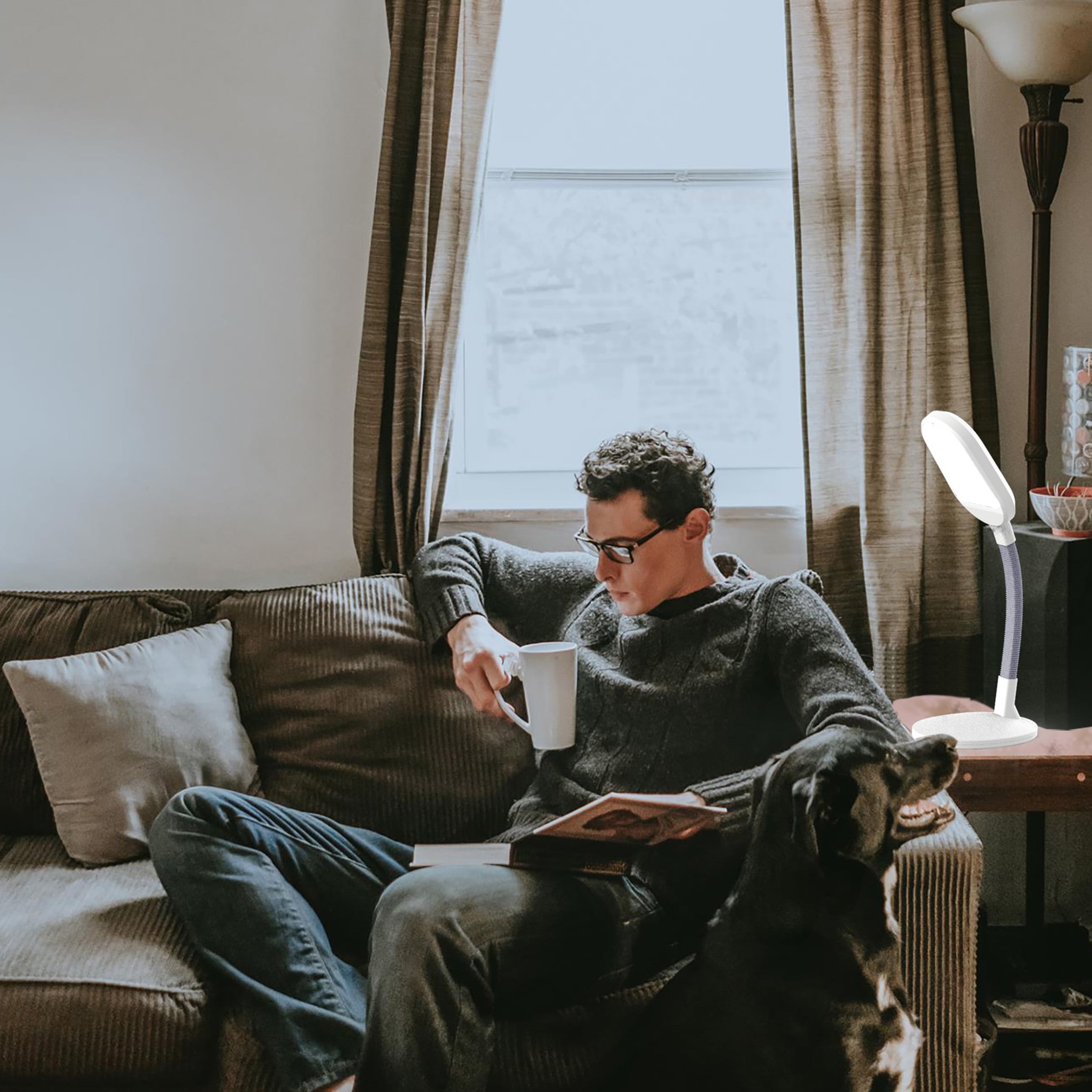 SUNLIGHT DESK LAMP – The LED light mimics natural lighting from the sun to provide ideal illumination for reading, crafting, working, and other tasks that require bright lighting. EMITS NATURAL LIGHT – This 14-Watt LED lamp provides bright light in a natural hue that makes it easier to see while reducing eye stress and can also help combat seasonal depression. MULTI-DIRECTIONAL – The adjustable gooseneck on this desk light makes it easy to angle and point the light exactly where you need it, ideal for close-up work like reading fine print or detailed projects. CONVENIENT FEATURES – This reading lamp features a touch power button with 4 brightness settings to shed light on tabletop tasks, puzzles, or sewing or knitting projects. MATERIALS – Plastic and Metal. DIMENSIONS – (L) 7″ x (W) 9.5″ x (H) 26″; Cord Length: 67″. Voltage: 120V. 50/60 Hz 0.35A Max. 2-Prong AC Adapter. COLOR – White.