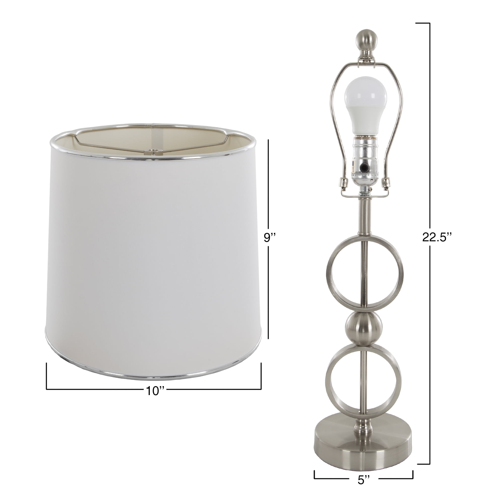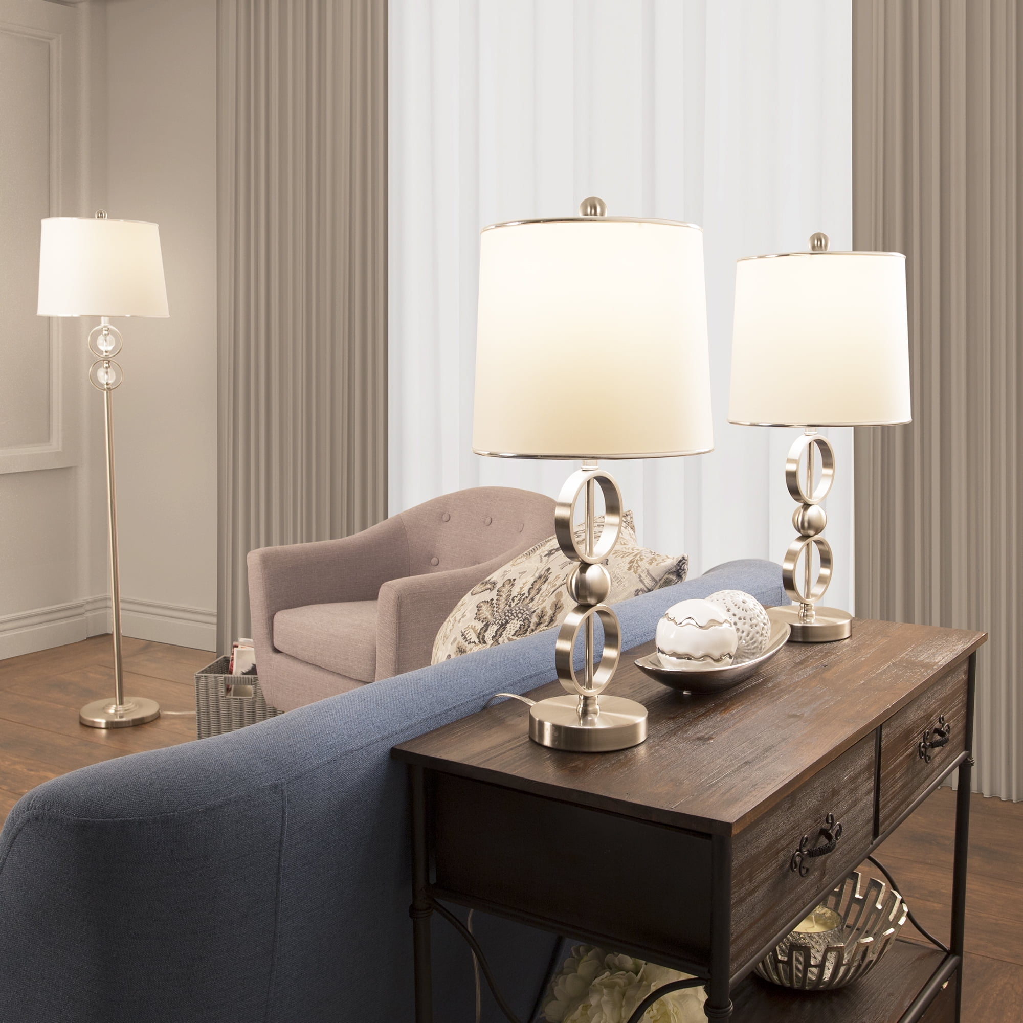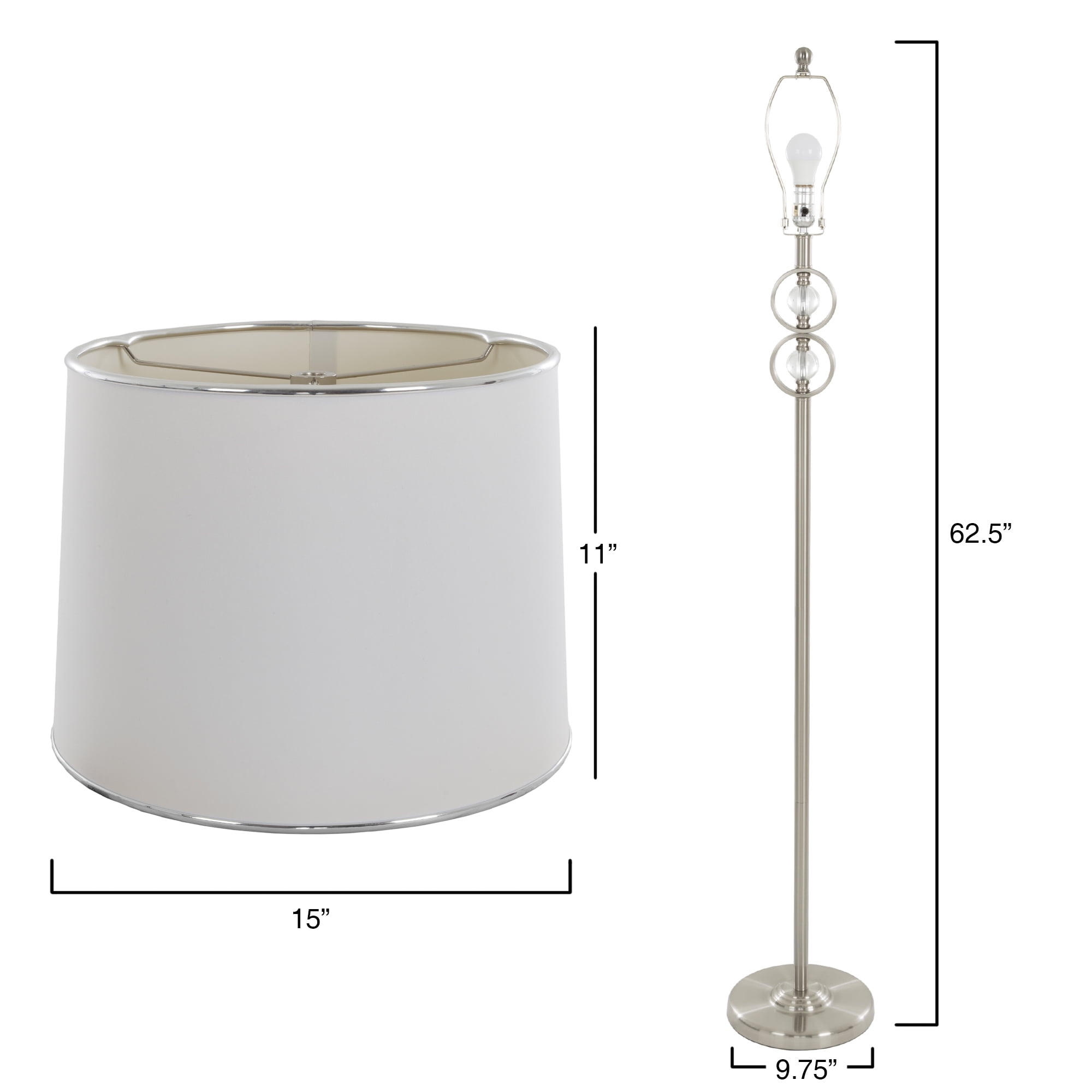 COHESIVE TRANSITIONAL STYLE – Each lamp is topped with a crisp white fabric drum shade with slim chrome edging. The lamp body features an open circle design in brushed steel finish. The floor lamp also includes glass crystal ball accents. Its modern silhouette can complement contemporary décor styles. Ideal for reading, illuminating a dimly lit corner, or enhancing the ambiance of any room. They will look right at home to complete your console in the entryway, your living room or office area. Use all three lamps in one room, or divide them up for use in several rooms in your home. ENERGY-EFFICIENT LIGHTING – Includes 3 replaceable LED light bulbs that last longer and use less energy than regular bulbs. Each LED bulb: 400 lumens, 3000 kelvin temperature, CE/RoHS certified, AC120v, 50/60 Hz. If you prefer regular bulbs, you can use up to a 100-watt incandescent bulb on the floor lamp and 60-watt on the table lamps. UL listed. MATCHING TABLE LAMPS DETAILS: Polyester/cotton blend Fabric Shade: 9“high x 10“diameter; Total lamp measures 22.5“high x 10“wide with a 5“diameter sturdy base; 68“clear cord. Two-way rotary switch. COORDINATING FLOOR LAMP DETAILS: 1 Polyester/cotton blend Fabric Shade: 11“high x 15“diameter; Total lamp measures 62.5“high x 15“wide with a 9.75“diameter sturdy base; 97“clear cord. Three-way rotary switch. 100% CUSTOMER SATISFACTION GUARANTEE – We are confident that the Lavish Home brand products are the highest quality and workmanship, however if you are not completely satisfied just return the item for a refund.