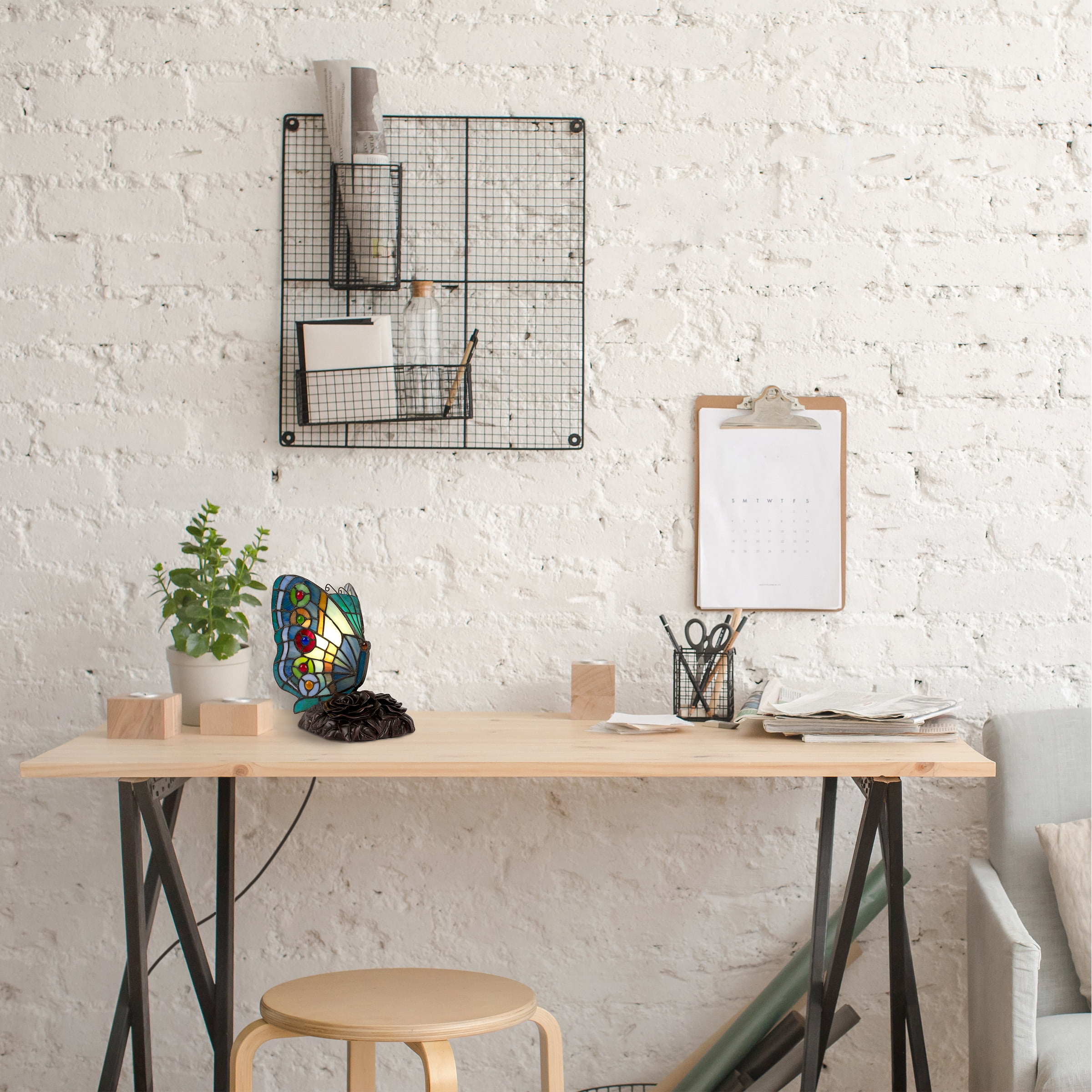 Add the charm of colorful glass with the Tiffany Style Butterfly Table Lamp by Lavish Home. This beautiful desk lamp is handcrafted with 128 stained glass pieces and 12 cabochon accents to make each piece truly unique. The UL listed LED desk lamp features a convenient on/off rotary switch and comes with a replaceable energy-saving candelabra style 4W LED lightbulb. This endearing vintage-look butterfly tiffany lamp is sure to provide a soft ambient glow that makes it perfect to use as a nightlight or as a delightful art accent for a side table or desk in your entryway, bedroom, living room, or office.