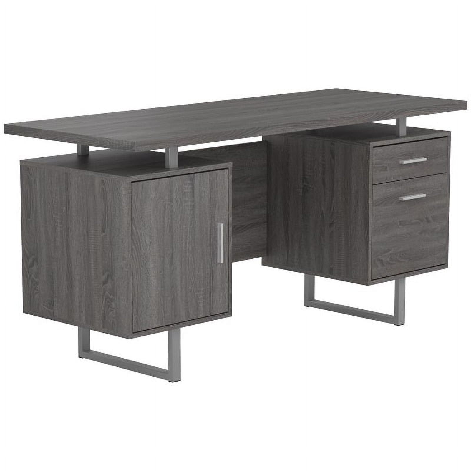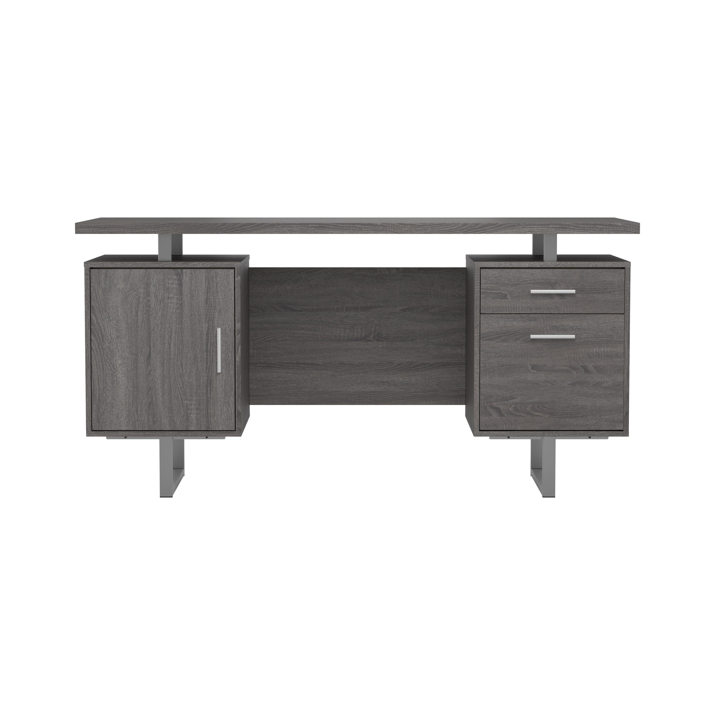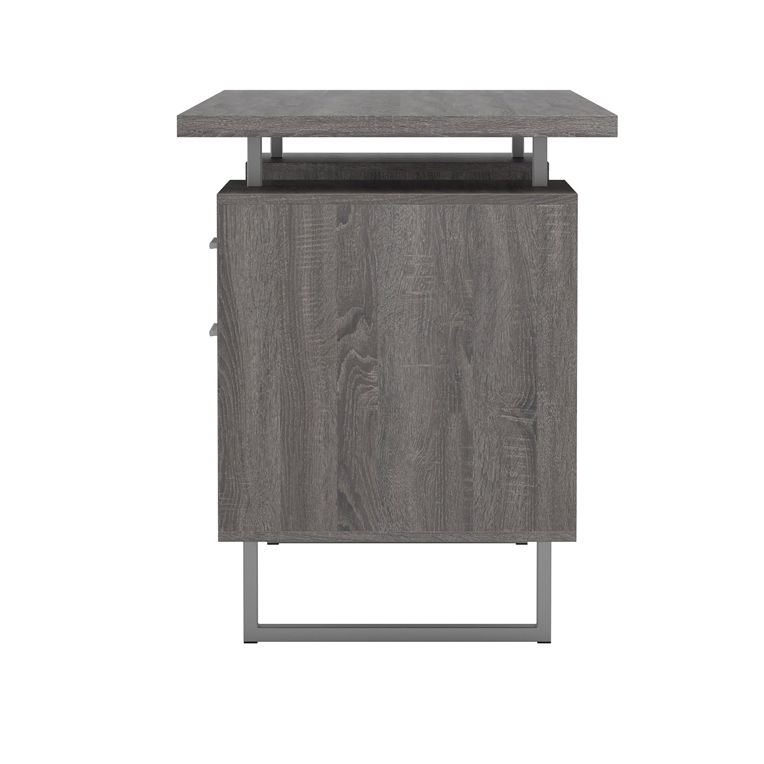 Set includes: One (1) office desk Materials: Metal, MDF, particle board and engineered laminate Finish: Weathered Grey and Silver Hardware finish: Silver Drawer: Euro Glides Available in weathered grey, aged walnut, and white high gloss finish options Under desk clearance: 28.75″
