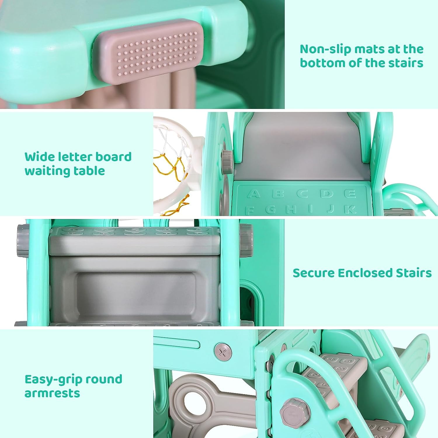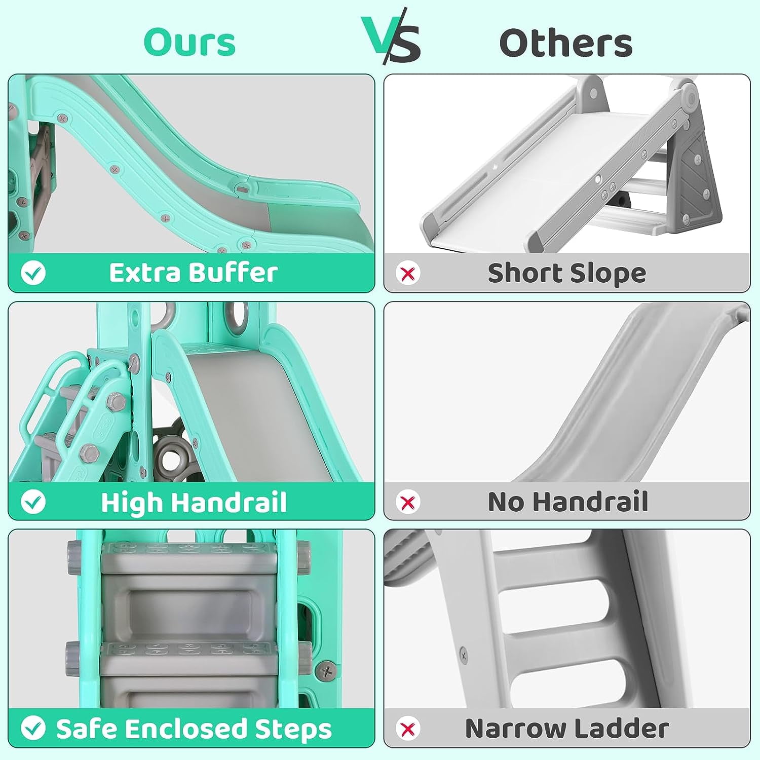 LAZY BUDDY is committed to providing children with professional, safe, and interesting products, accompanying them to learn and grow up happily. 4 in 1 toddler slide consists of a long slide, a climber with handrails, a basketball hoop, a ball, and a storage space for storing toys or snacks. Made of environmentally friendly and durable HDPE, this slide for kids is not easy to wear and deform allowing children to play without worry. Ideal indoor/outdoor playset for your little ones. LAZY BUDDY kids slide could be a great gift for your toddlers on birthday, holiday, Christmas or daily, suitble for children 2 years up. If you have any questions, please feel free to contact us, we do our best to provide you with a pleasant shopping experience. Specifications: Material: HDPE Net Weight: 18.47 LBS Overall Dimensions: 58”L x 20”W x 34”H Suitable Age: 2-7 years Load Capacity: 110 LBS Note: Please read the user manual and check the piece account before use. Please make sure to install and use on flat ground. Due to the shooting angle and light exposure, the color will be slightly off. Toddlers need parental companionship while playing.