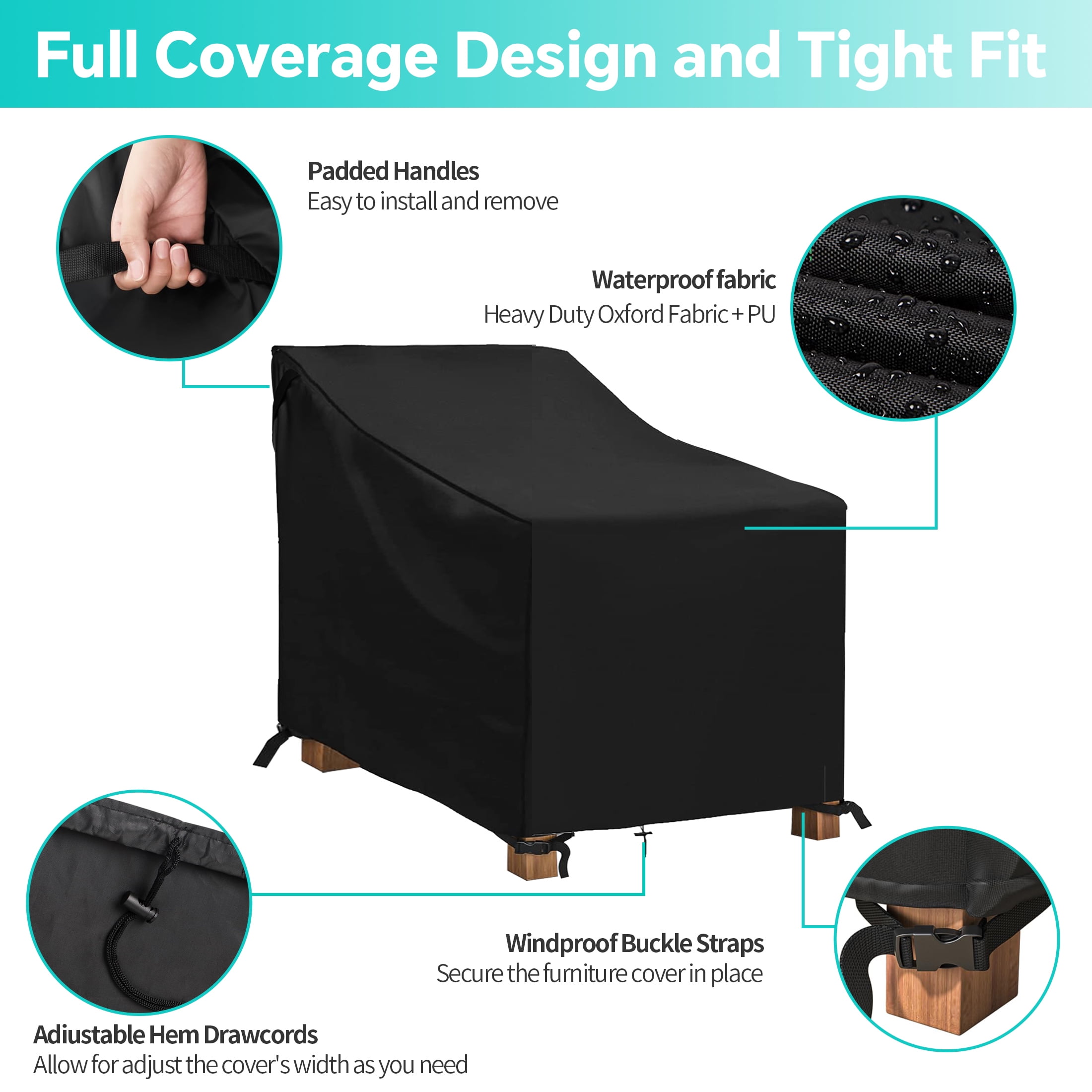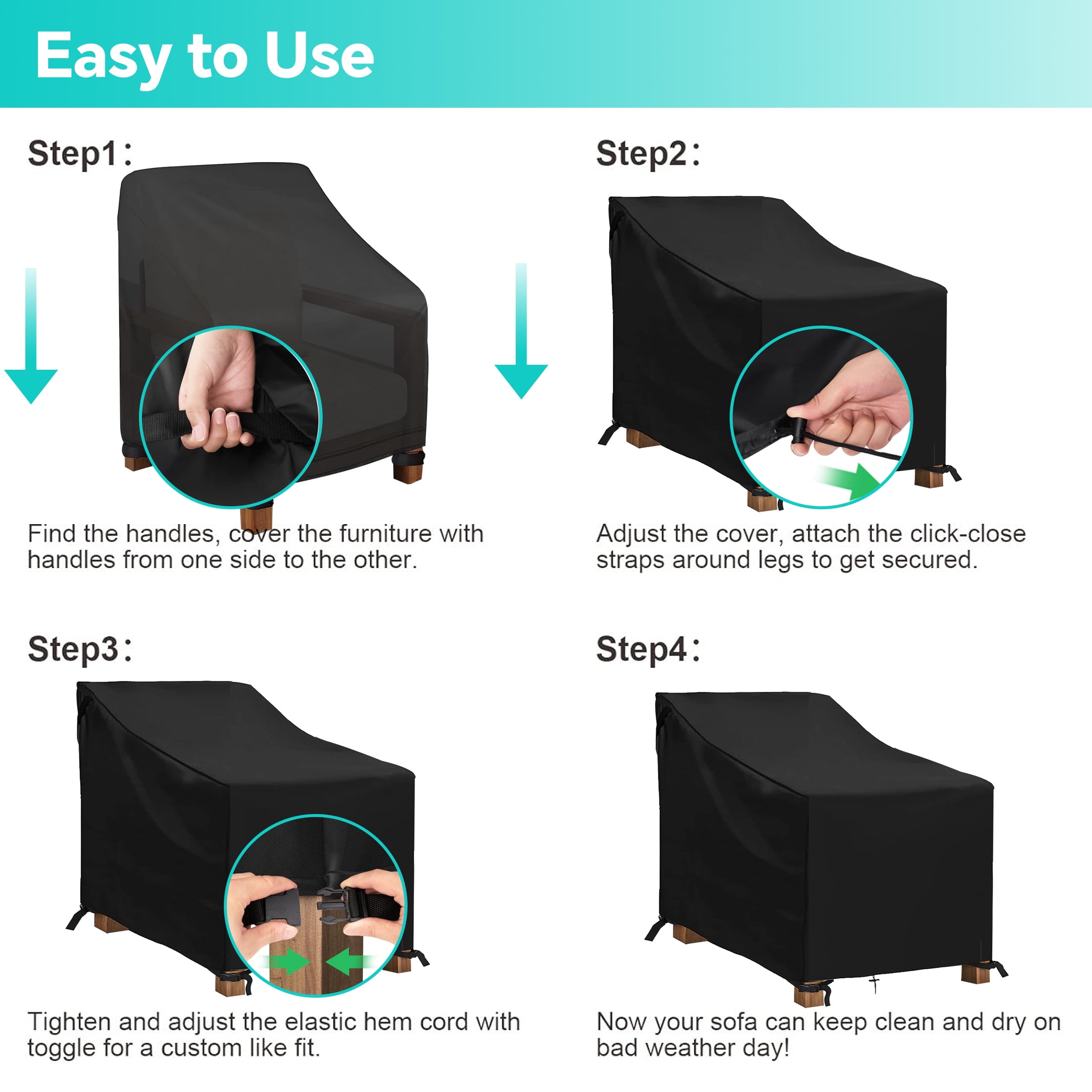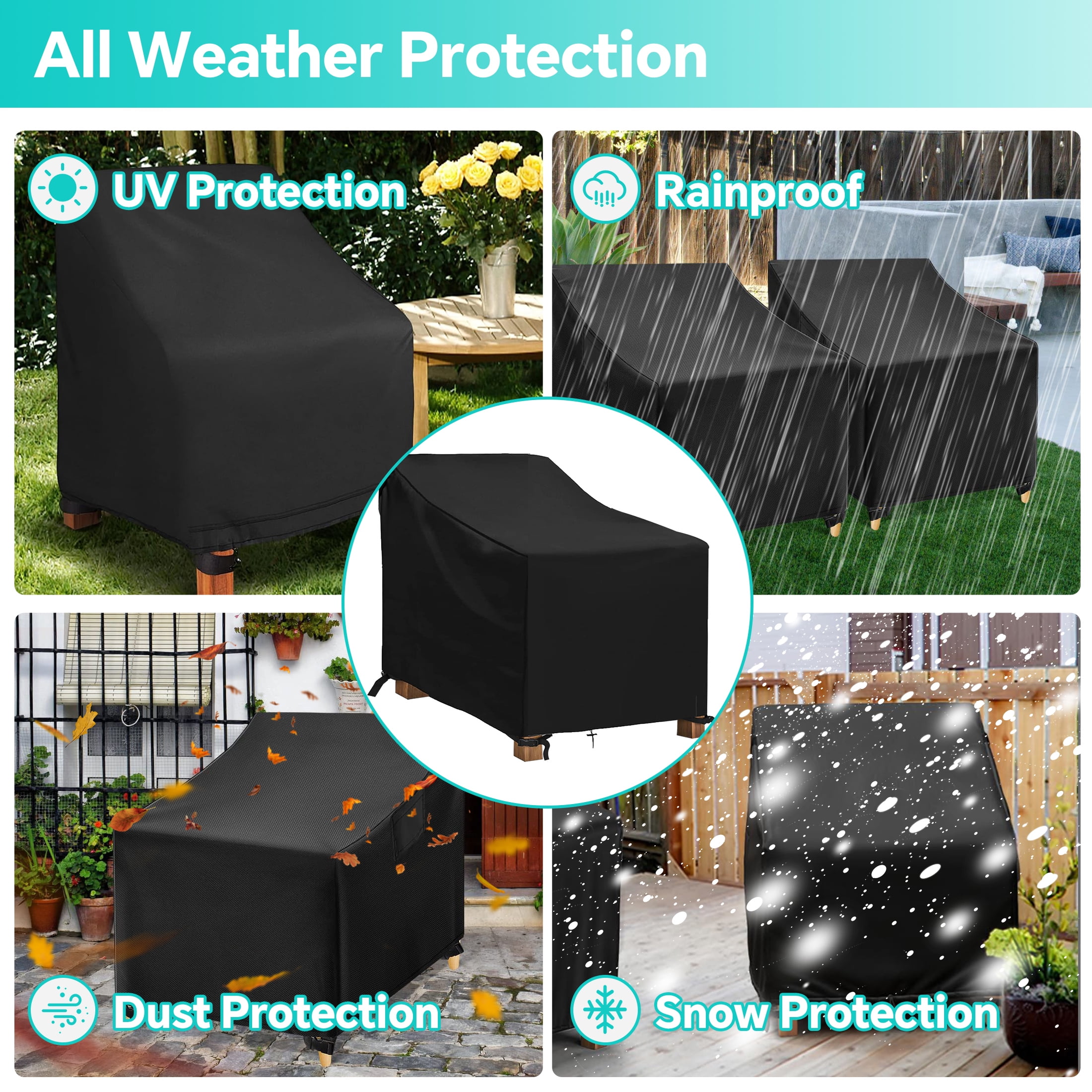 【Durable Outdoor Chair Covers】LCGOD outdoor chair covers measure 35 inches wide x 39 inches deep x 31 inches high and come in packs of 2 patio chair furniture covers. Please measure your chair carefully before purchasing. It is recommended to choose a cover that is 1-2 inches larger than the chair size. 【Waterproof and UV Resistant】The patio chair covers are designed with durable 600D waterproof Oxford fabric with an added PU waterproof coating that makes the covers UV resistant and 100% waterproof. In addition, the tape on the seams has been newly upgraded. It can protect your outdoor furniture from heavy rain, blizzard, hot sun and dust. 【All-Around Protection】Outdoor sofa cover with 4 sturdy snap-on straps and fitted drawstrings allow for a tighter and more even fit to prevent blowing away on windy days. These full-coverage designs protect your furniture from dust, sun, rain, bird droppings, and keep your sofa chair looking new all the time. 【Easy to Use and Clean】The lawn furniture covers come with padded handles that make it easy to put on and take off the cover. In order not to damage the waterproof surface of the cover and provide longer lasting protection, a simple wipe with a cloth will clean the smooth surface, machine washing is not recommended frequently. 【Package Content】Each package includes 2 black patio chair covers and 1 storage bag.