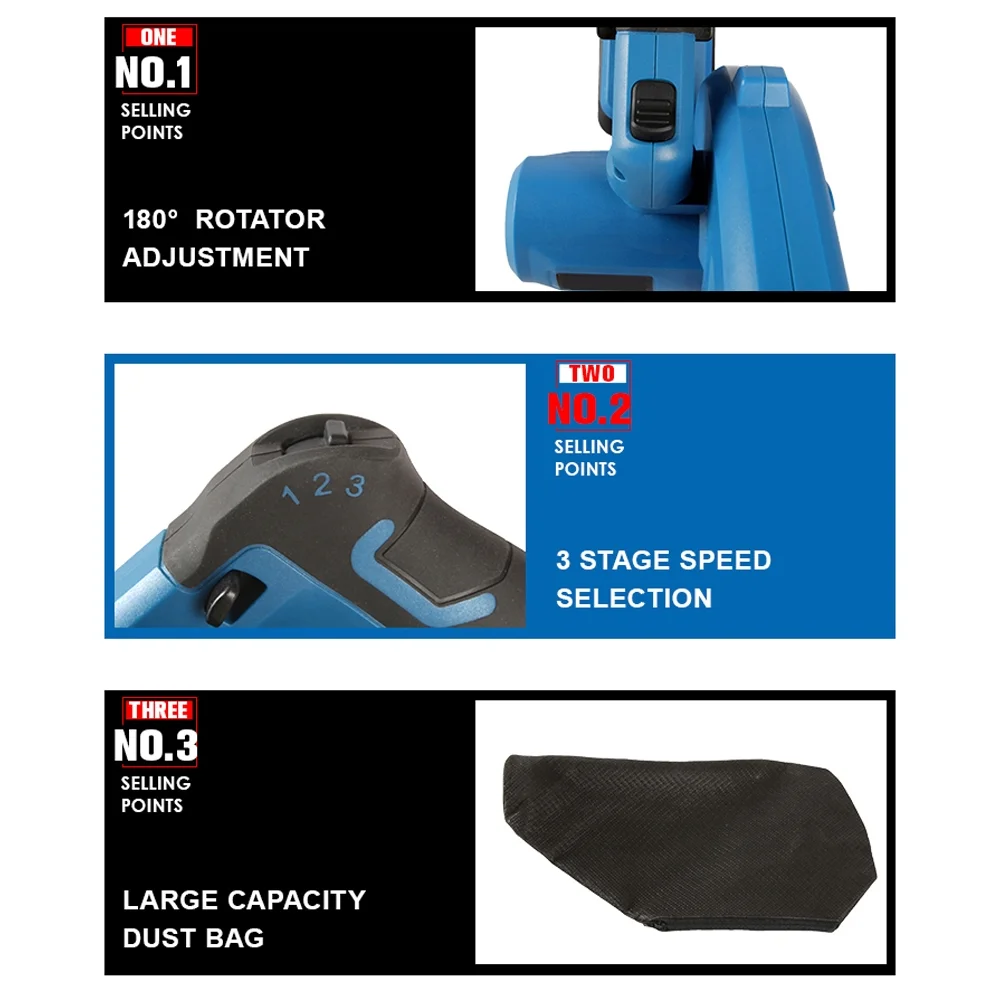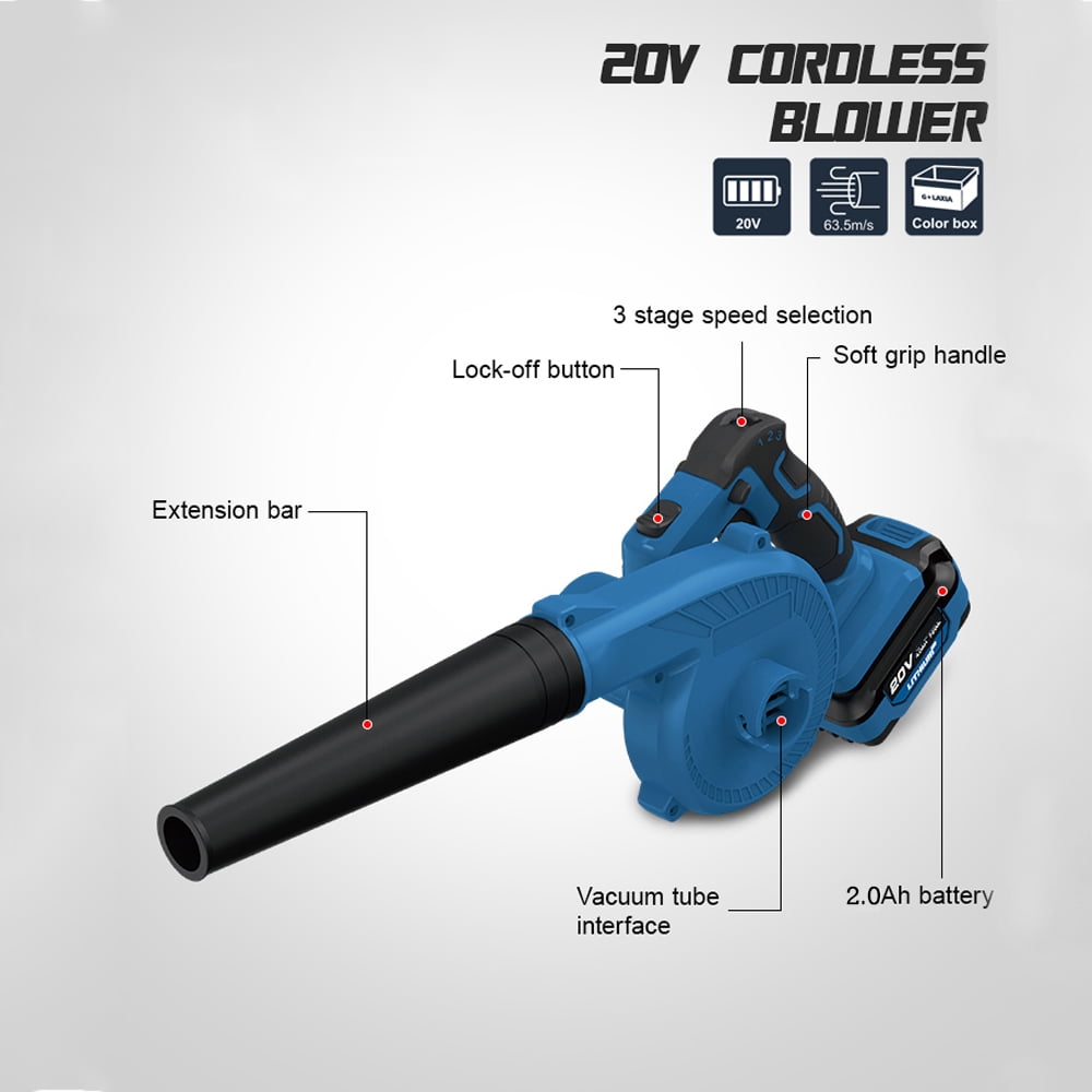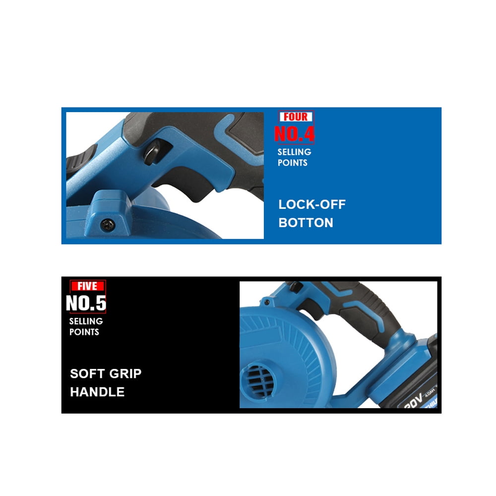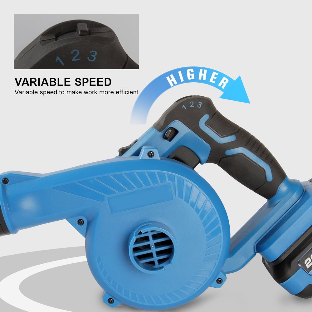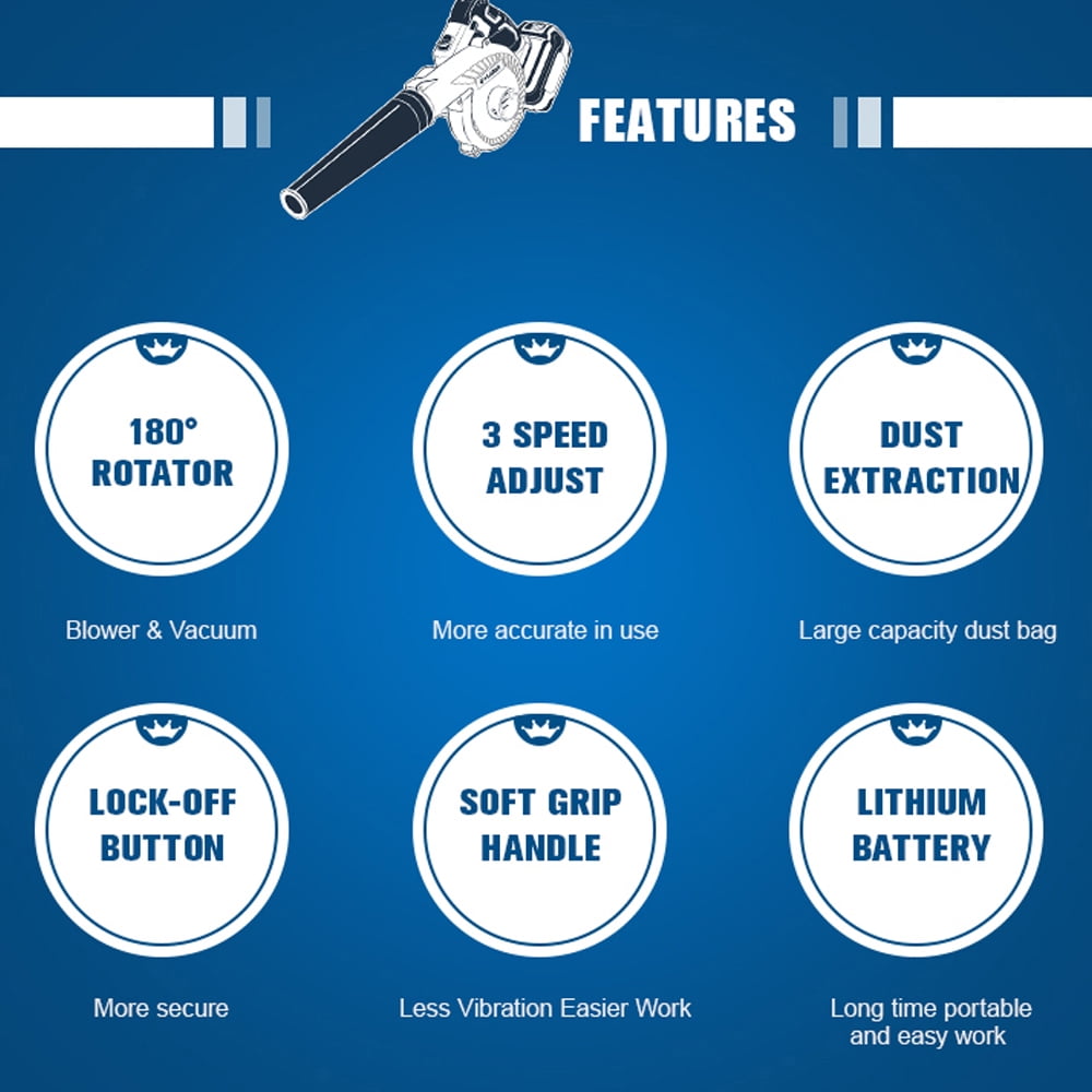 Air speed can reach 220 km/h, making it very powerful for good results when clearing an area. Compact and balanced design makes handling blower easy for added control. 2 in 1 design makes electric leaf blower & vacuum can be switched at will, just enjoy the flexibility and versatility of this cordless leaf blower. Use low or speed 1 for dusting off your tools, speed 2 for the countertops, and speed 3 for the shop or garage floor. It’s also easy to blow up wet leaves and make your garden keep clean after a rainy day. For tidying up jobsites, cleaning drill holes, and for other versatile applications.