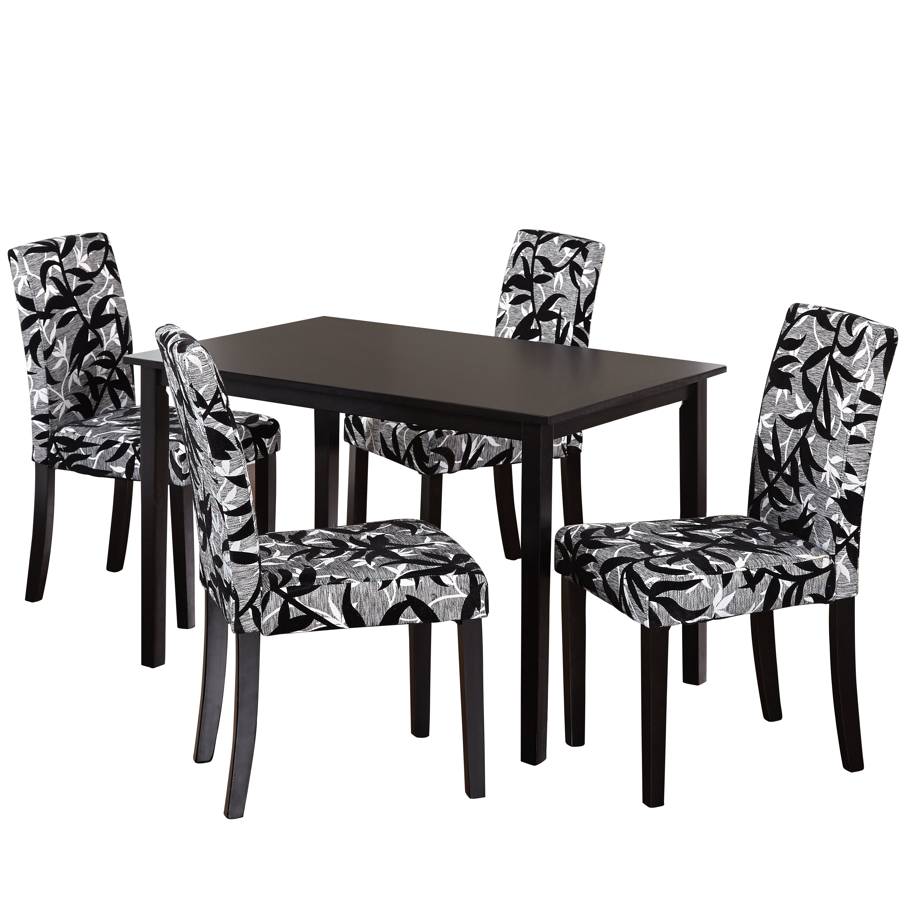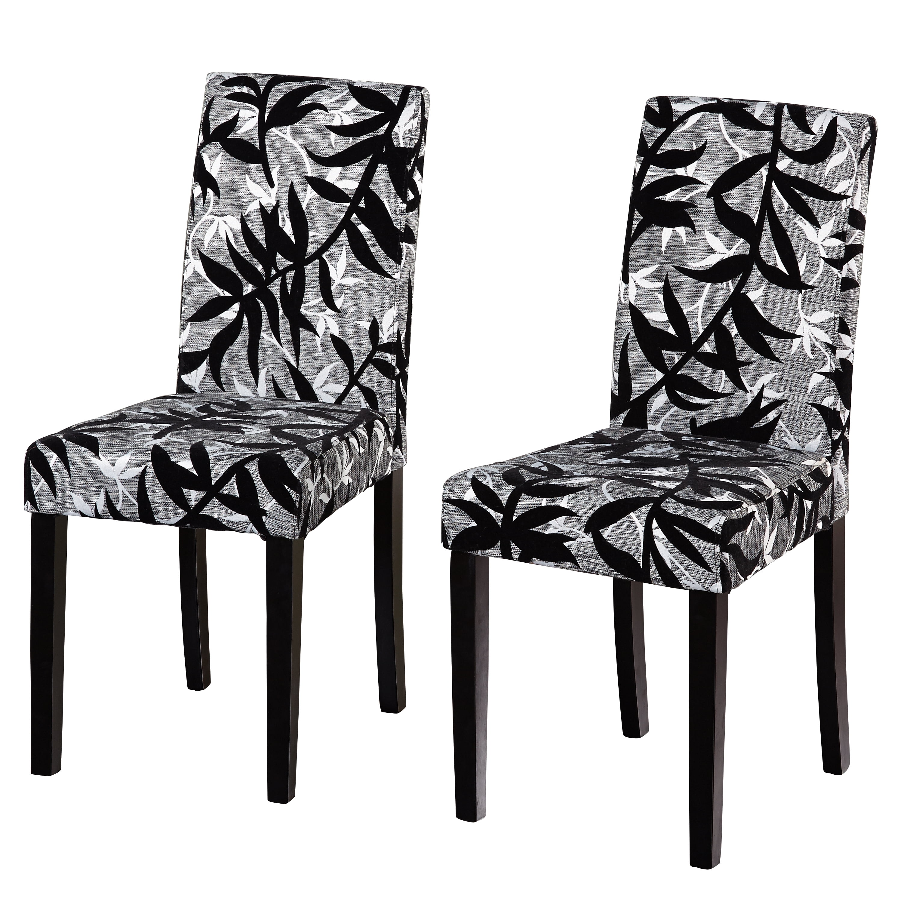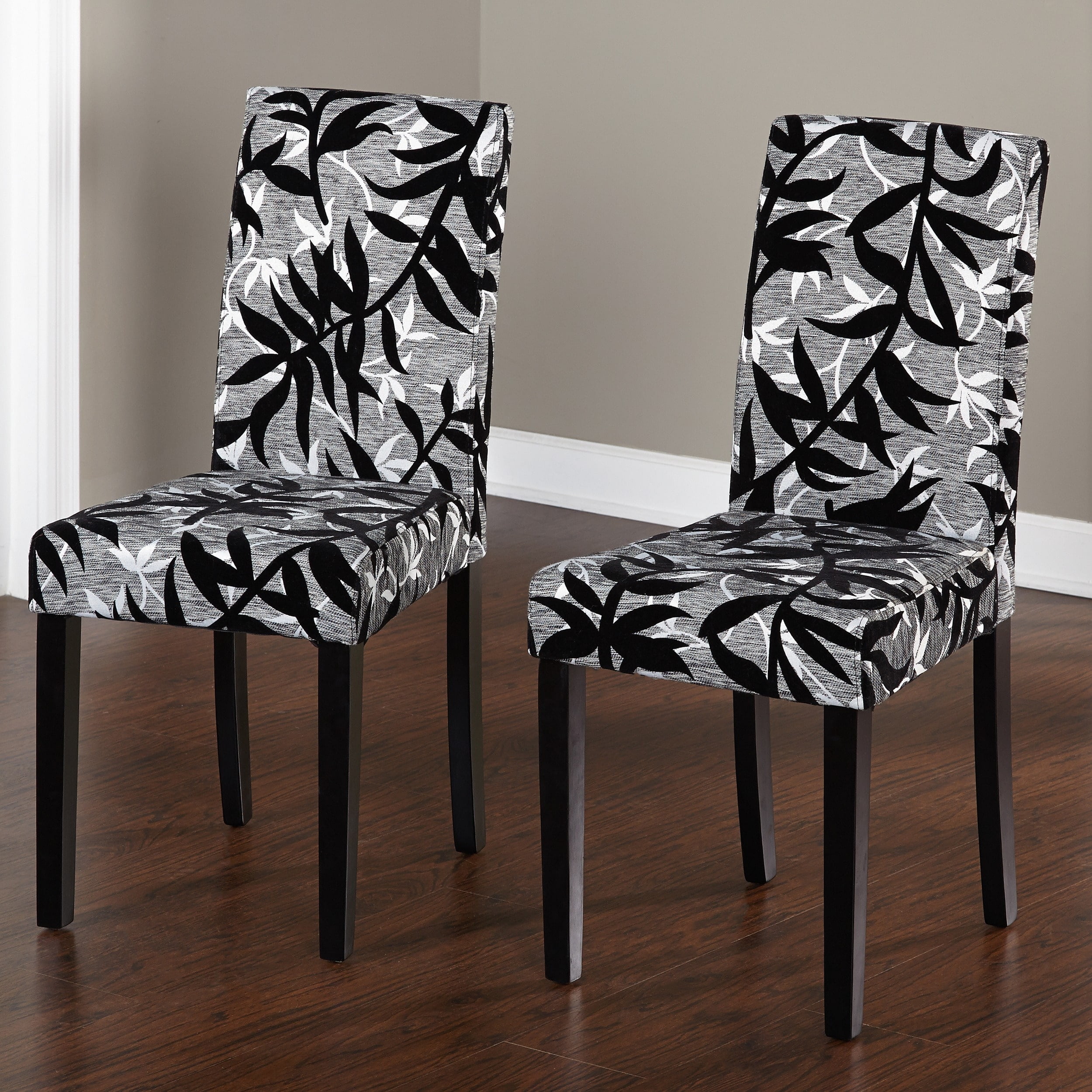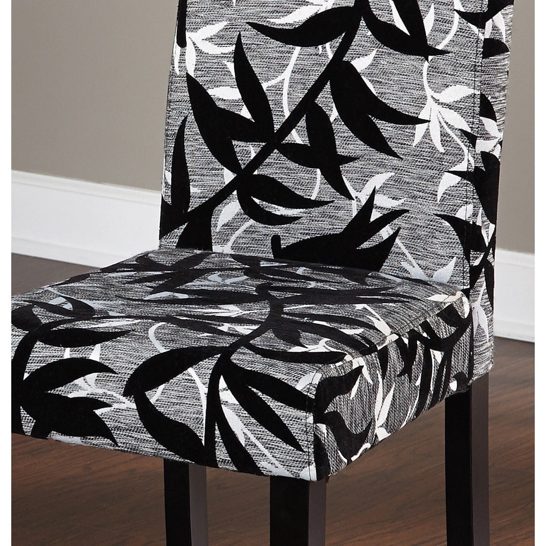 Add a touch of elegance and style to your dining area with these Parson rubber wood dining chairs. Featuring a bold yet classy black and silver leaf print, these rubber wood dining chairs complement a wide variety of modern color schemes. An ample 17 inches of sitting room and soft polyester foam upholstery fill allows diners to enjoy their meals in comfort. Set includes: Two (2) parson chairs Materials: Rubber wood and fabric Finish: Black Upholstery materials: Fabric Upholstery color: Light grey with black and silver print Upholstery fill: Polyester foam Seat dimensions: 16.75 inches wide x 16.5 inches deep Seat height: 18 inches Dimensions: 36.5 inches high x 16.75 inches wide x 21.5 inches deep Assembly required Please note: This item does not ship to Hawaii or Alaska.