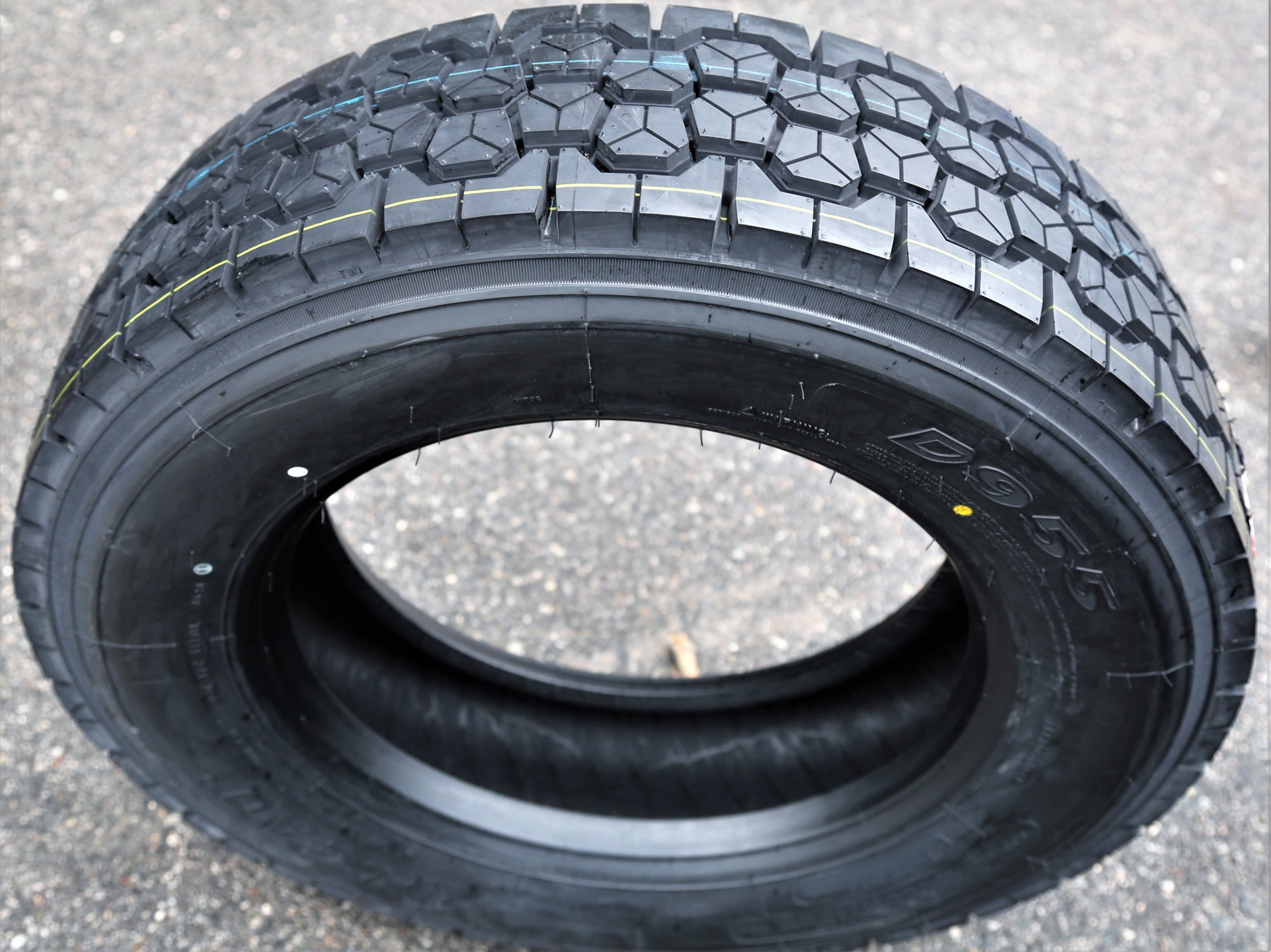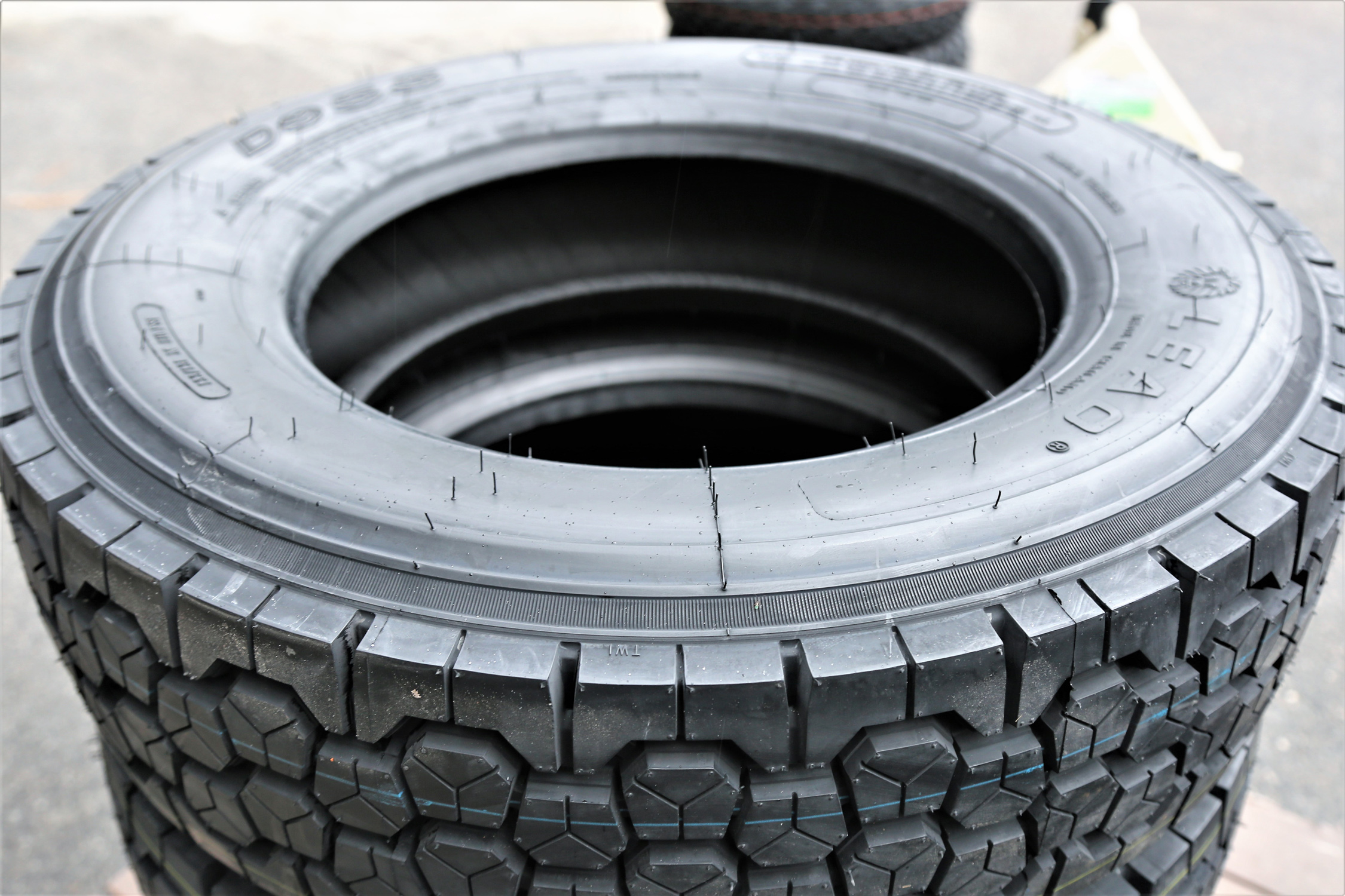 Leao D955 FEATURES AND BENEFITS All weather traction Upgraded durability Longer lasting tread life OVERVIEW The Leao D955 is a highway terrain, all season tire manufactured for commercial vehicles. It was made to be mounted on the vehicle’s drive axle. The tire promotes great all weather traction. The detailed tread pattern features larger center tread blocks and closed shoulder tread block placement. These tread elements increase the grip on the dry, wet and winter weather road surface to improve the year round driving safety. They enhance the number of biting edges gripping the road surface, boosting the model’s performing ability. The wide groove pattern avoids hydroplaning. These grooves disperse water and slush from below the footprint and resist hydroplaning to offer a secure wet and winter drive. The tread design and durable compound help lengthen the usability. The stronger compound features wear-resistant rubber materials which decrease the tread wear rate significantly. The stabilized tread elements actively avoid tread flexing while the tires are in motion. This resists unnecessary friction being created between the tire and the road surface, while allowing the tire’s even pressure distribution. As a result, the model prevents accelerated and irregular wear along the tread area, extending the usability and tread life. The D955 upgrades the durability. The strengthened steel belt structure maintains the ideal tire shape under the load and driving pressure affecting the model. This guarantees the model’s heavy-duty load capacity as it securely carries and withstands the weight of the load affecting the model. The stronger structure also protects the tire against damage. It resists punctures, cuts and other damage from harming the casing and shortening the model’s service life. Manufacturers recommend changing tires every 10 years. As long as tires are properly stored before they are sold, the year of their manufacture will not shorten their service life.