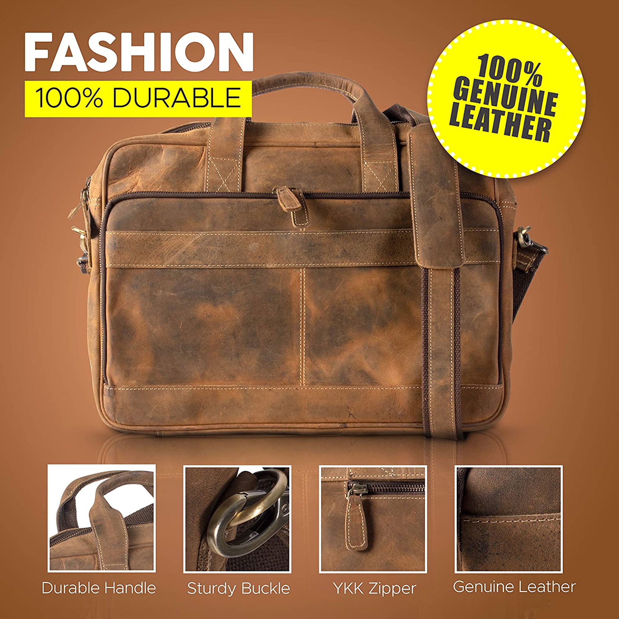 PREMIUM BUFFALO LEATHER AND YKK METAL ZIPPERS: Unlike Other brands which use Faux or PU leather, KPL bags are made from Premium Top Grain Water Buffalo Leather and are made by Experienced Craftsmen. And all Metal Zippers used on this bag are YKK brand which is one of the most reputed in the world. TROLLEY COMPATIBLE: Our bag comes with a trolley Compatible strap so you just relax and strap it to your suitcase while at the airport or travelling. SLEEK MULTIPURPOSE DESIGN: With a size of 18-inch width, 13-inch height and 4-inch depth. This bag fits your laptop and other accessories without looking too Bulky on the go. The bag can be used as a briefcase, Laptop messenger bag, School college office satchel. MULTIPLE SECTIONS: With Multiple Internal sections for Cell Phones, a Calculator, Slots for cards, pens and Zipper compartments including one internal and one back zipper, you can organise your stuff as you like. WARRANTY: A perfect gift for any occasion like Christmas, Valentine. Birthday’s Anniversaries and any occasion that calls for a gift, this bag come with a one-year replacement warranty.